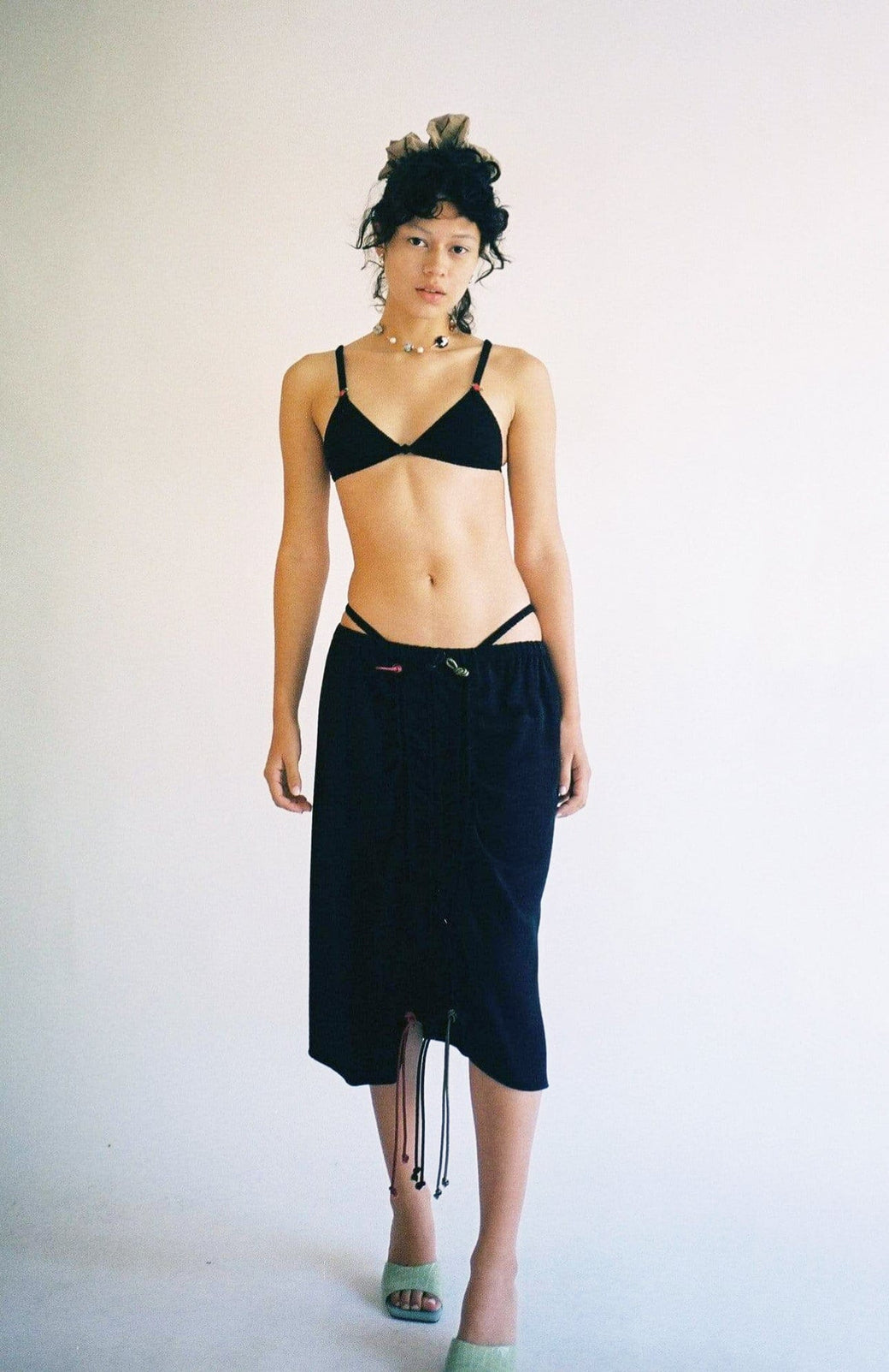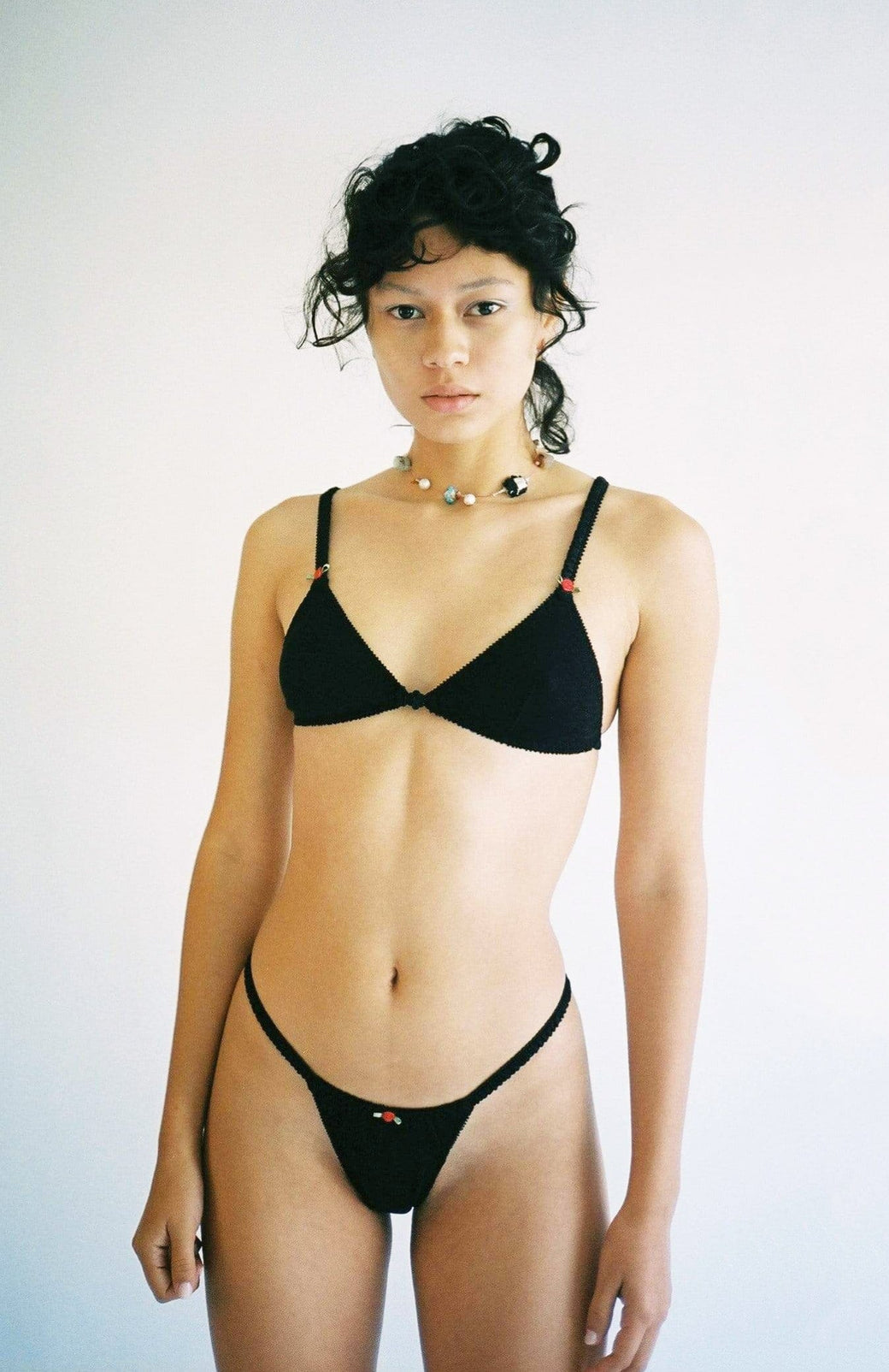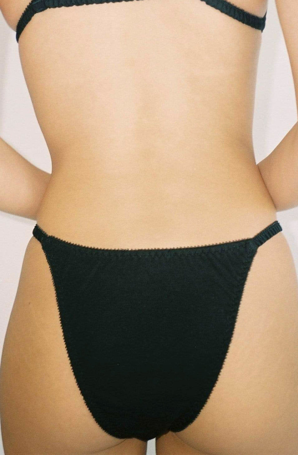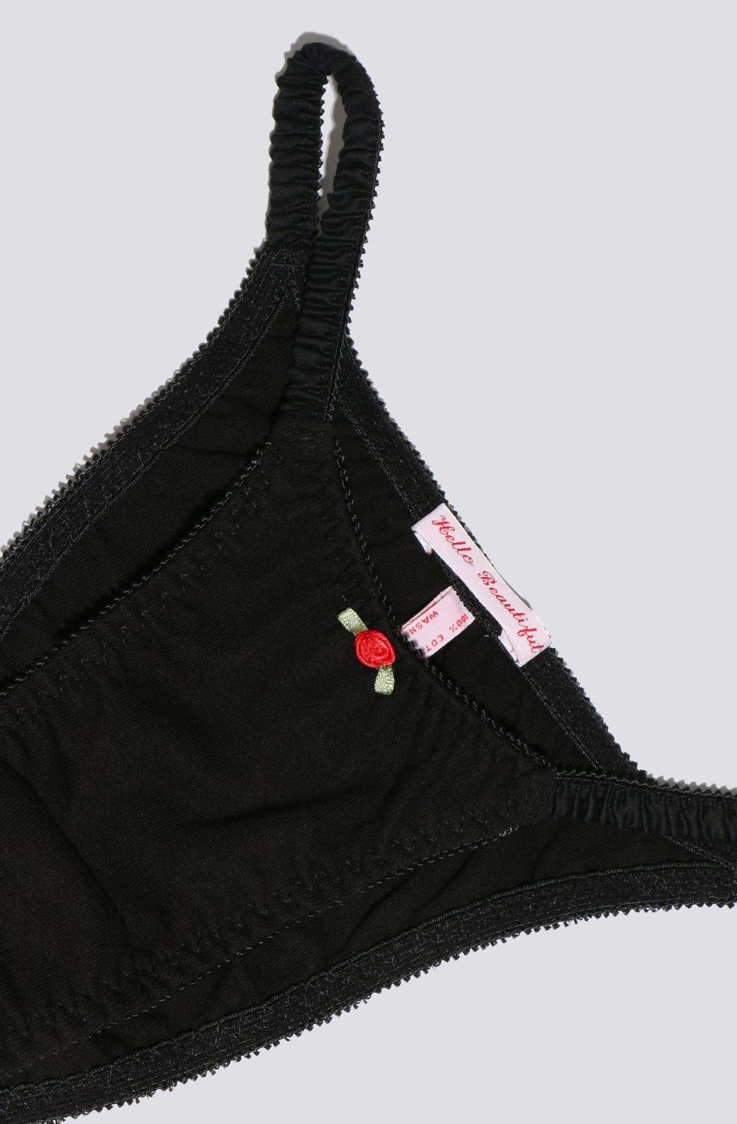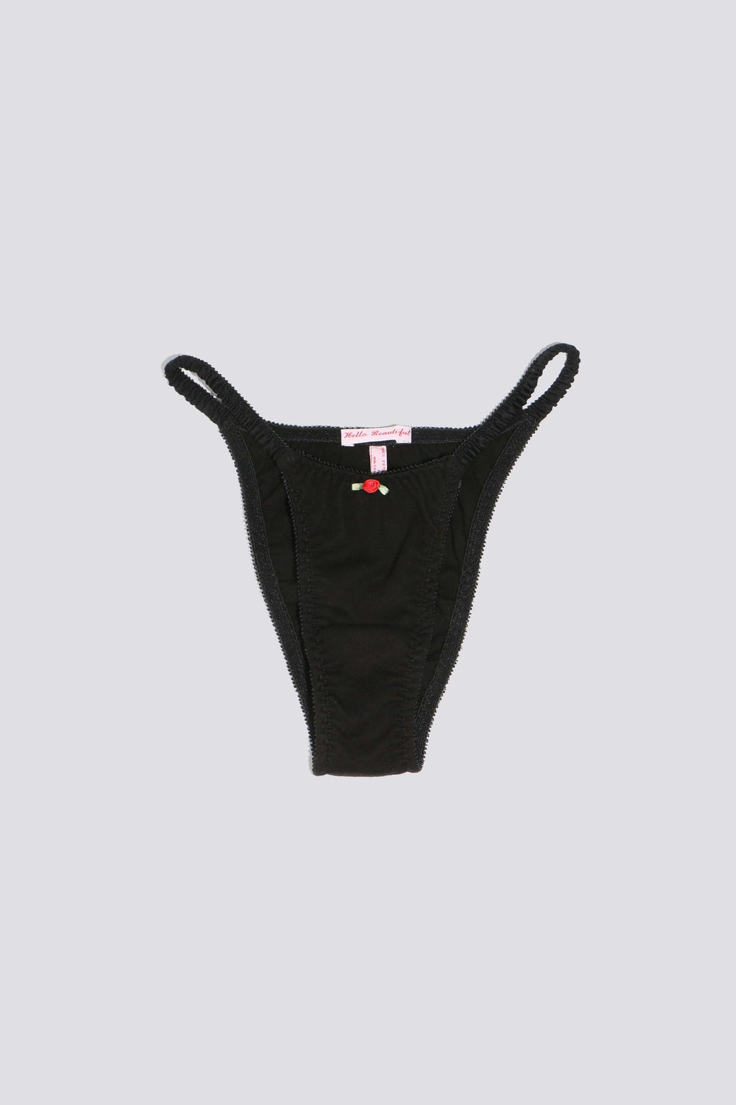 Inspired European cuts. The Hello Beautiful, black cotton, romance string panty, is made with 100% combed baby rib- knit cotton, made in California. Body of panty is set with old- fashioned zig- zag stitching and plush picot-edge elastic. Red satin rosette appliqué with green leaves is sewn center front of the panty, for a little romance. Delicate, feminine, pure cotton lingerie, designed to enhance your natural beauty! Worn as a complete set with the black romance bra.