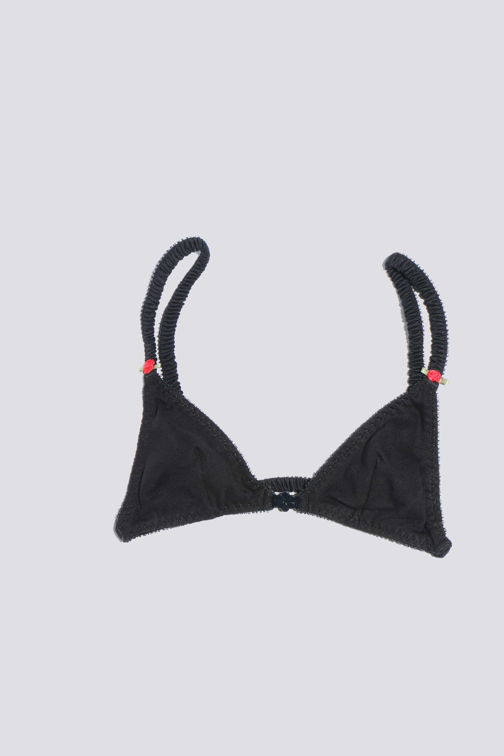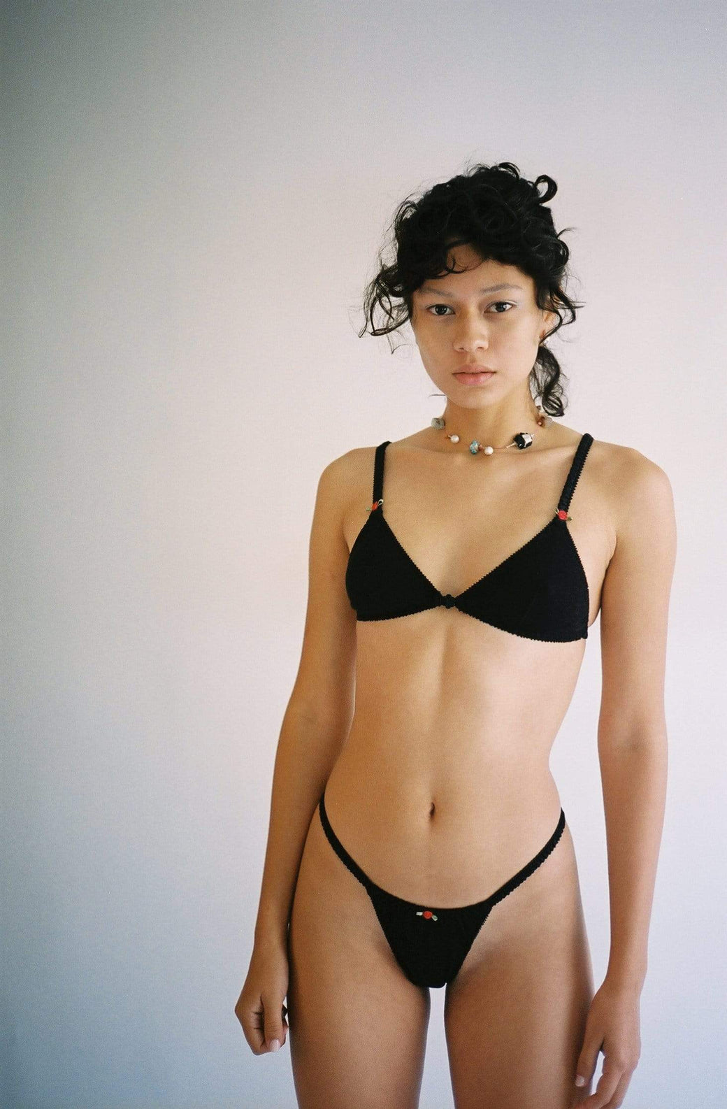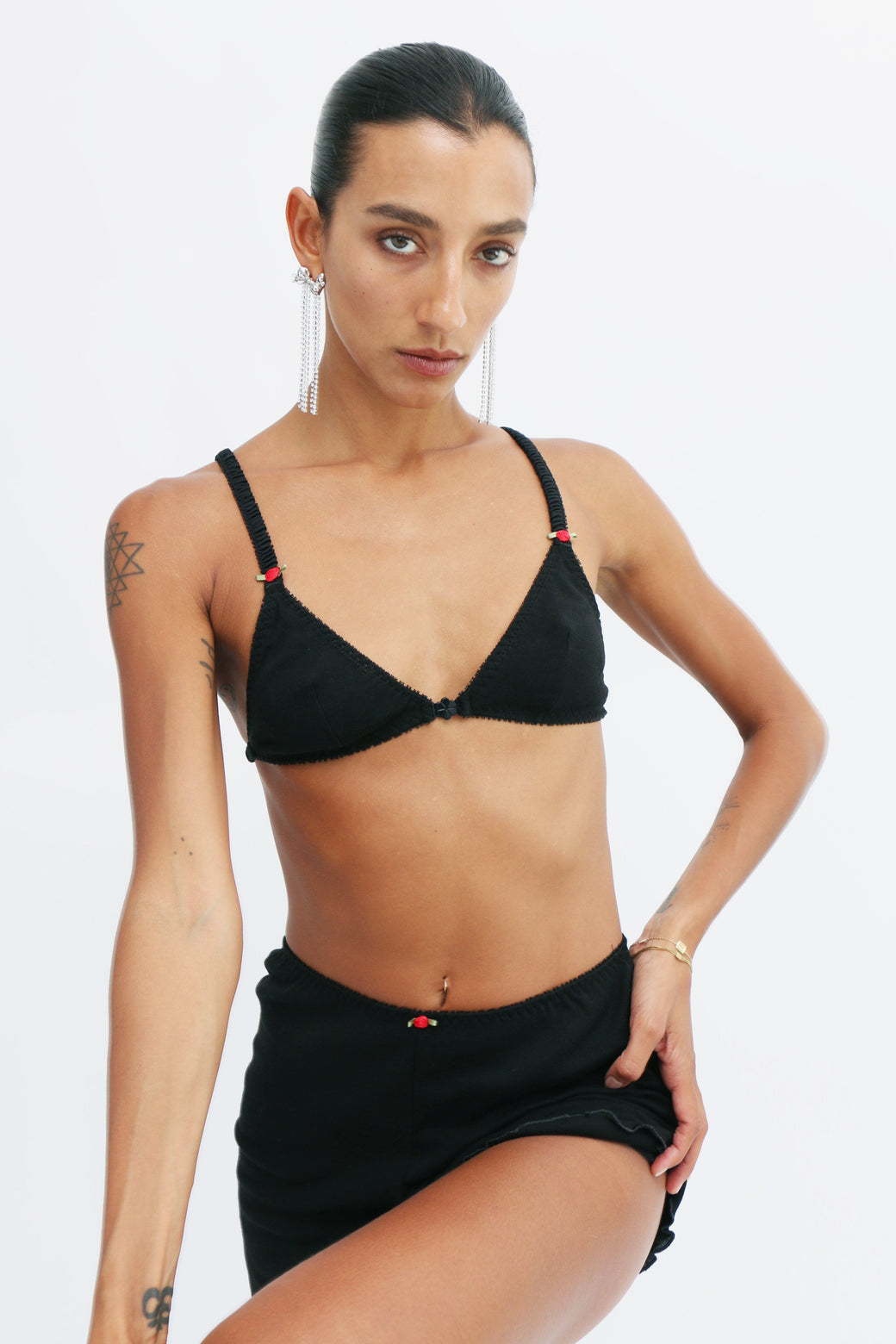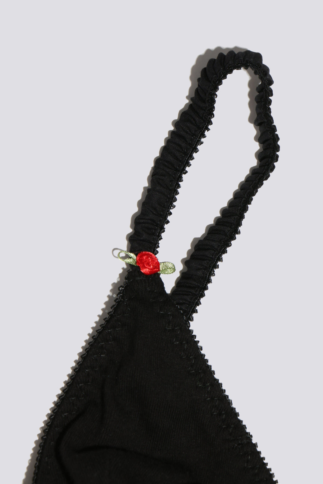 Soft cup triangle bra. Front hook closure. The Hello Beautiful black cotton romance bra is made with 100% combed baby rib-knit cotton made in California. Bra cups are set with old- fashioned zig- zag stitching and plush picot-edge elastic. Two red satin rosette appliqués with green leaves are placed on the front of the bra for a little romance. Worn with the matching Romance String Panty.