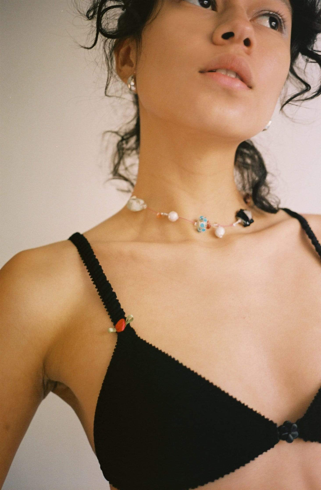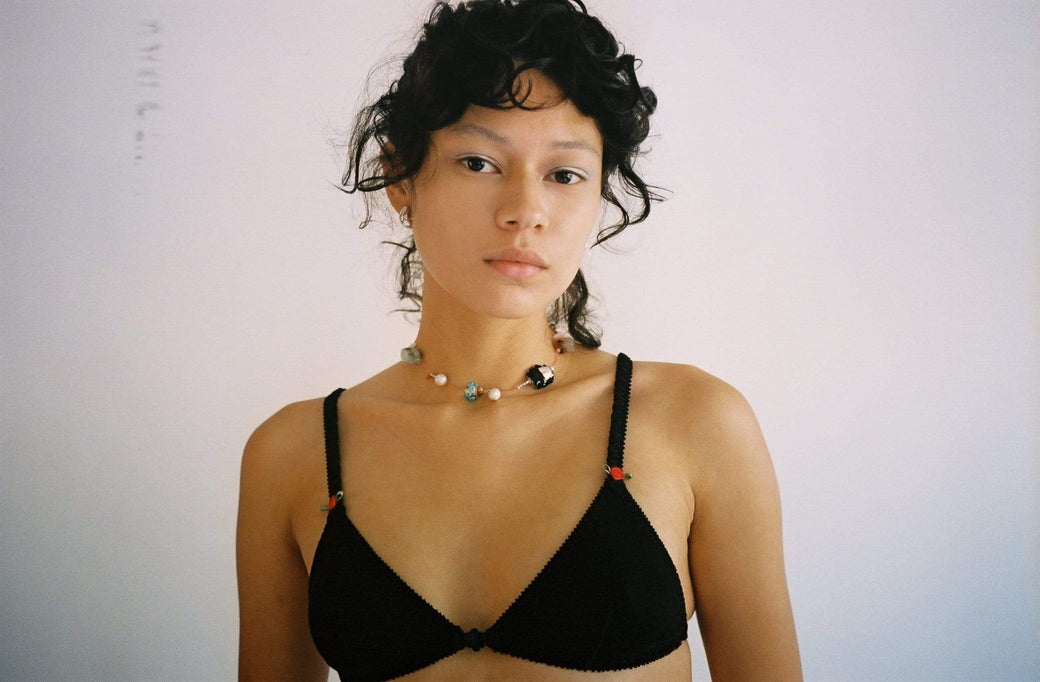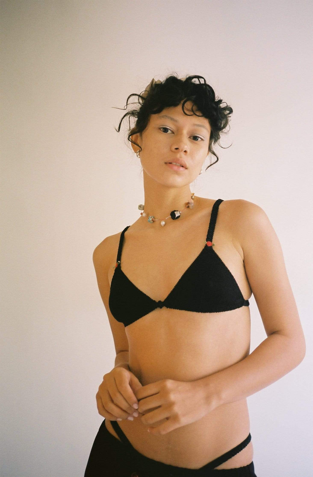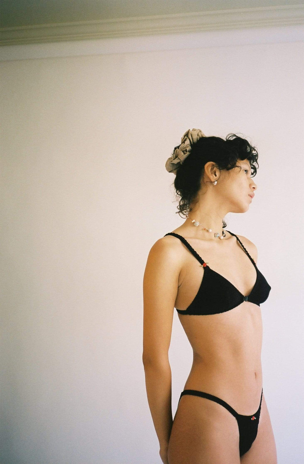 Soft cup triangle bra. Front hook closure. The Hello Beautiful black cotton romance bra is made with 100% combed baby rib-knit cotton made in California. Bra cups are set with old- fashioned zig- zag stitching and plush picot-edge elastic. Two red satin rosette appliqués with green leaves are placed on the front of the bra for a little romance. Worn with the matching Romance String Panty.