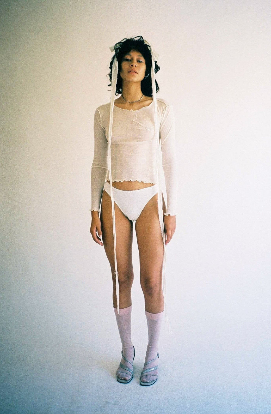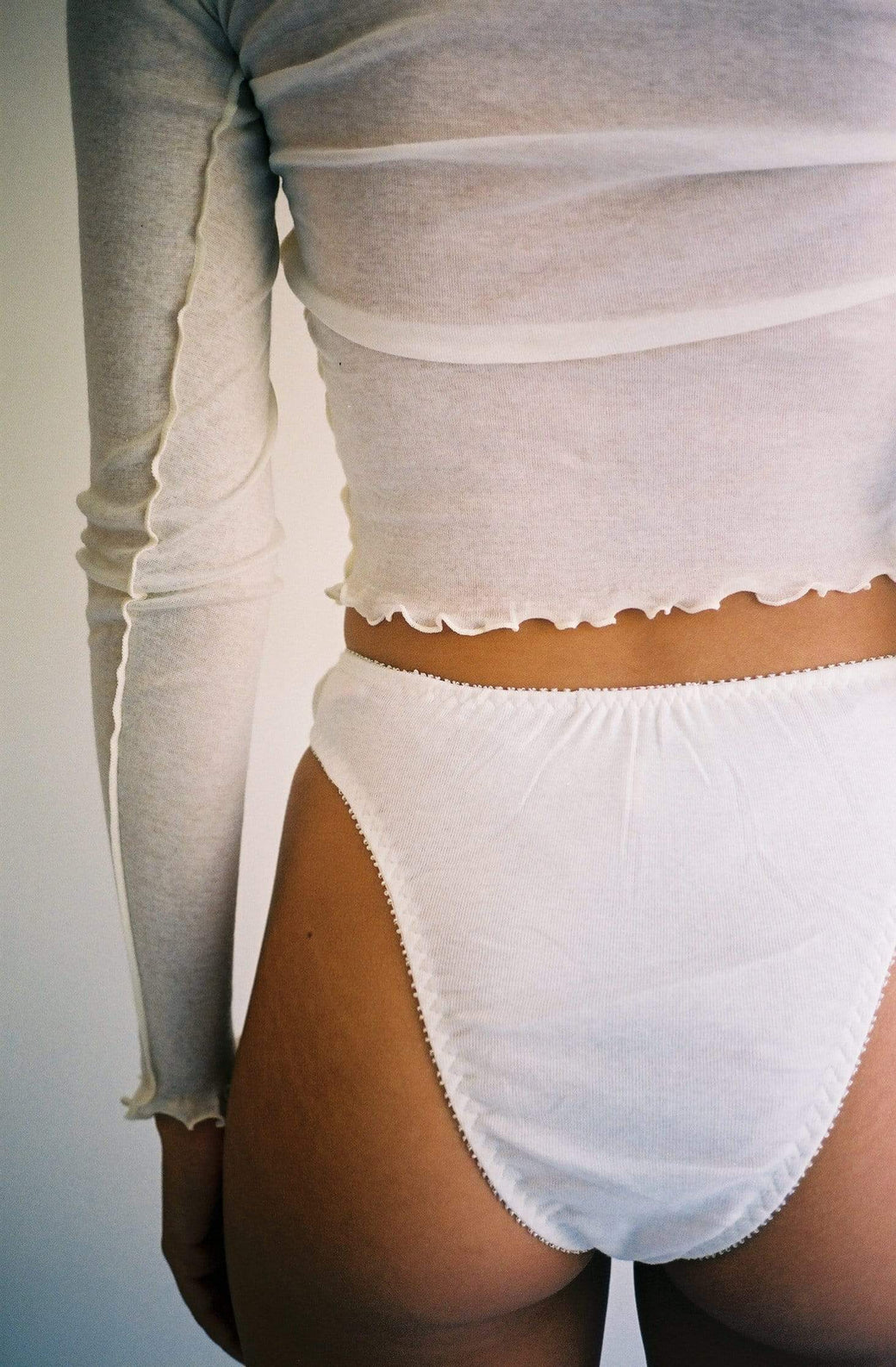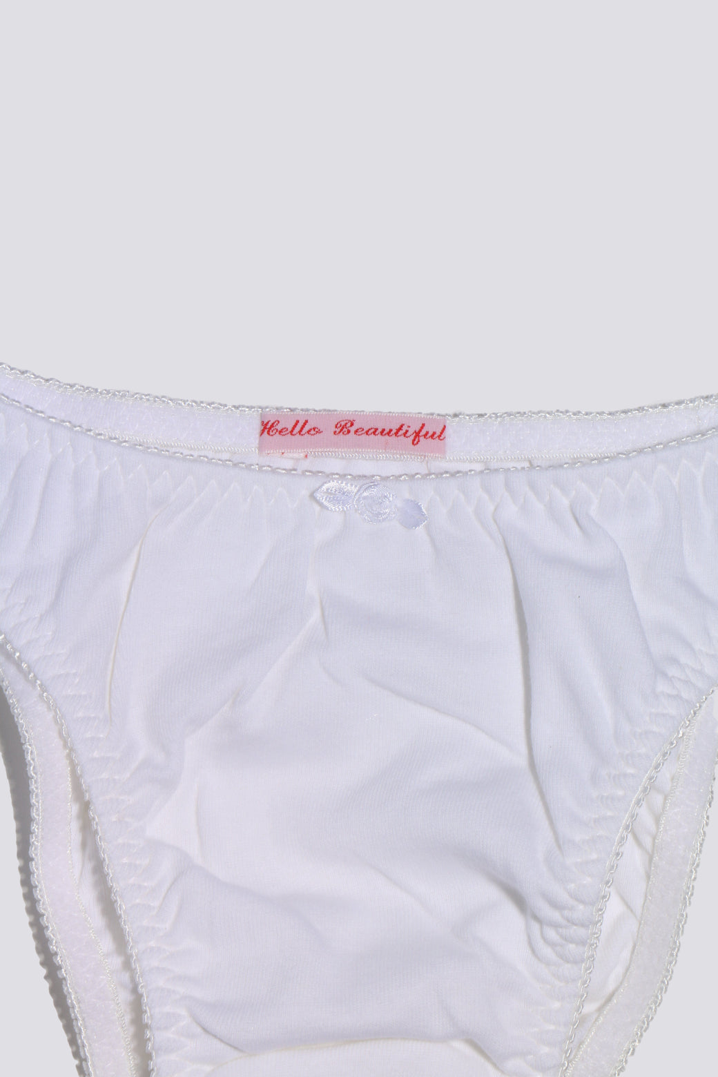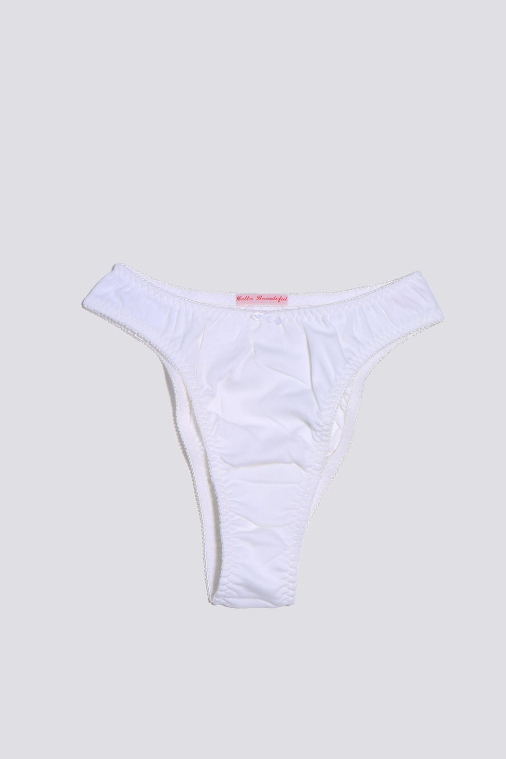 Inspired European cuts. The signature Hello Beautiful panty is made with 100% combed baby rib- knit white cotton, made in California. Delicate plush picot-edge elastic, is set with old- fashioned zig- zag stitching and finished with a satin rosette sewn center front. Designed to sit on the natural waist, the body is sculpted by the shape of the underwear. Narrow coverage on back frame.
