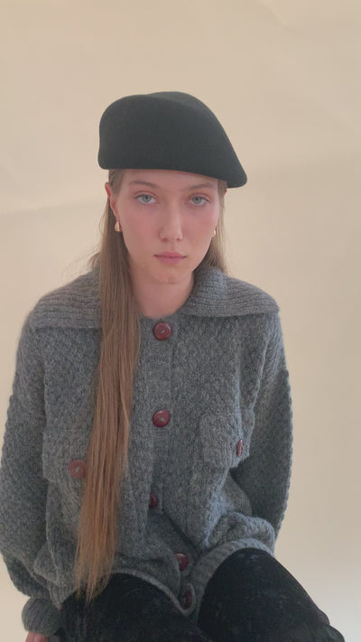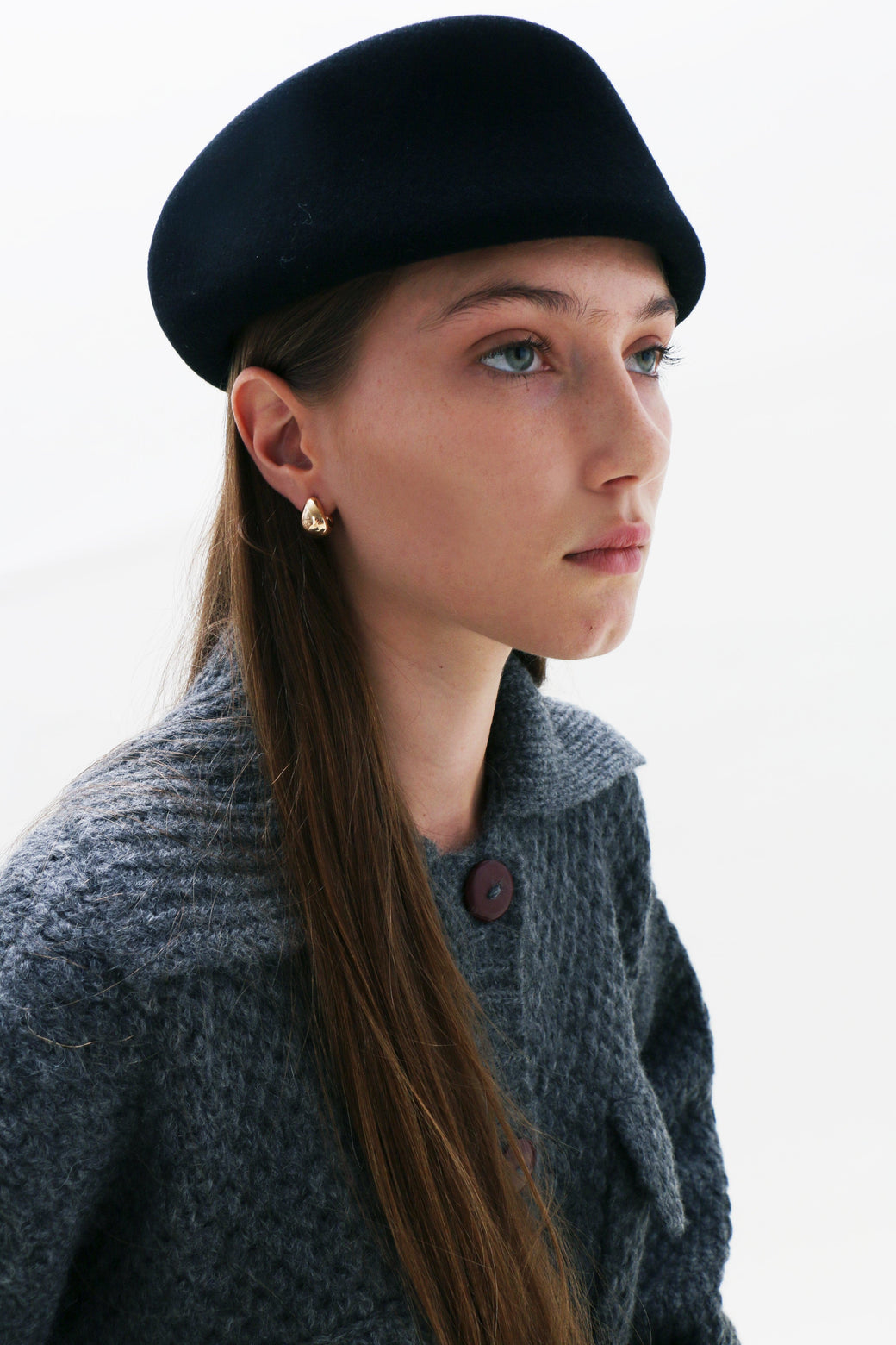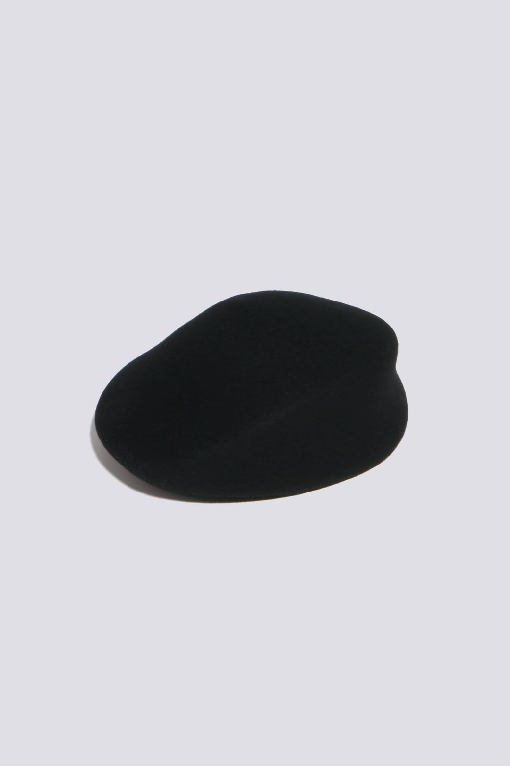 Structured beret, designed to be worn at multiple angles. Made from black felted wool.