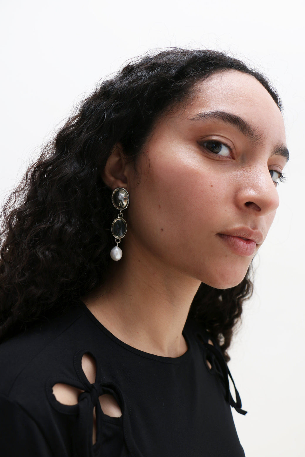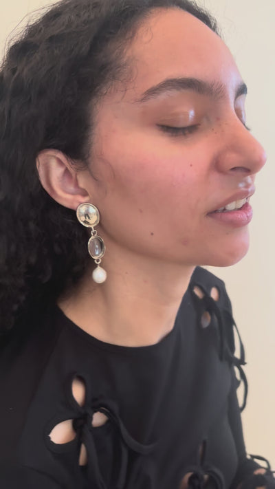 Pair of white bronze earrings with glass stone crystal and baroque pearls suspended.
