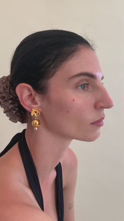 Flower with glass insert and suspended pomegranate motif. 18k gold vermeil with sterling silver ear post.