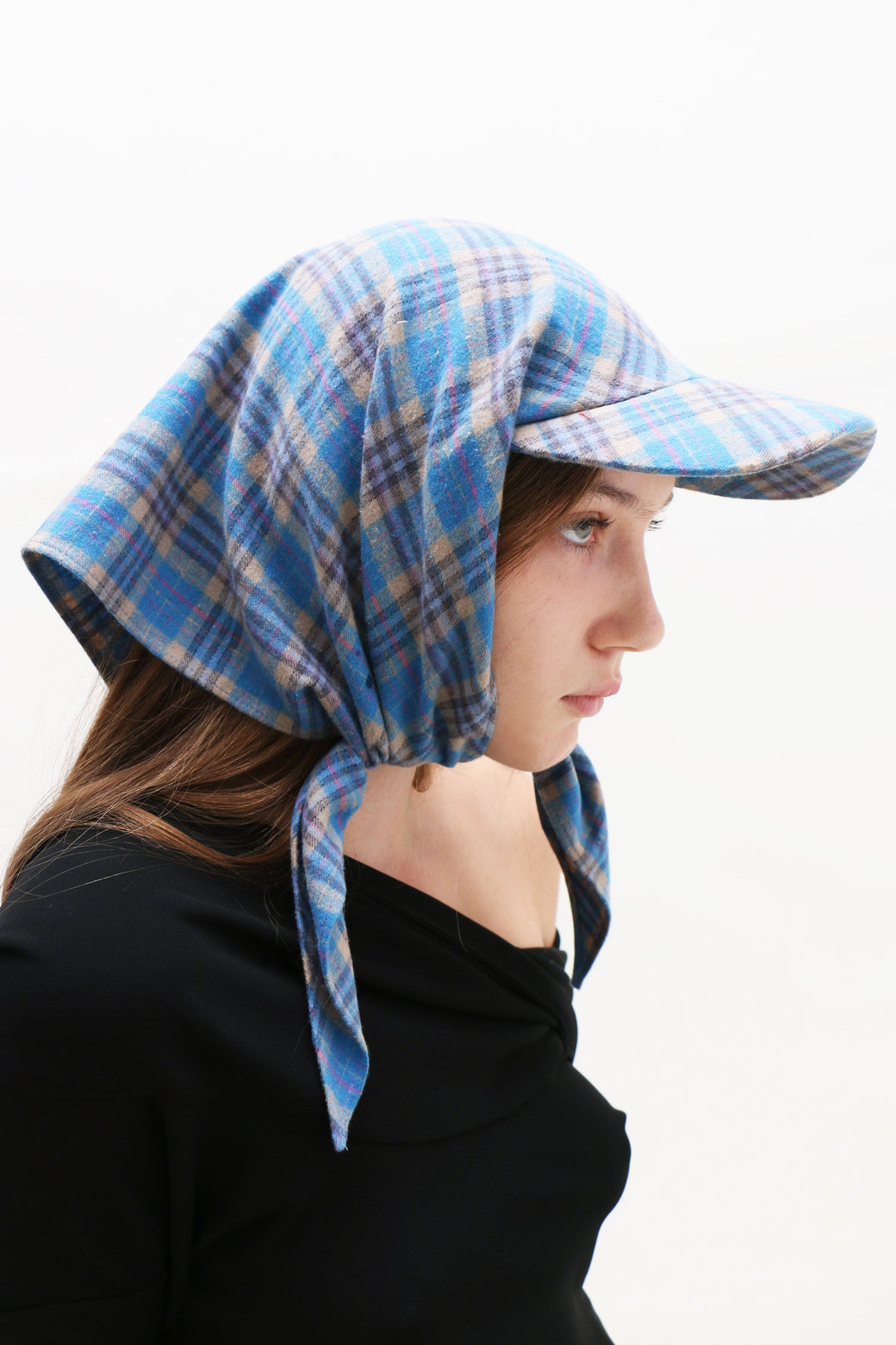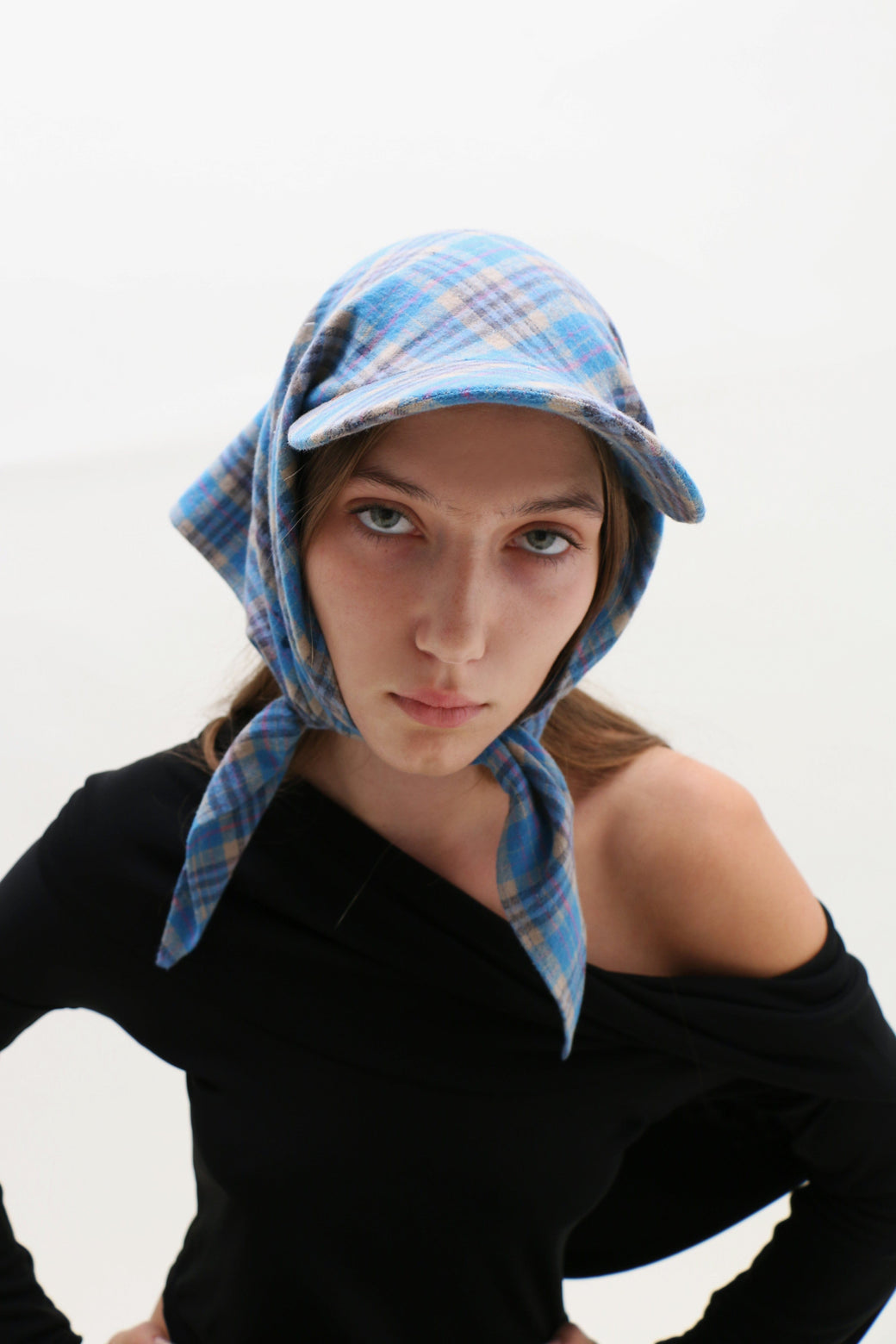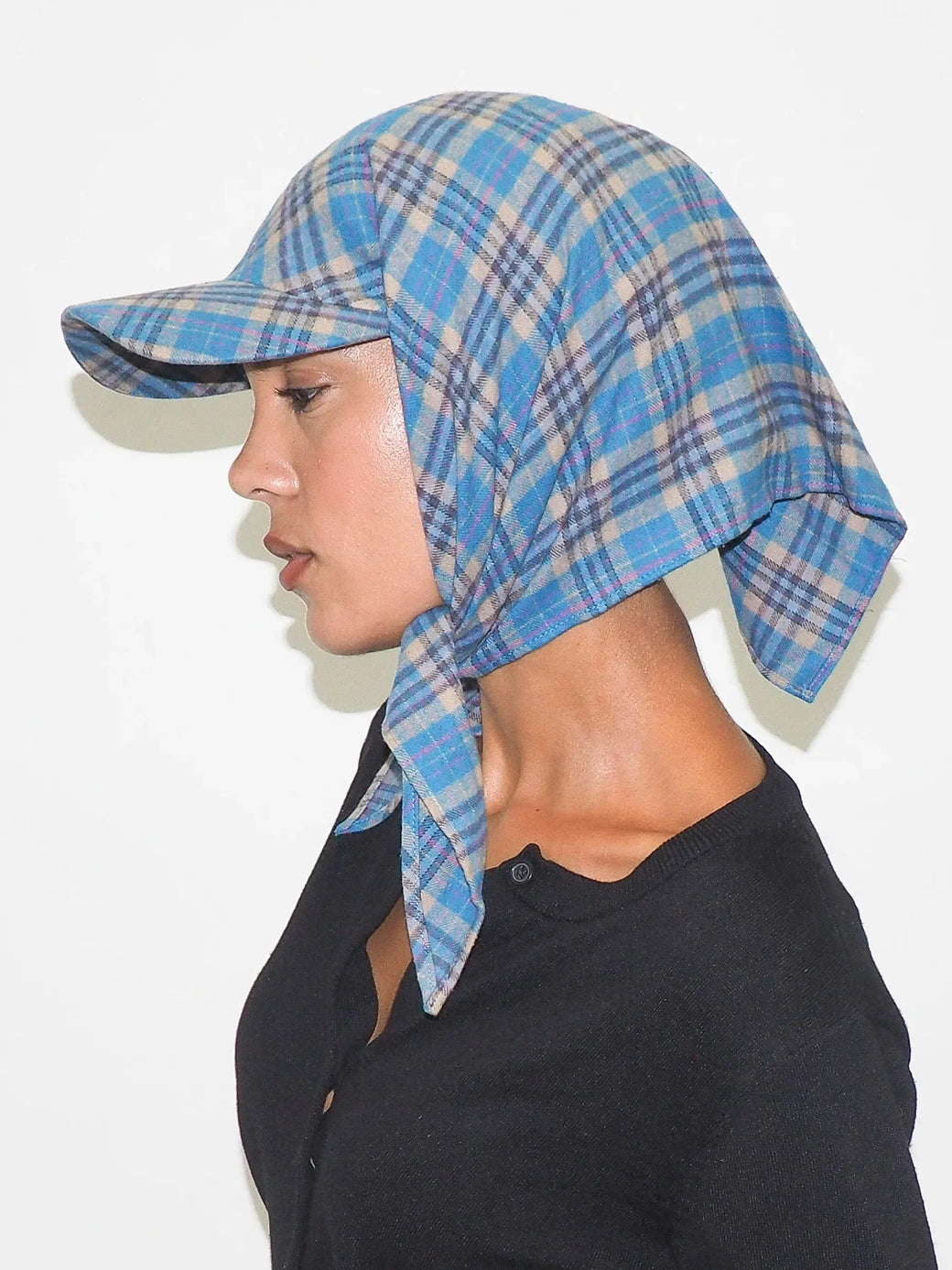 An updated take on Clyde's viral Brim Scarf, now in plaid blue and pink. Cut slightly larger for fall and winter, made from warm, weighty 100% cotton flannel. Wear it under the chin, behind the neck, or tied like a ballcap, shifting with whatever the day calls for.