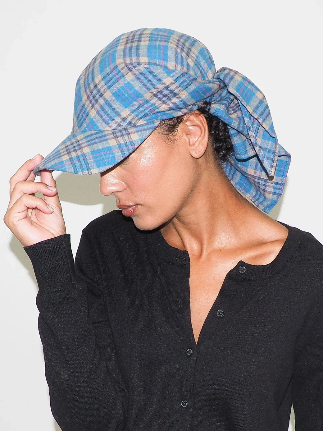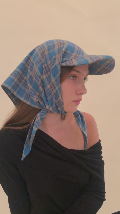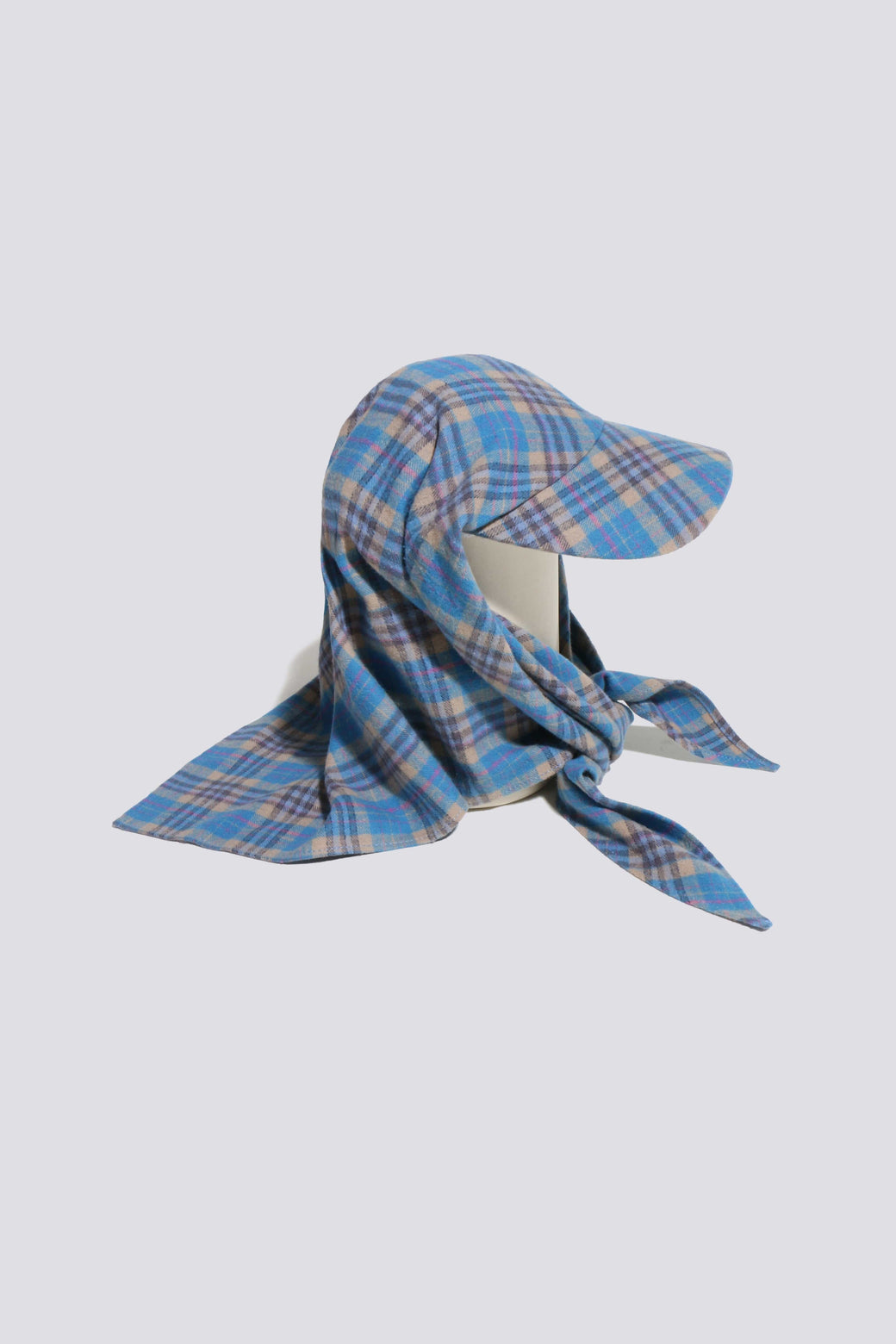 An updated take on Clyde's viral Brim Scarf, now in plaid blue and pink. Cut slightly larger for fall and winter, made from warm, weighty 100% cotton flannel. Wear it under the chin, behind the neck, or tied like a ballcap, shifting with whatever the day calls for.