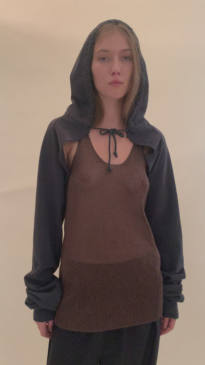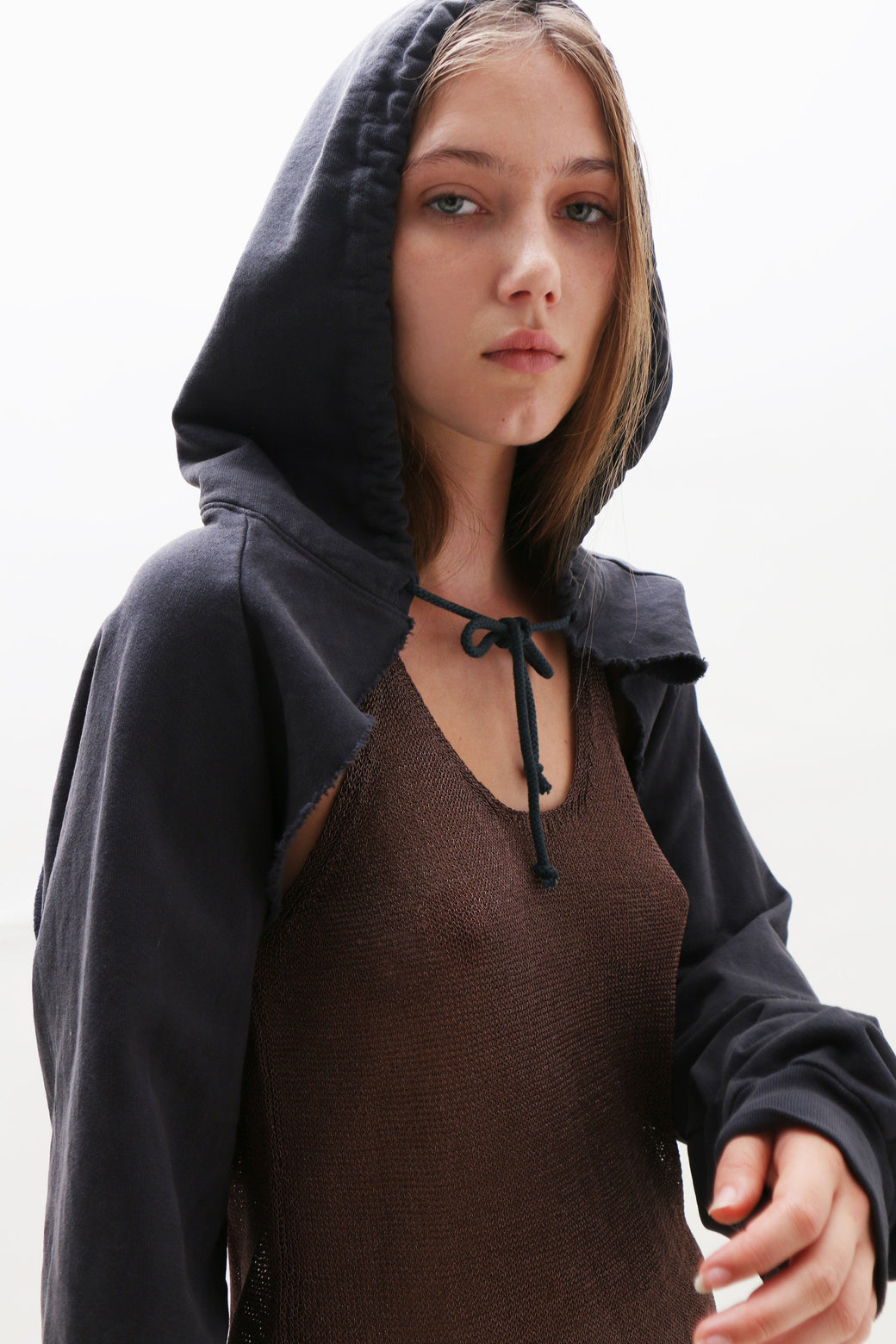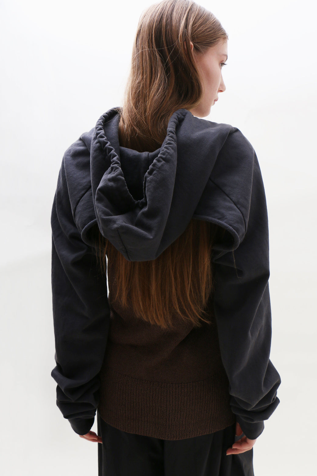 Hooded scarf cut from 100% reclaimed waste cotton, made in collaboration with Everybody.World. Can be worn draped as a bolero or as a scarf wrapped around the neck.
