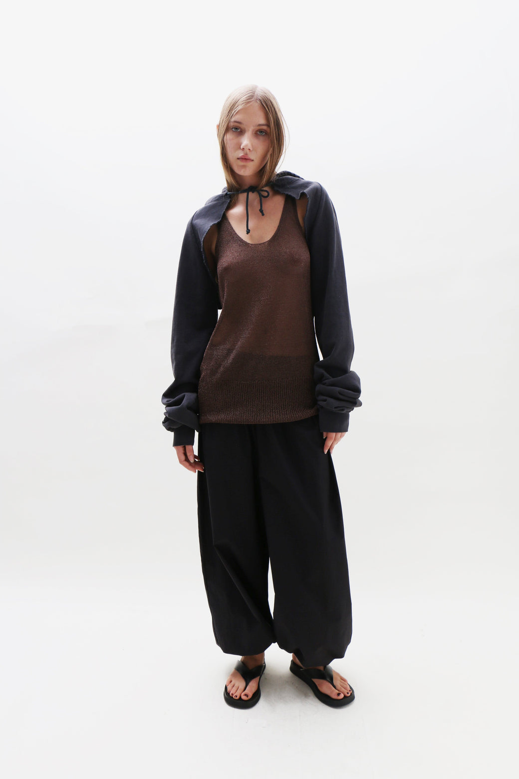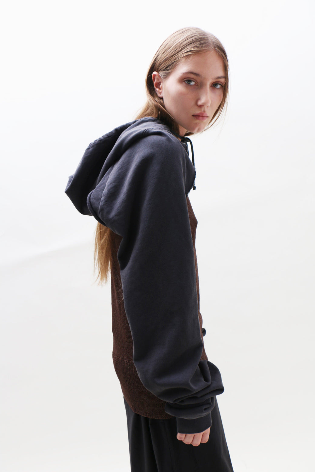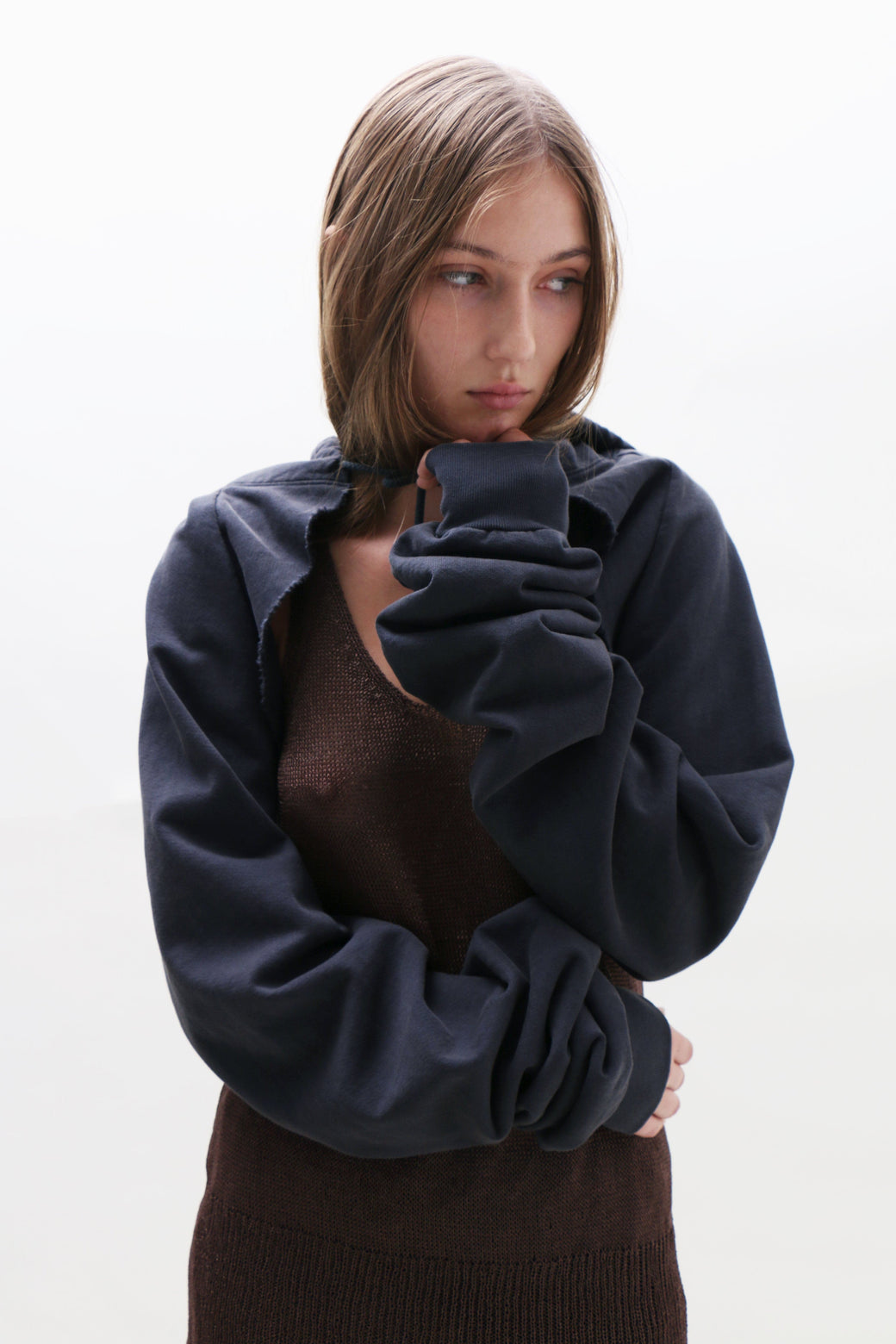 Hooded scarf cut from 100% reclaimed waste cotton, made in collaboration with Everybody.World. Can be worn draped as a bolero or as a scarf wrapped around the neck.