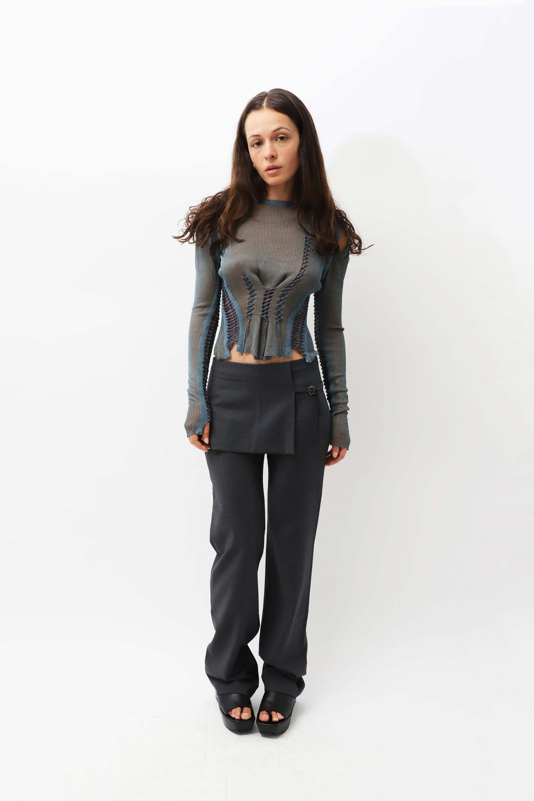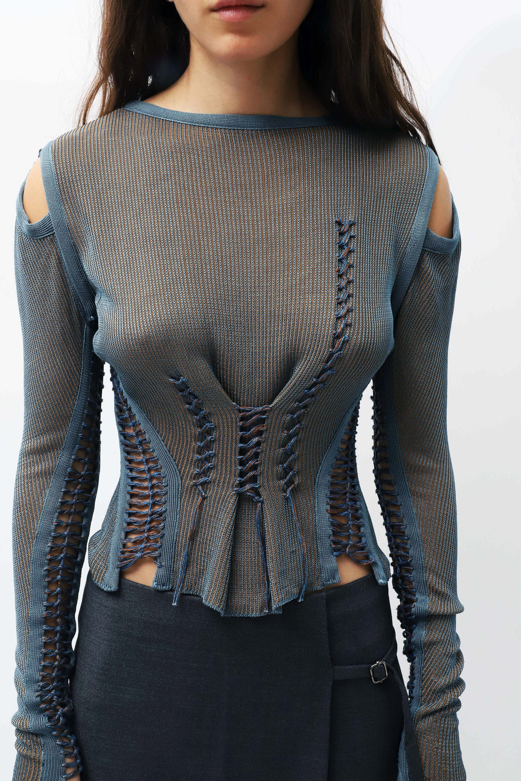 Long-sleeve ribbed knit top in blue and caramel. Designed with a boat neckline and exposed shoulder cutouts. Features waist and side arm cutouts with hand-stitched lace-up details and three asymmetrical, body hugging lace-up pleats.