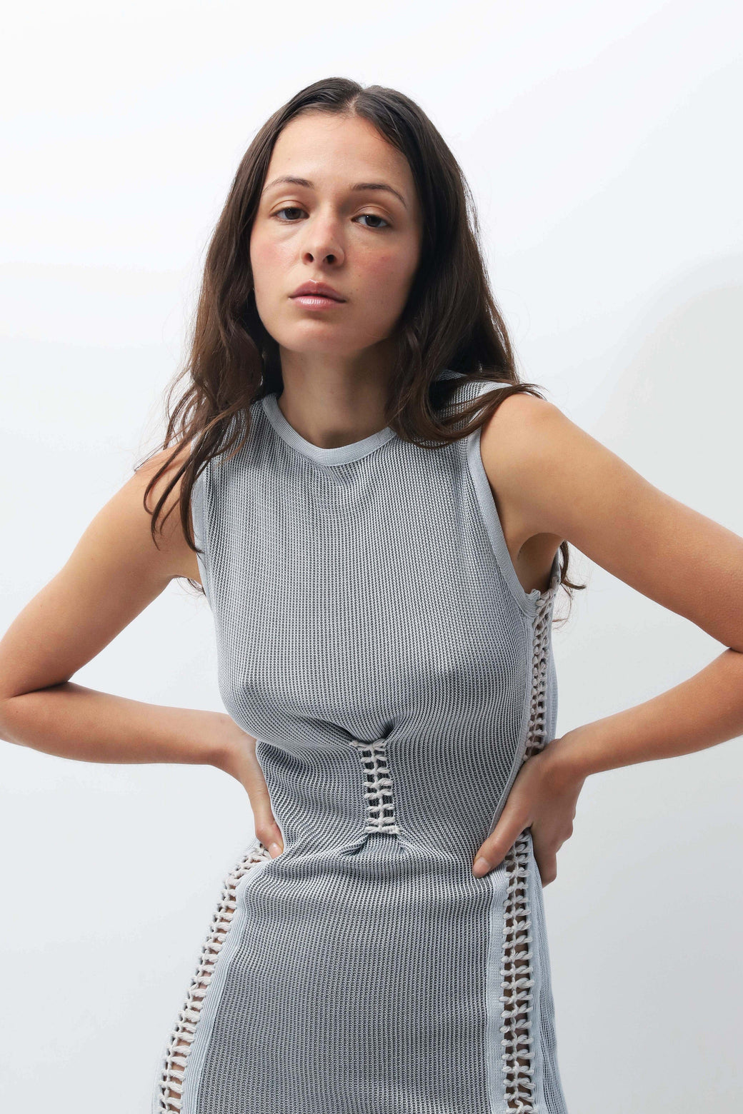 Sleeveless mini dress crafted from silver yarn. Features a high neckline and a gathered lace-up pleat detail at the front that cinches the waist. Side cutout slits are hand-stitched with blue crochet yarn and finished with an asymmetrical hem.