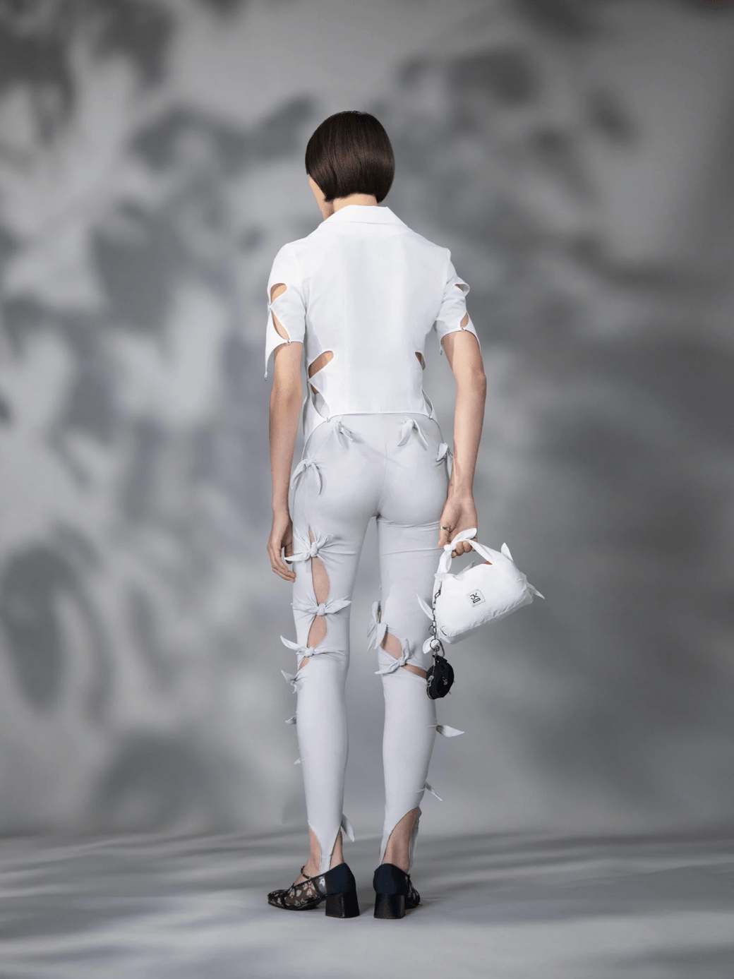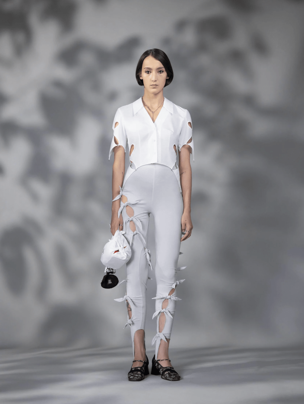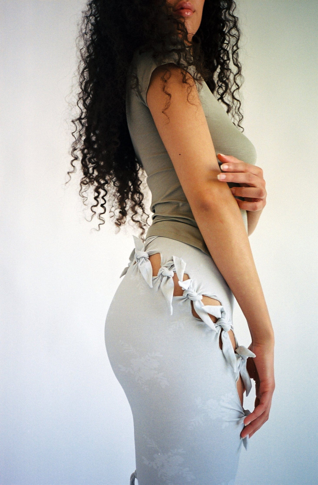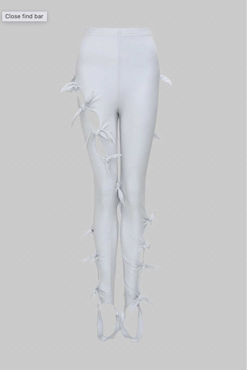 These light gray stretch cotton jersey leggings feature a floral pattern, cutouts, self-tie fastenings, and raw edges throughout, adding an edgy and feminine touch to the design. With asymmetrical construction and an elasticized waistband, these leggings are comfortable and stylish. Pair it with a slipper or sneaker and an easy errand-running top.