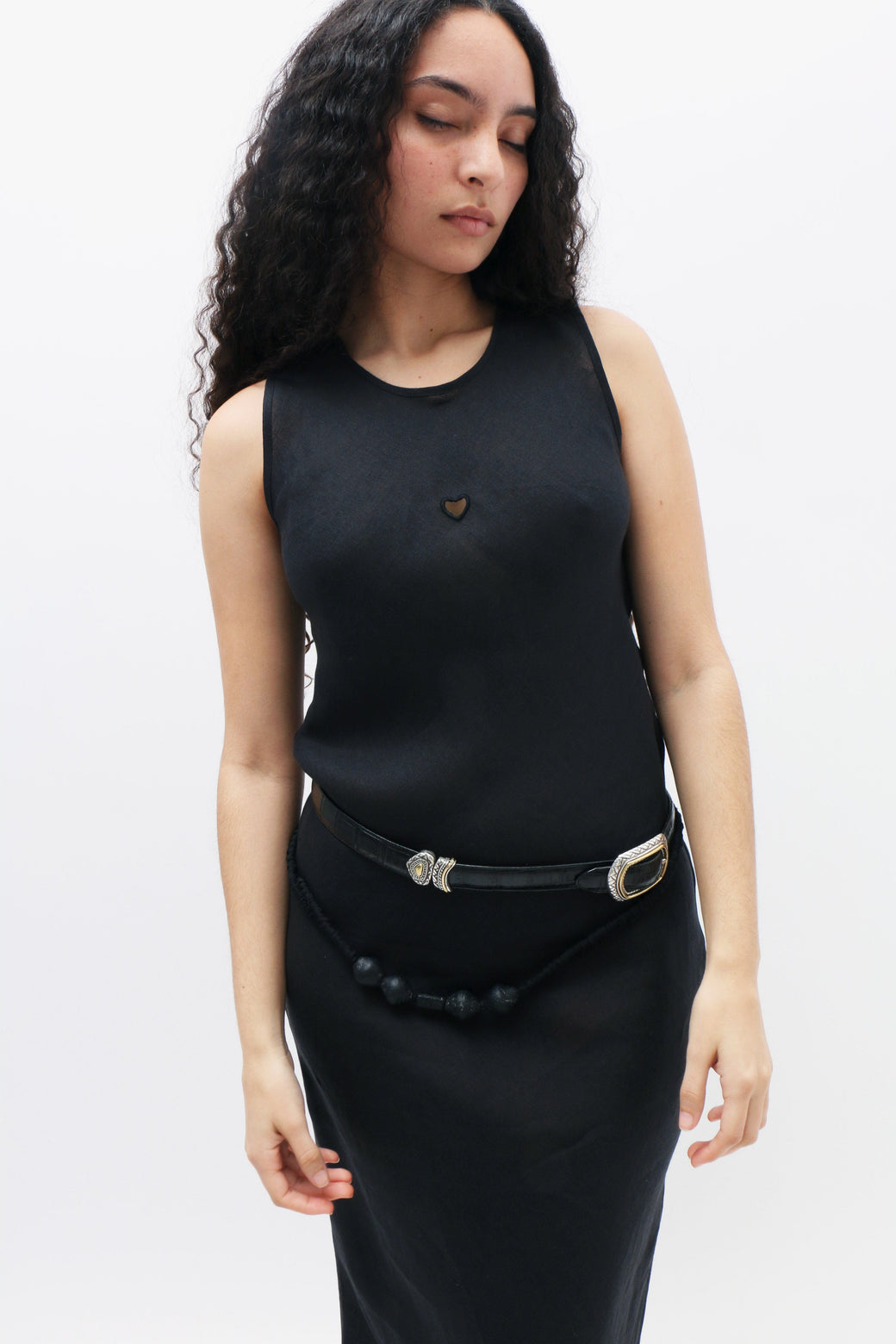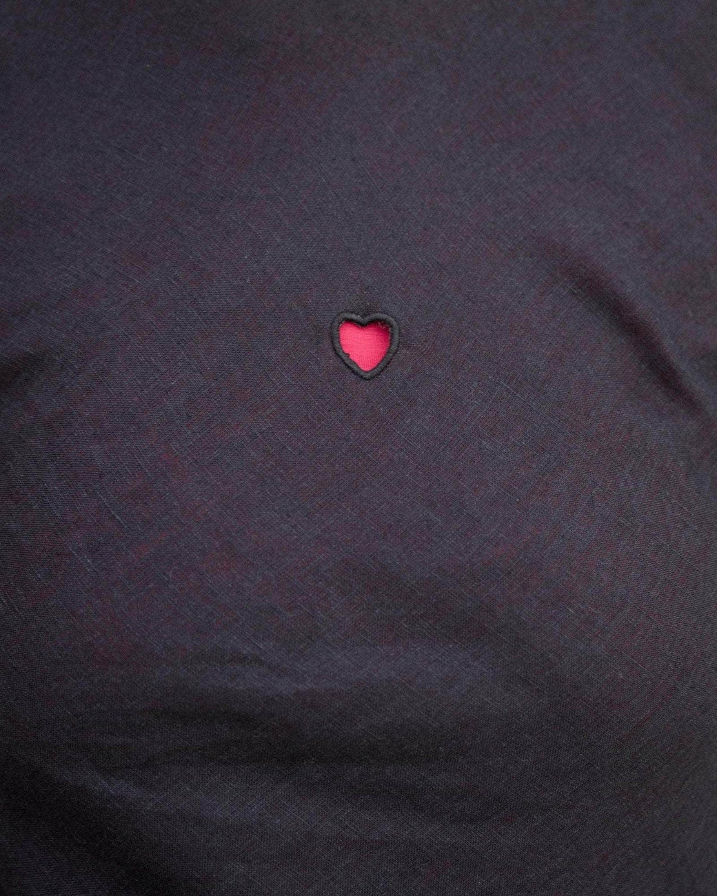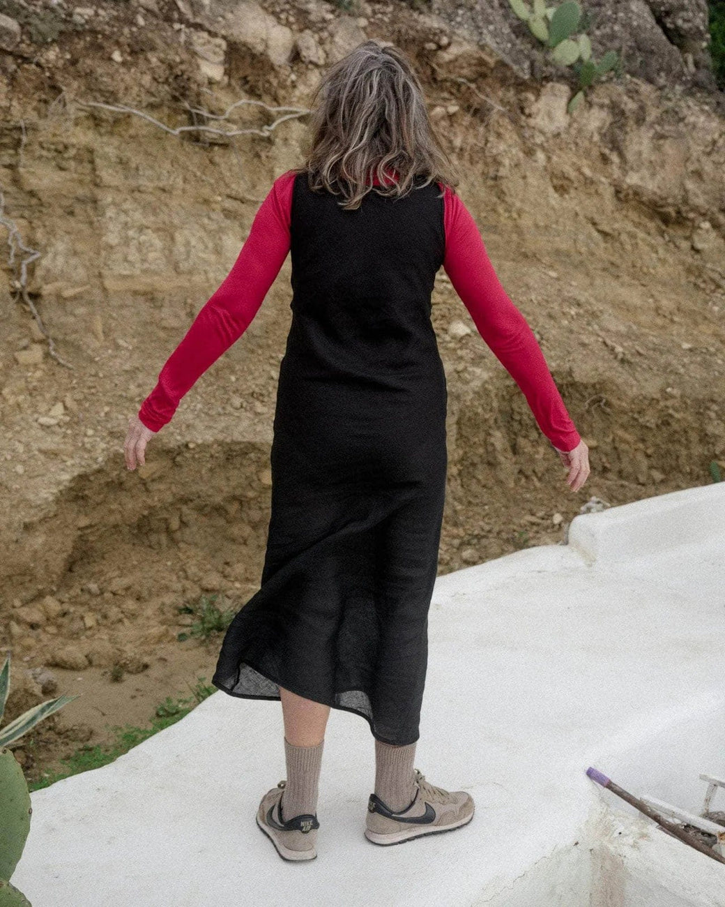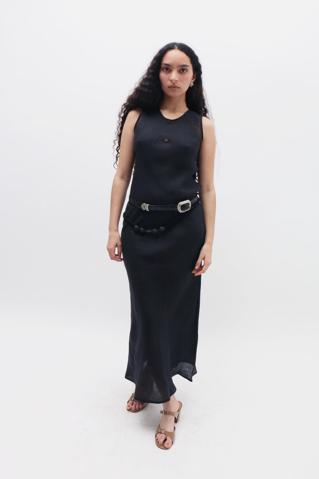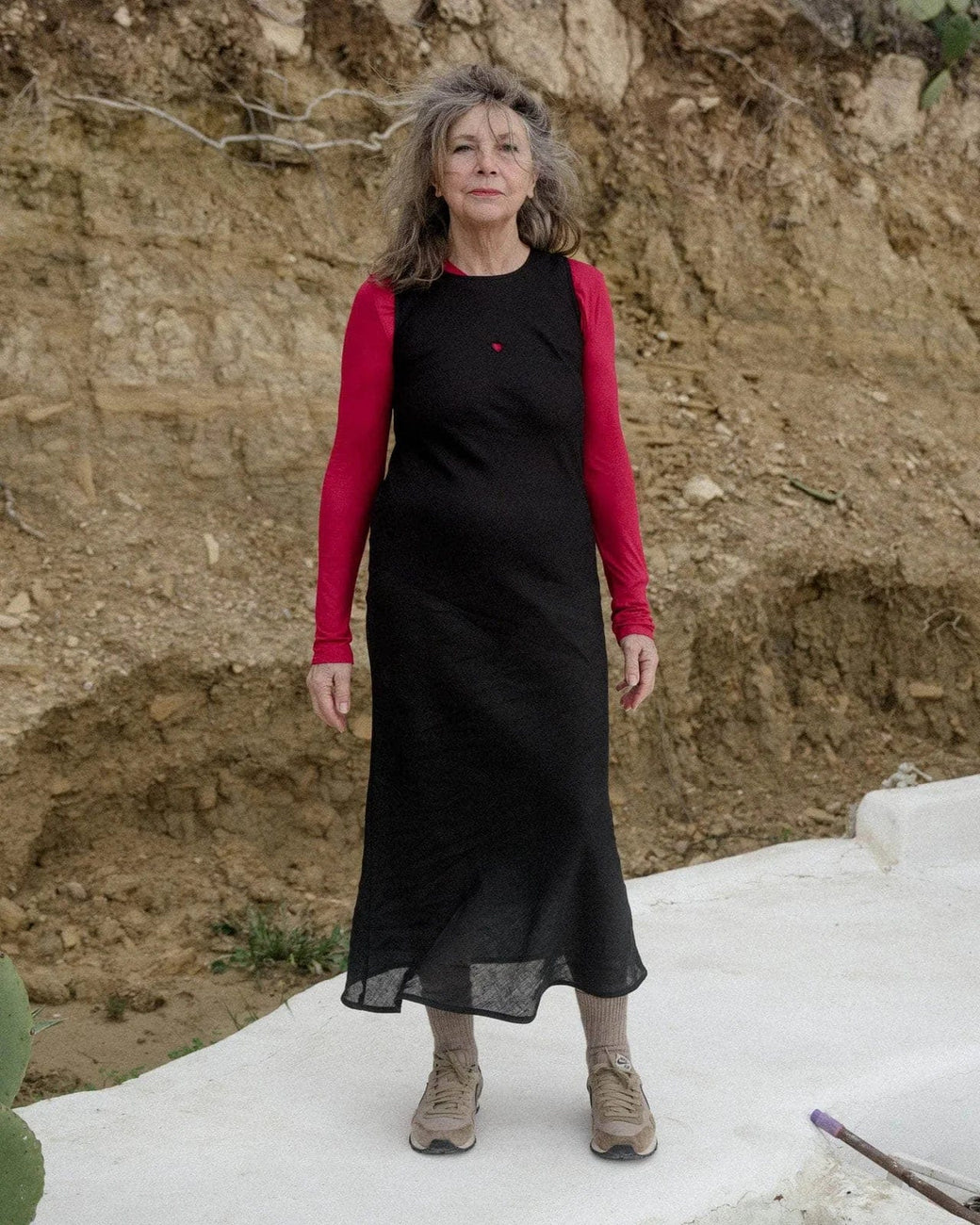 Crewneck sleeveless bias cut linen dress, with mini heart embroidered cut out at the center.