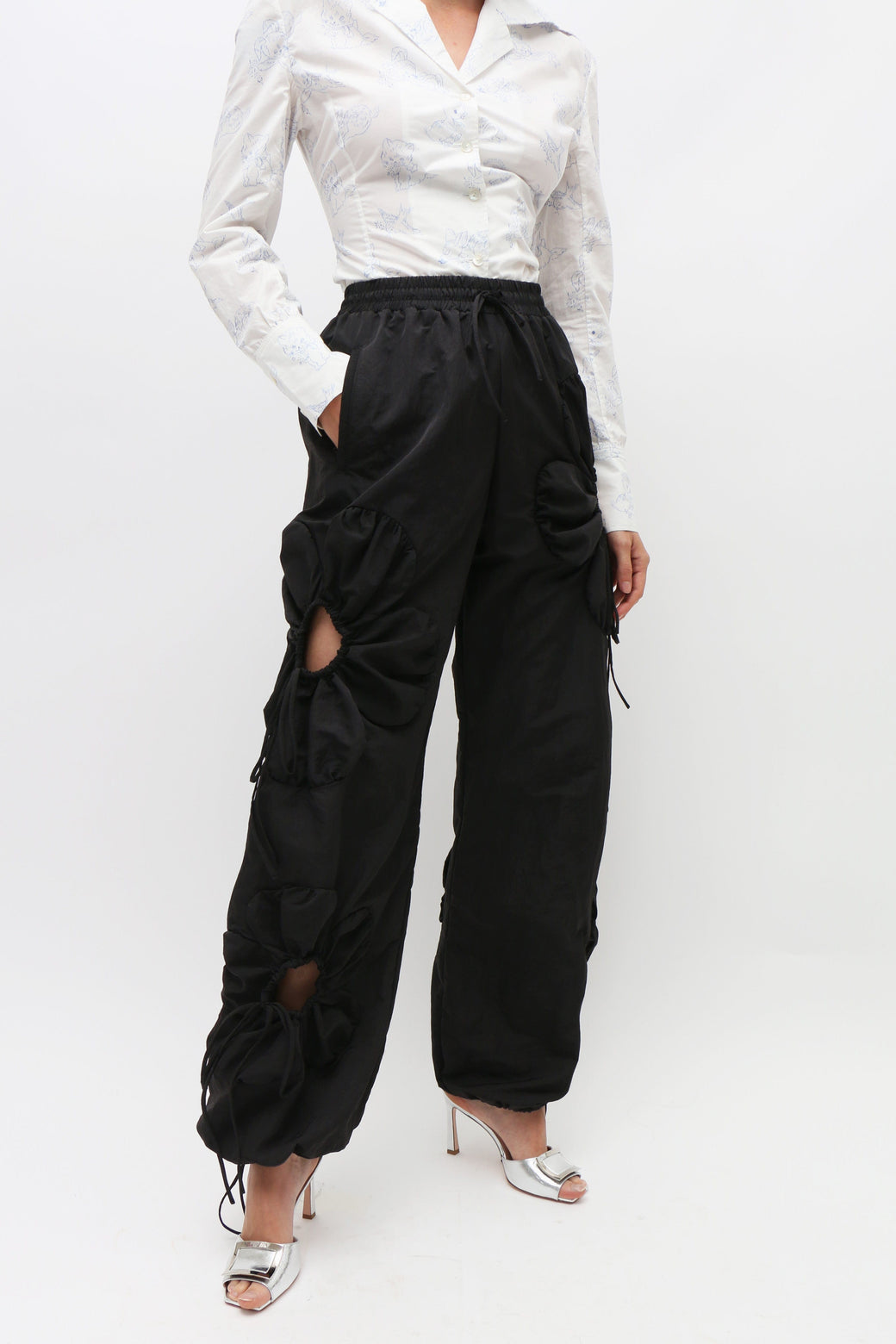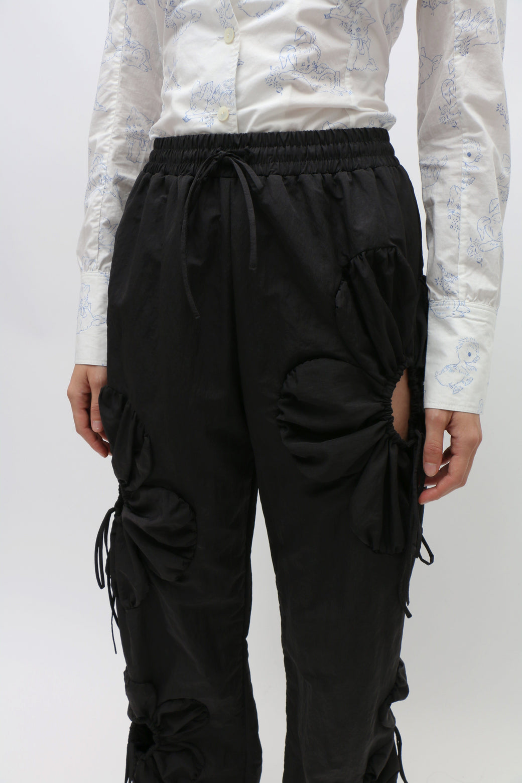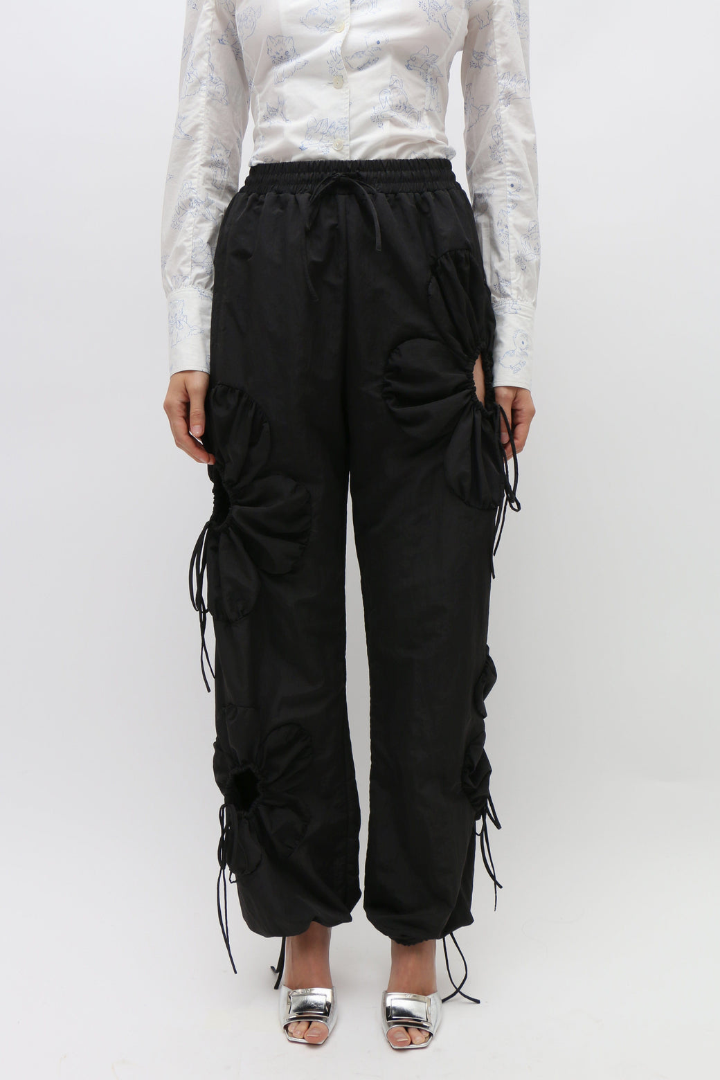 High rise nylon pants in black. Classic J.Kim floral cutout detailing throughout. Perfectly oversized with an adjustable elasticated waistband. Single back pocket. Drawstrings at cuffs, could be worn as a jogger or with a wider leg. Your new favorite pants, they speak for themselves. Worn with the Black and Red Petal Long Sleeve.