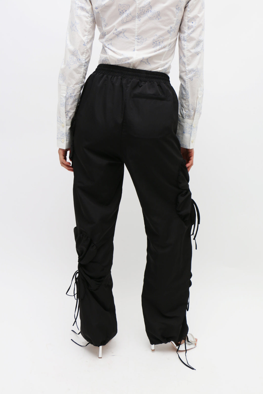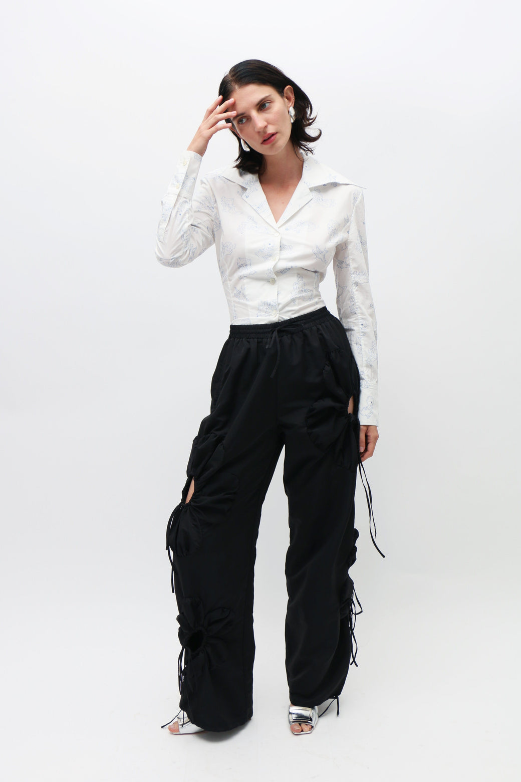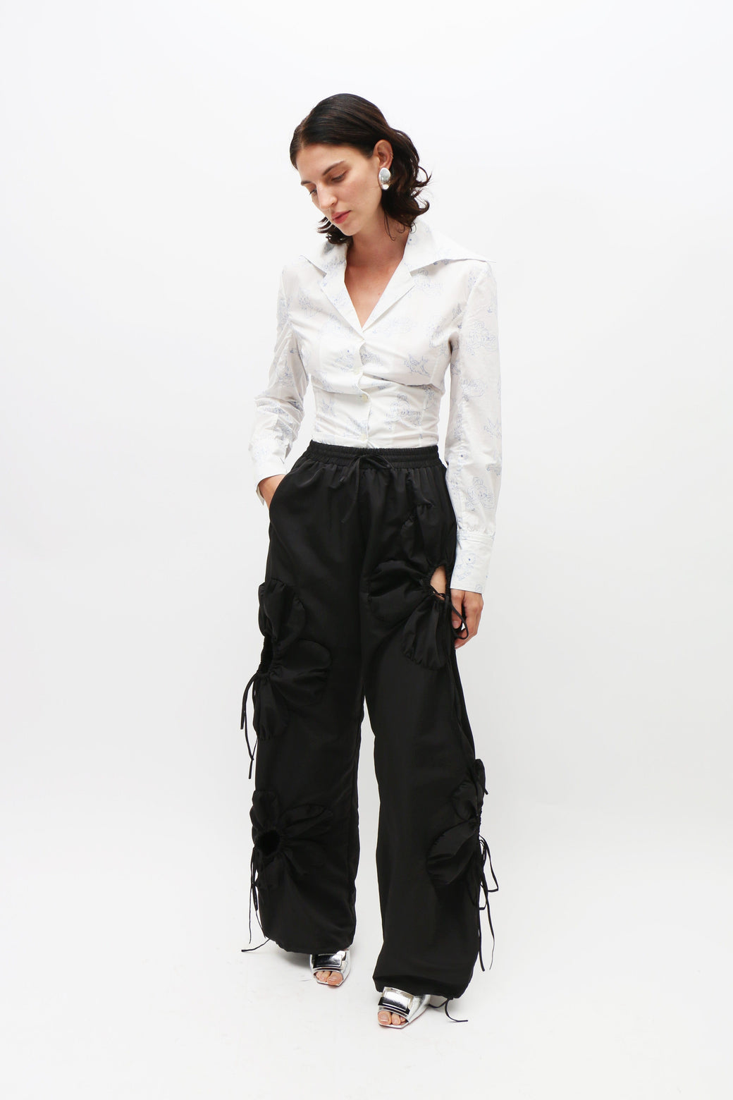 High rise nylon pants in black. Classic J.Kim floral cutout detailing throughout. Perfectly oversized with an adjustable elasticated waistband. Single back pocket. Drawstrings at cuffs, could be worn as a jogger or with a wider leg. Your new favorite pants, they speak for themselves. Worn with the Black and Red Petal Long Sleeve.
