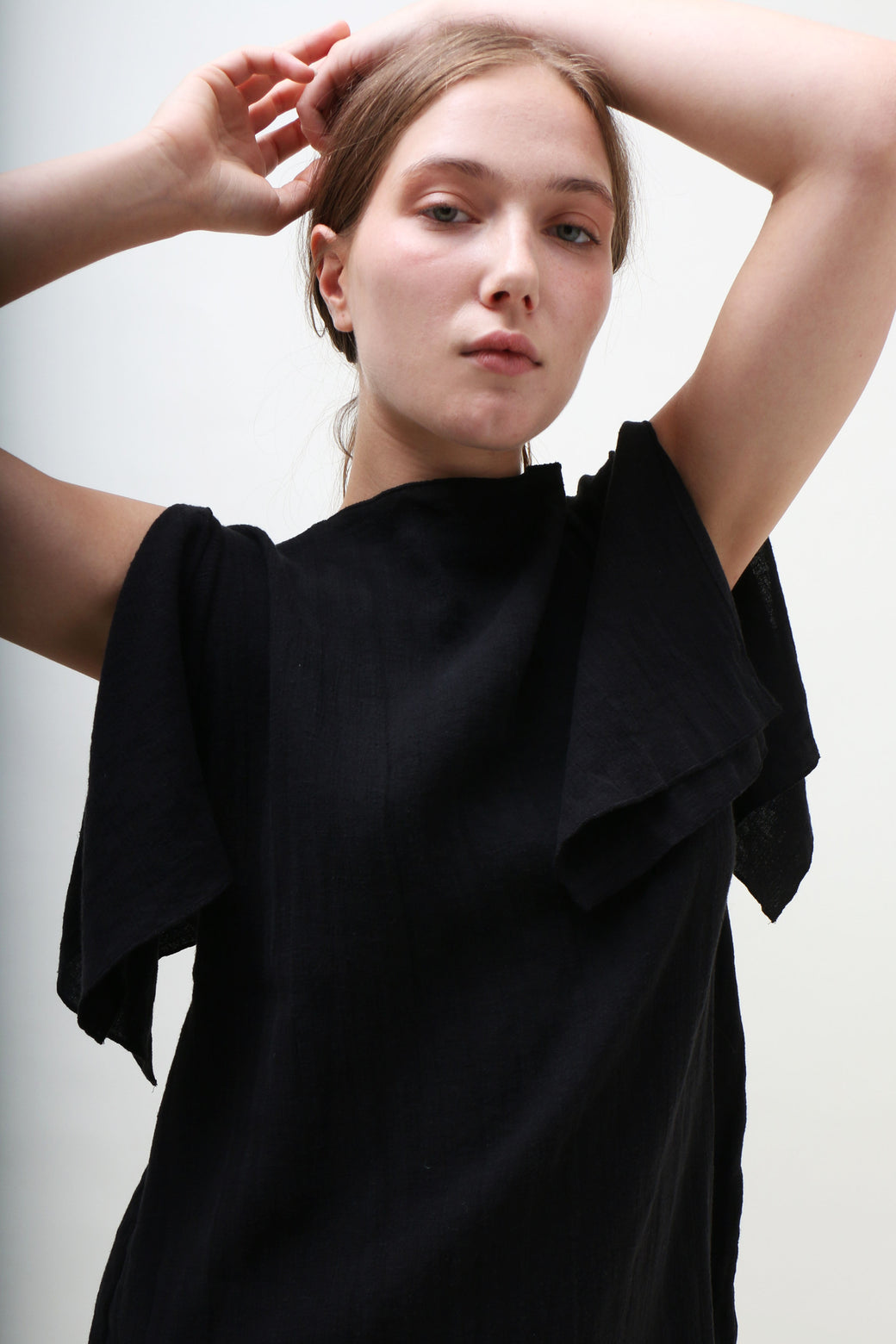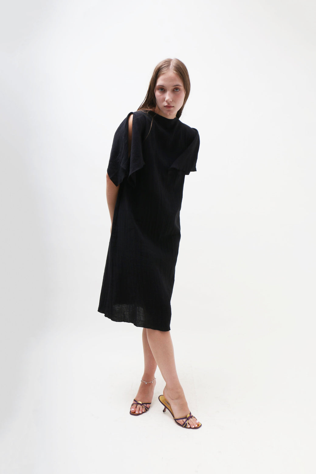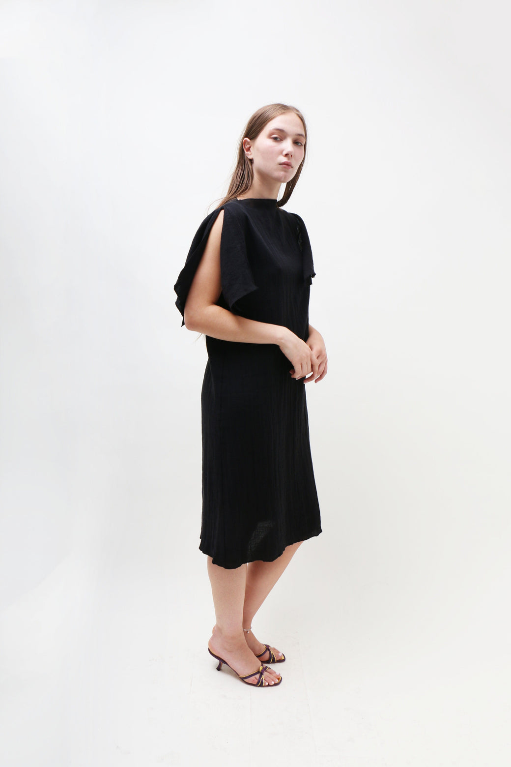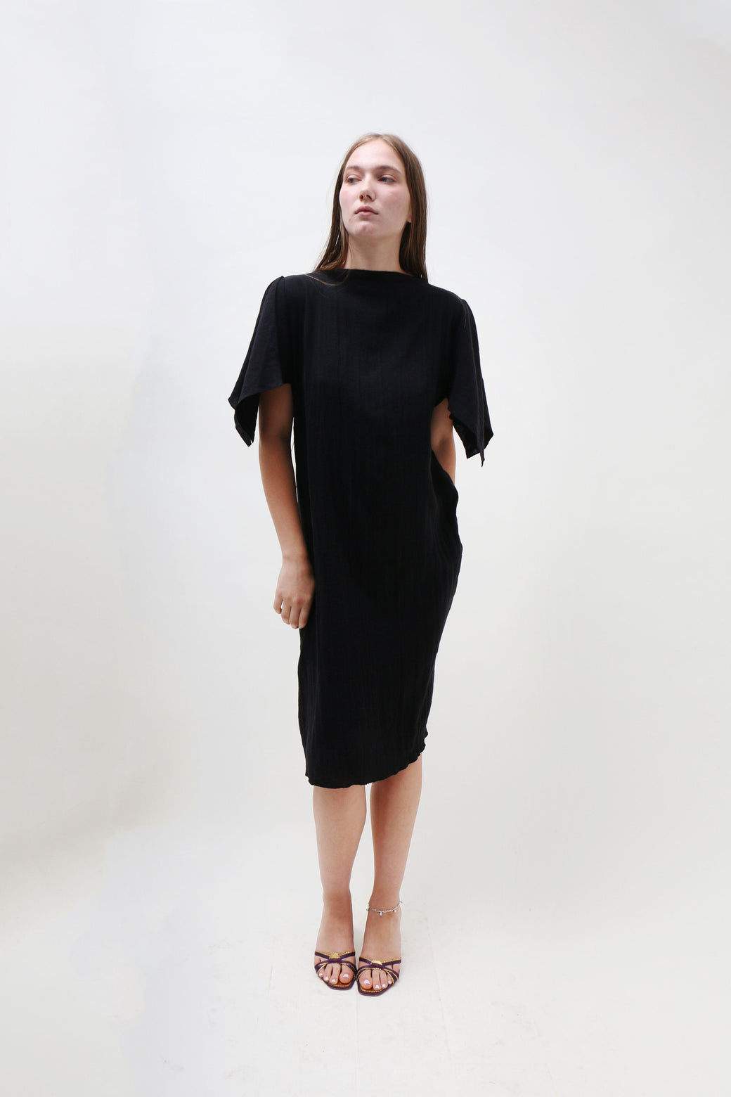 Crinkled black linen dress features a clean boat neckline and subtle open shoulder slits on the sleeves.