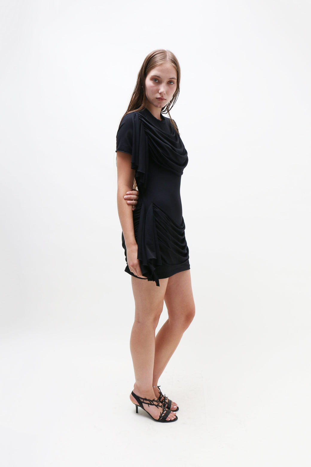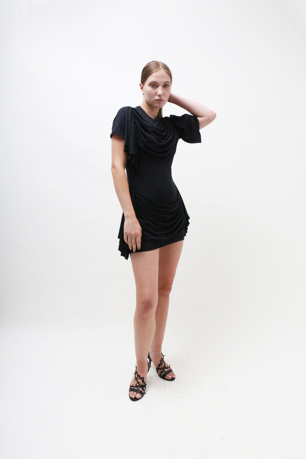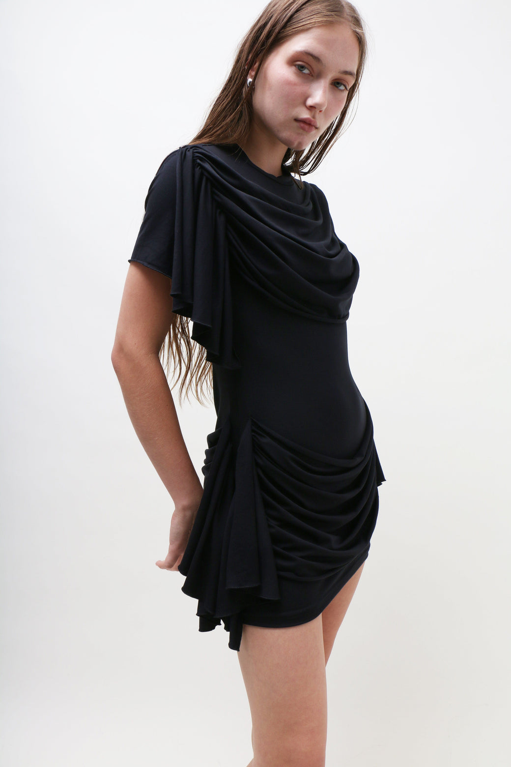 This black jersey mini dress boasts a classic T-shirt silhouette, elevated by draping fabric that gracefully cascades along the chest, waist, and bum, creating a dramatic, statuesque effect. Fit and material suits many body types.