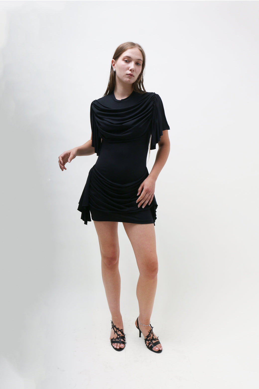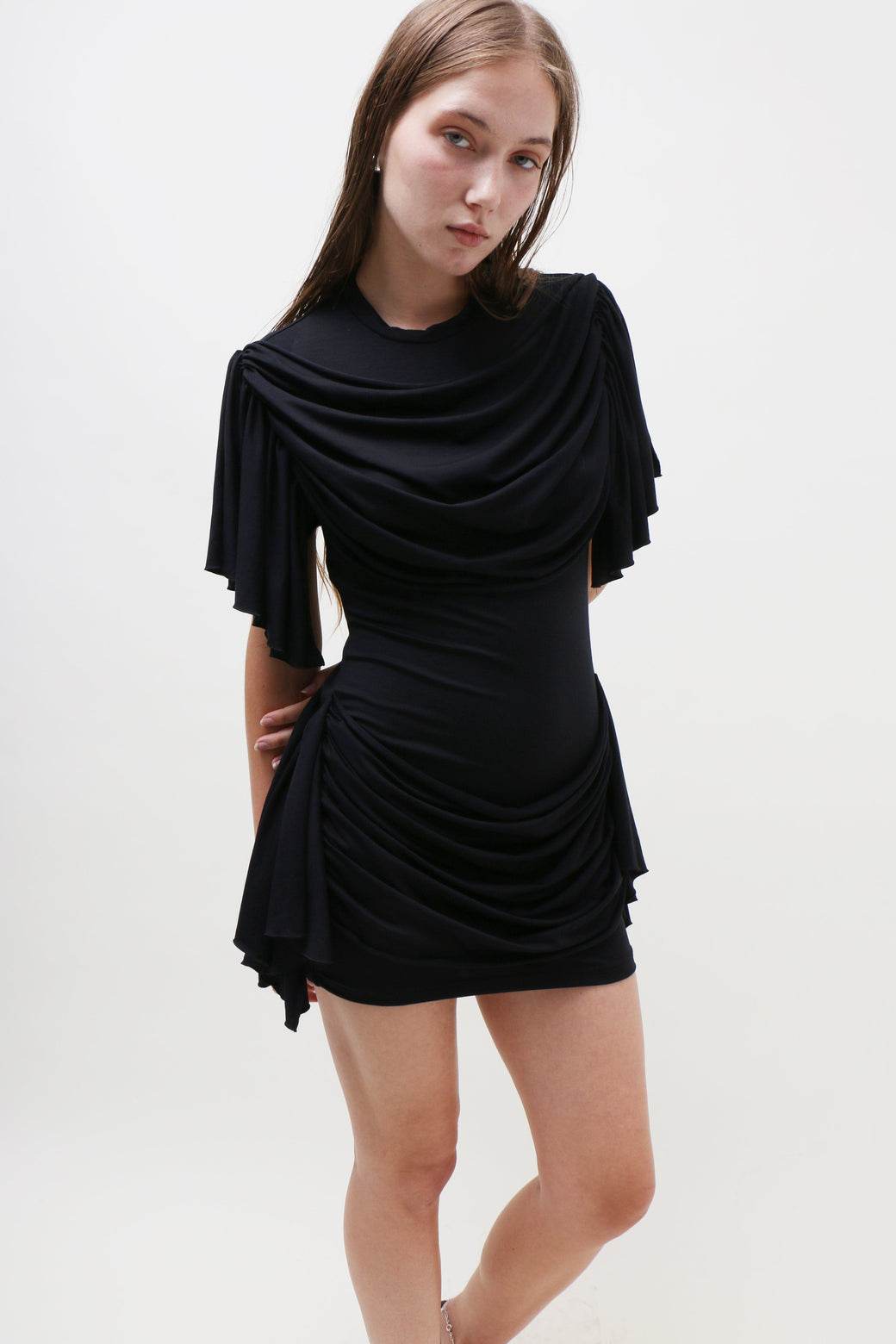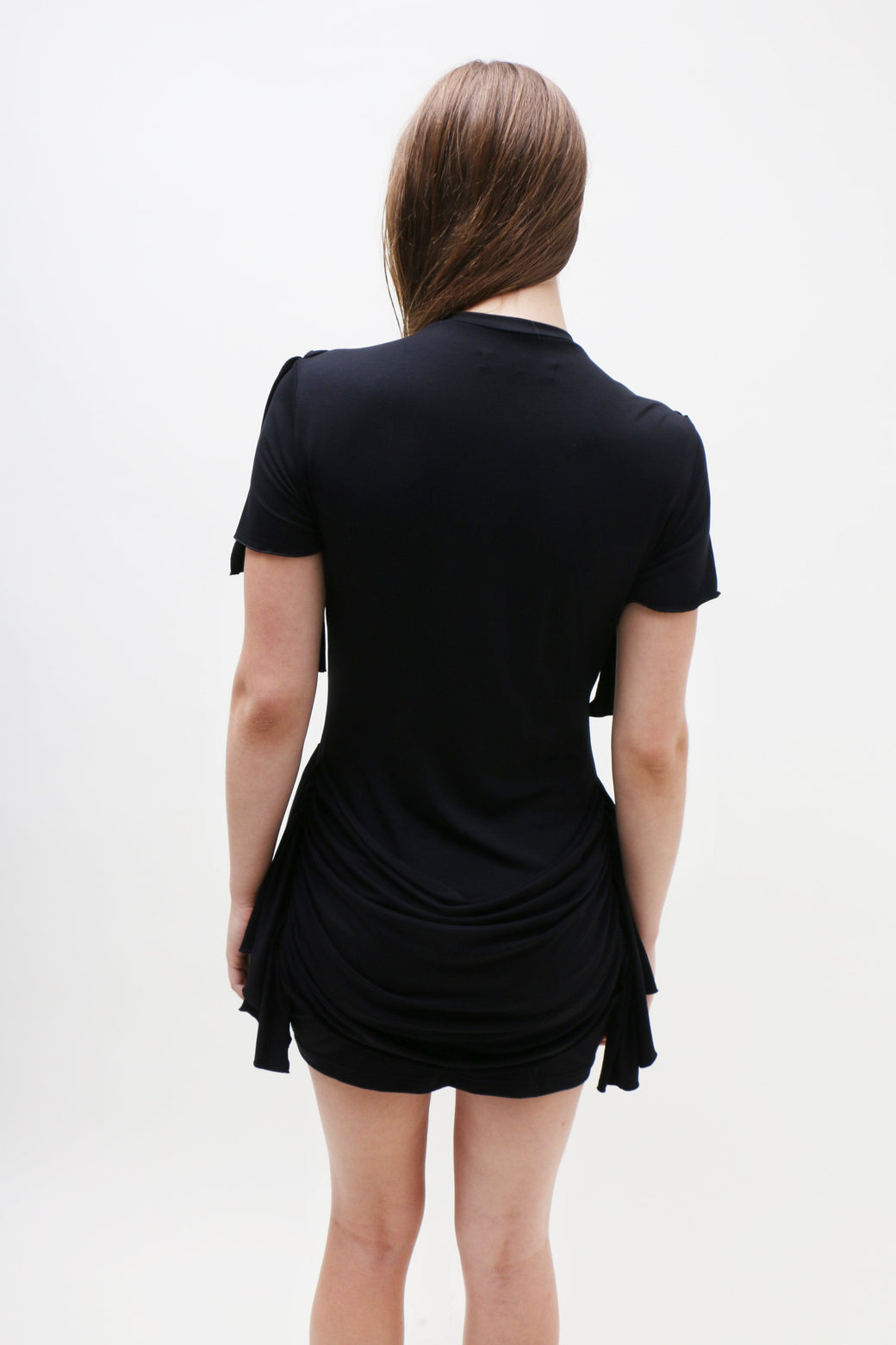 This black jersey mini dress boasts a classic T-shirt silhouette, elevated by draping fabric that gracefully cascades along the chest, waist, and bum, creating a dramatic, statuesque effect. Fit and material suits many body types.