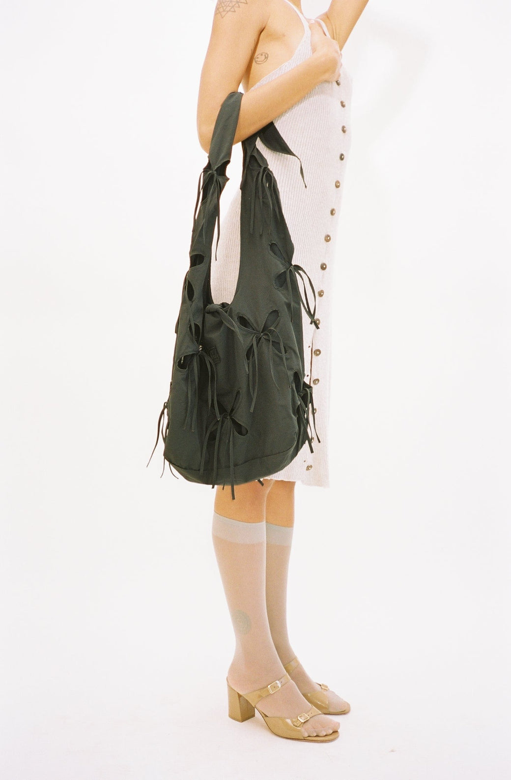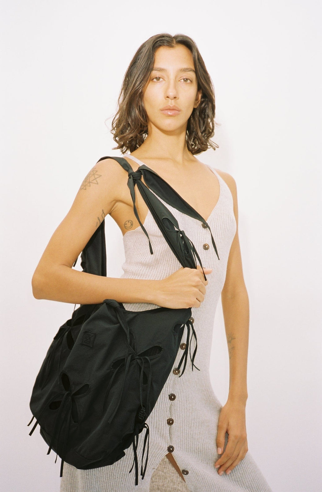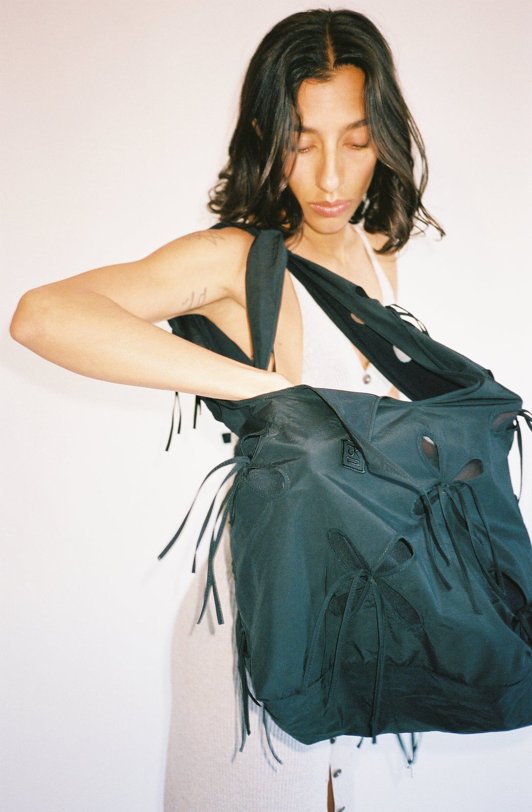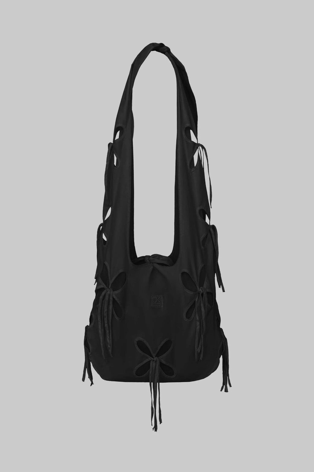 A seasonal take on landmark J.Kim bale bag. This time, outer shell of nylon canvas is decorated with brand's signature petal flower shape cutouts and knots. Inner lining of mesh with lightweight cotton gauze decoration on petals. Knotted detailing at integrated carry handle. Logo embroidered at face as well as on the detachable zip pouch. Self-tie closure.