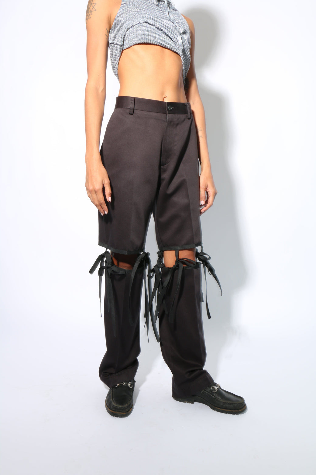 This one of one trouser is made upcycled vintage trousers. The pant cuts off with a break at the mid way point above the knees and is attachable by ties. The ties are adjustable allowing you to wear them as shorts or pants, which lets you to really play around with styling. These pieces are one of one. Using entirely upcycled materials, patterns might differ slightly from style to style.
