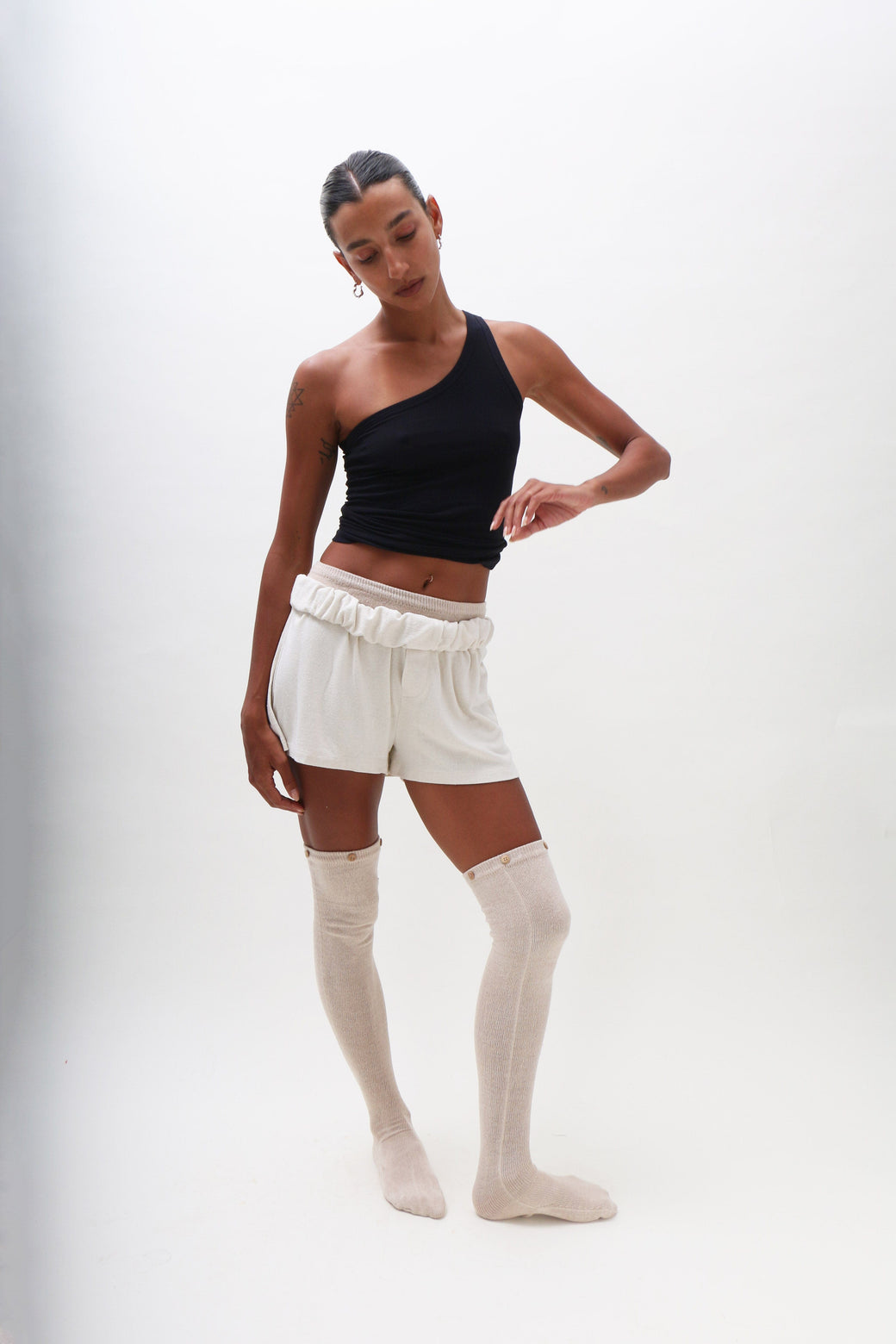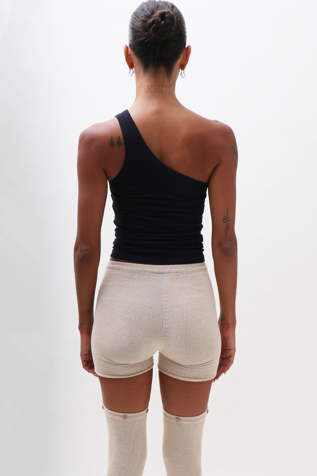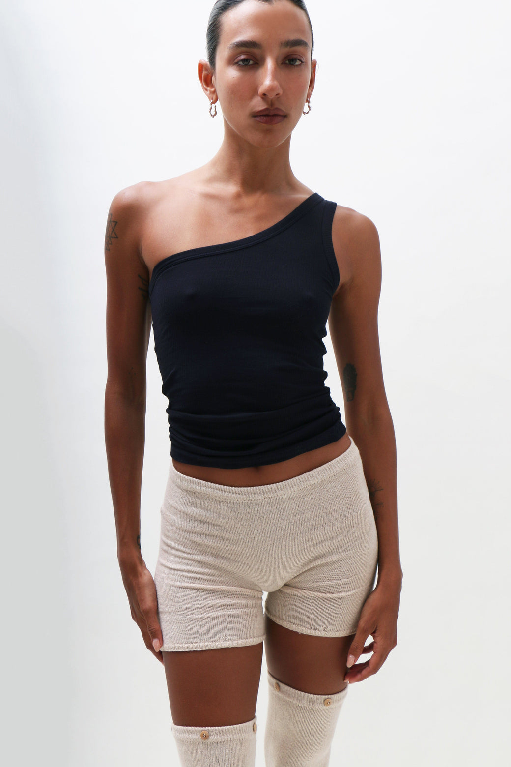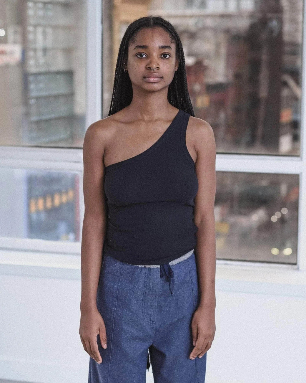 An elevated basic tank top with a sculptural edge. Made from soft, breathable navy organic cotton rib, this lined top features a single shoulder design and is finished with elastic trim at the neckline and hem for a secure, flexible fit.
