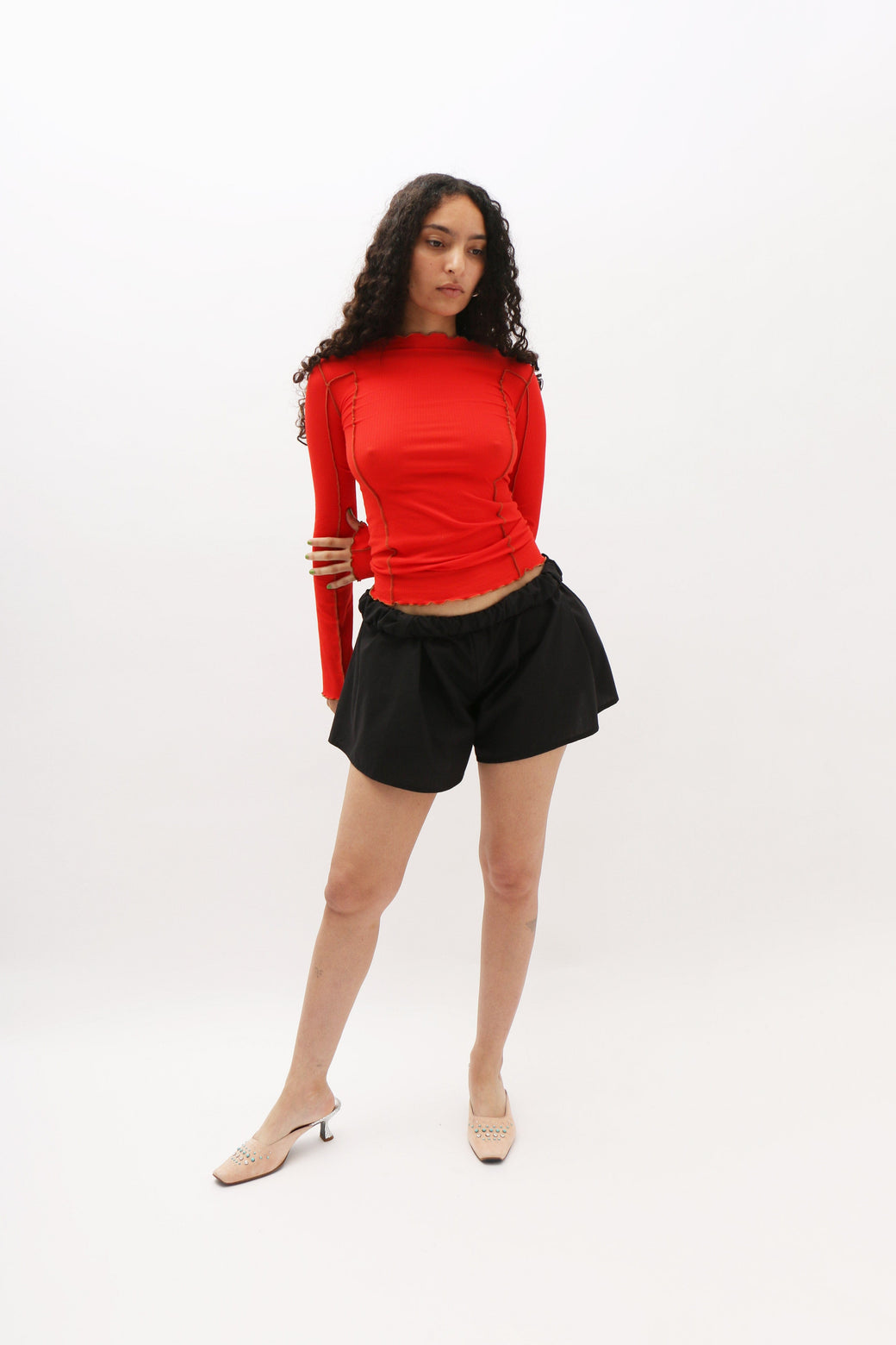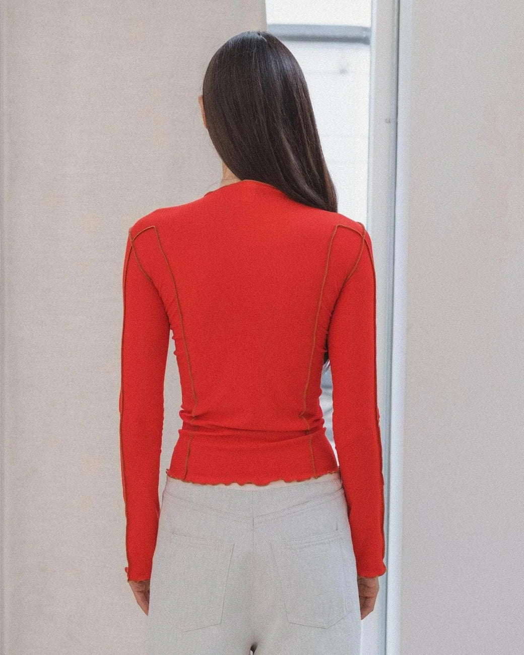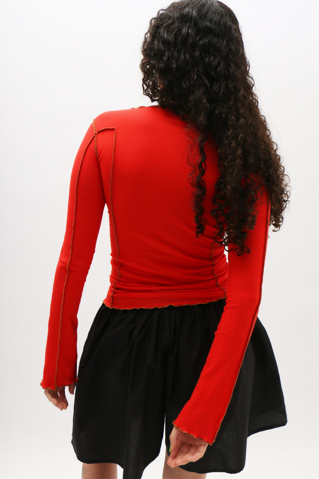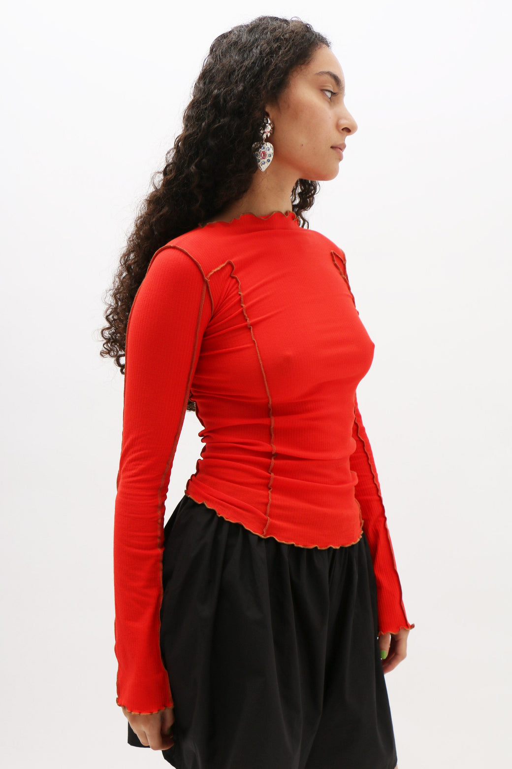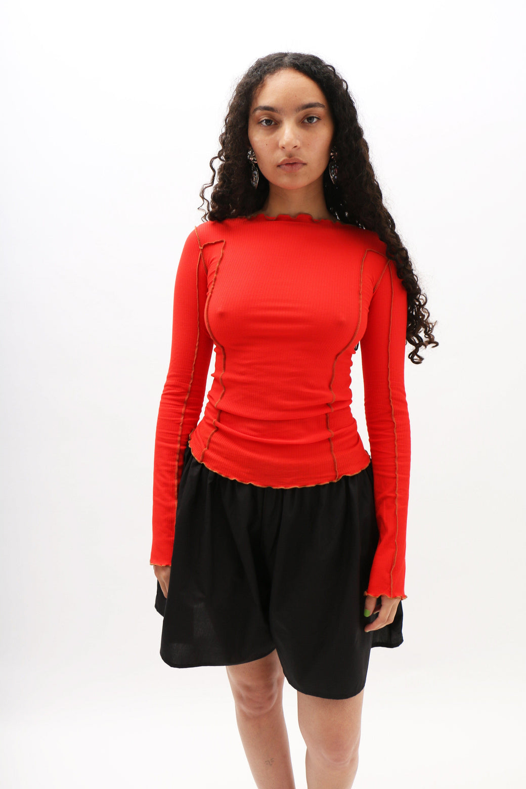 Bright red long-sleeve top is crafted from organic cotton rib and features a flattering boatneck, exposed contrast seams, and delicate lettuce edging at the neckline and hems for a textural finish.