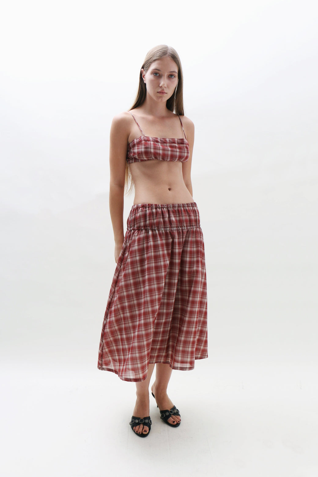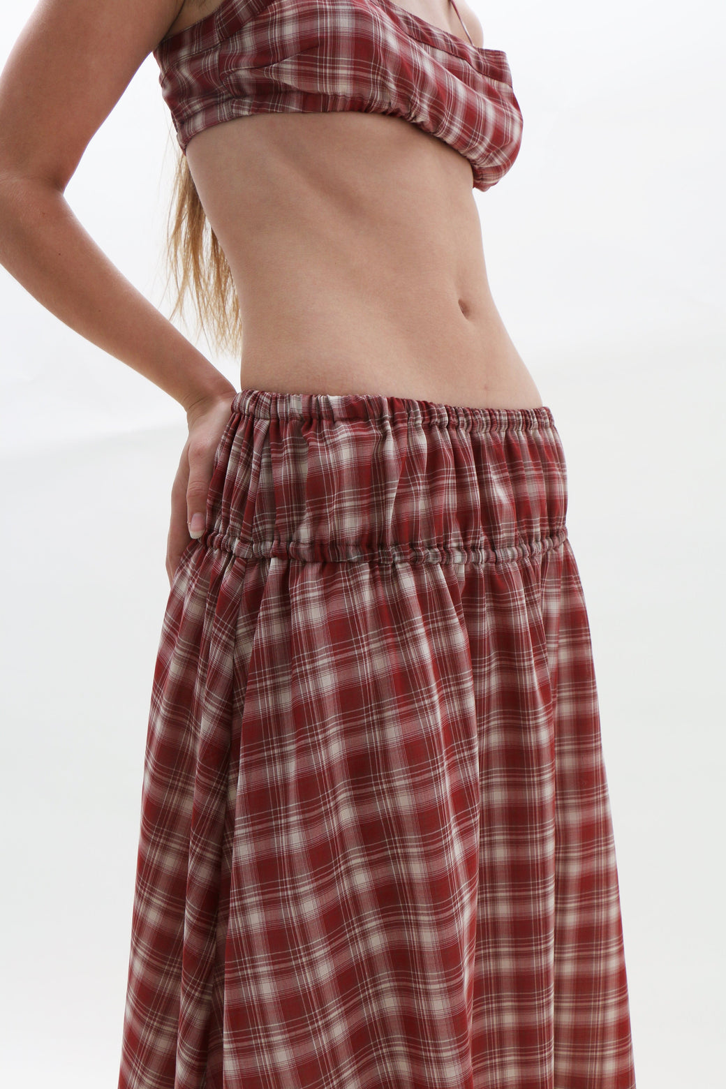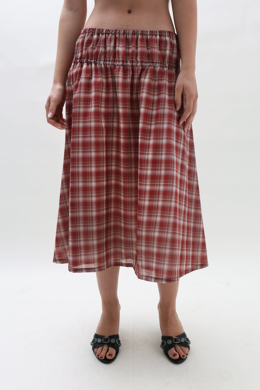 Woven brick-red plaid skirt in a fine wool blend, featuring an elasticated waist and yoke seam. Fully lined for complete coverage.