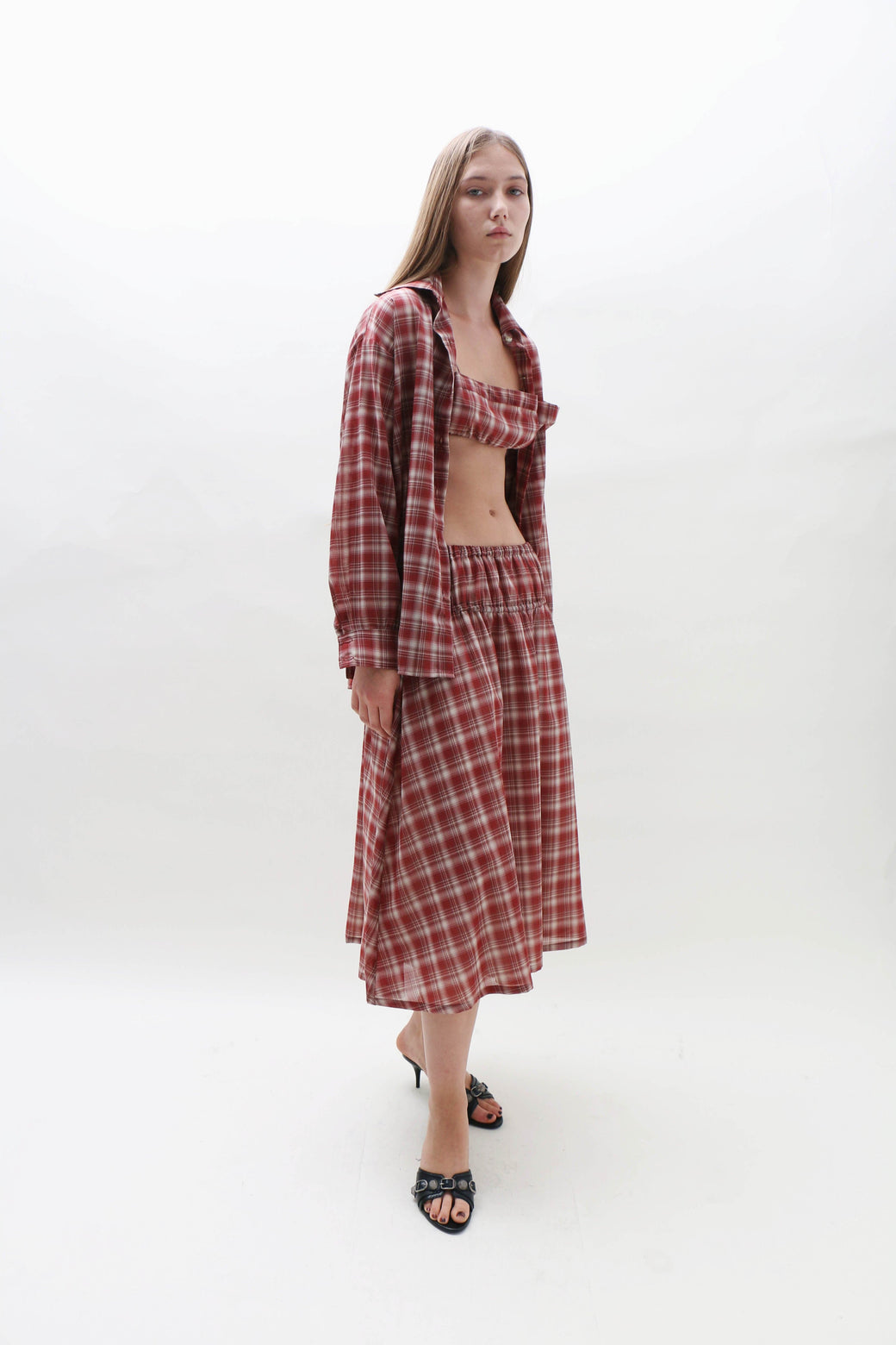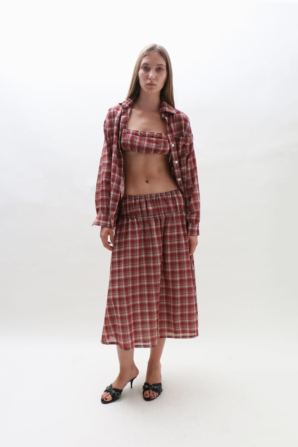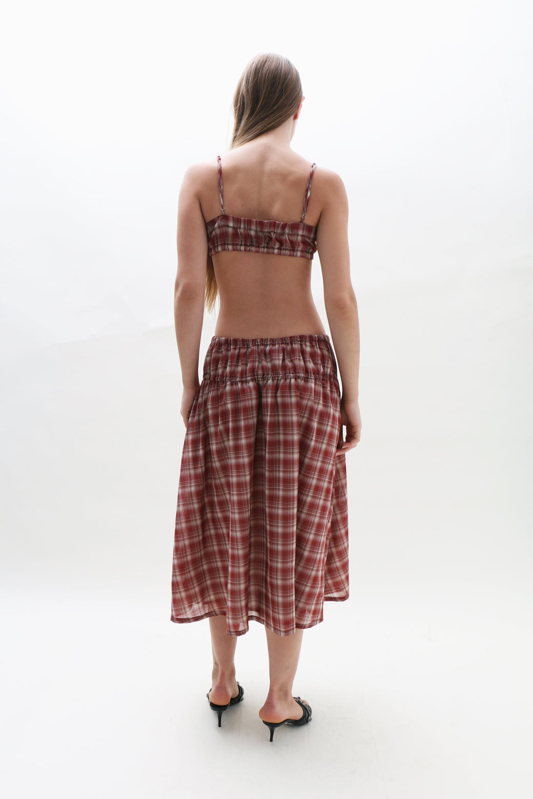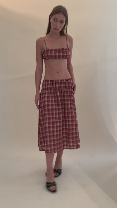 Woven brick-red plaid skirt in a fine wool blend, featuring an elasticated waist and yoke seam. Fully lined for complete coverage.