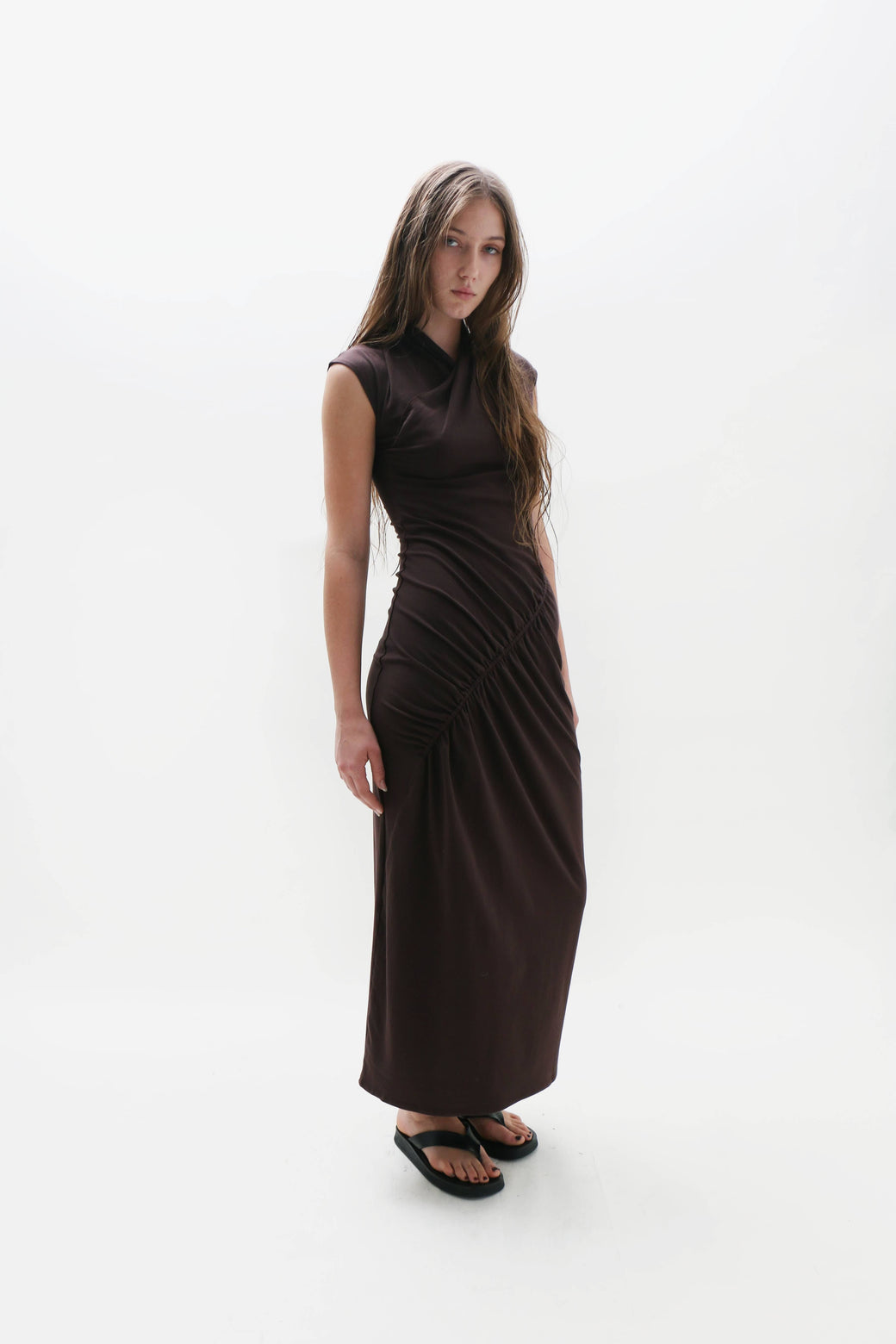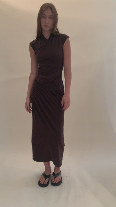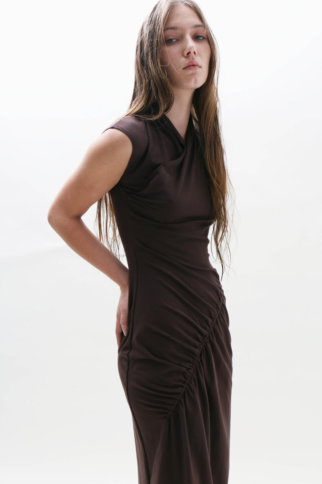 Sleeveless draped dress in soft stretch cotton interlock with a high neckline. Features a gathered front seam and a midi-length silhouette.