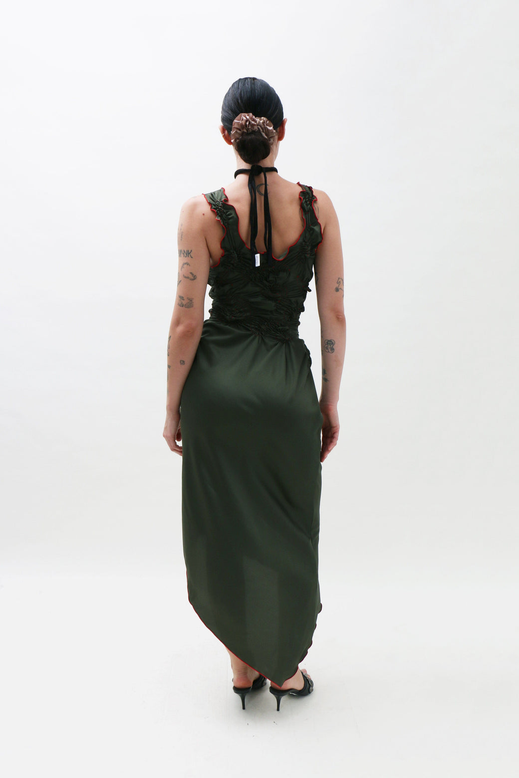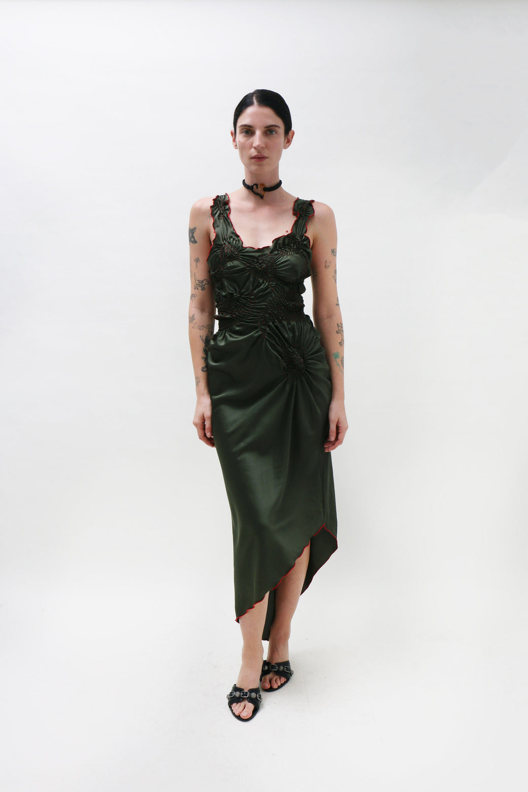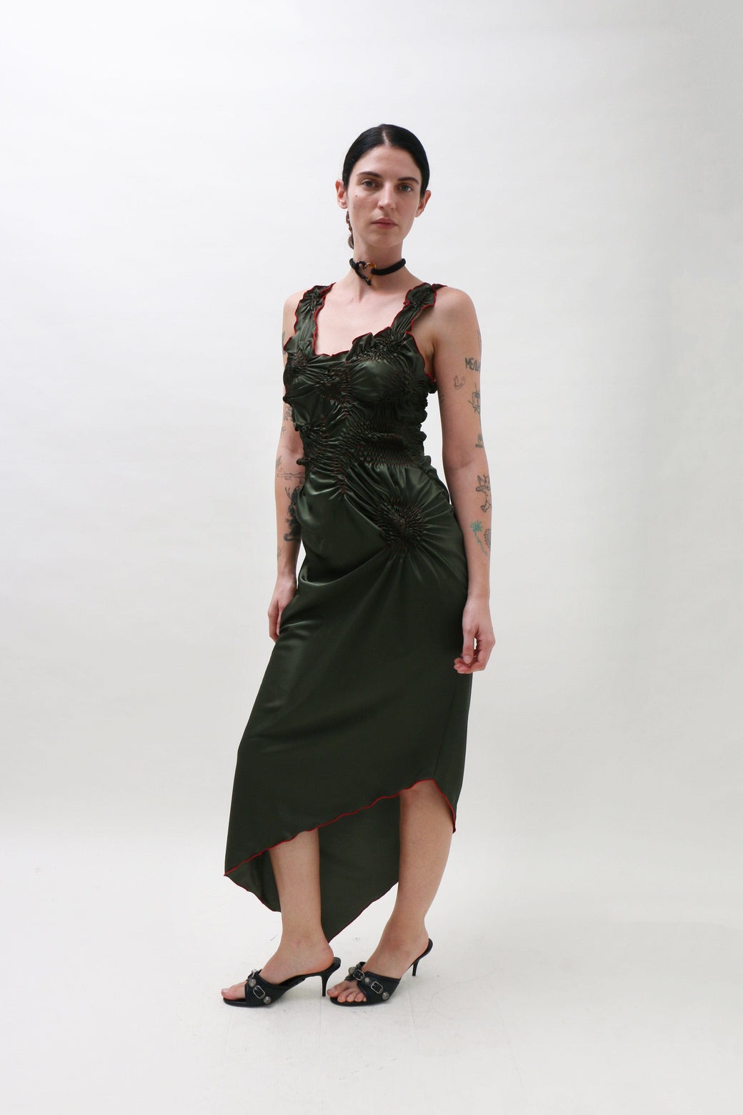 Drawing inspiration from palatial events in Uzbekistan, J.Kim designed the fitted stretch silk dress with an asymmetric hem with the delicate Markiza theme in mind. This season, hand-sewn paisley patterns gather and organically flow along the top of the dress. In a striking forest green color, with playful lettuce edges in contrasting red topstitching throughout.