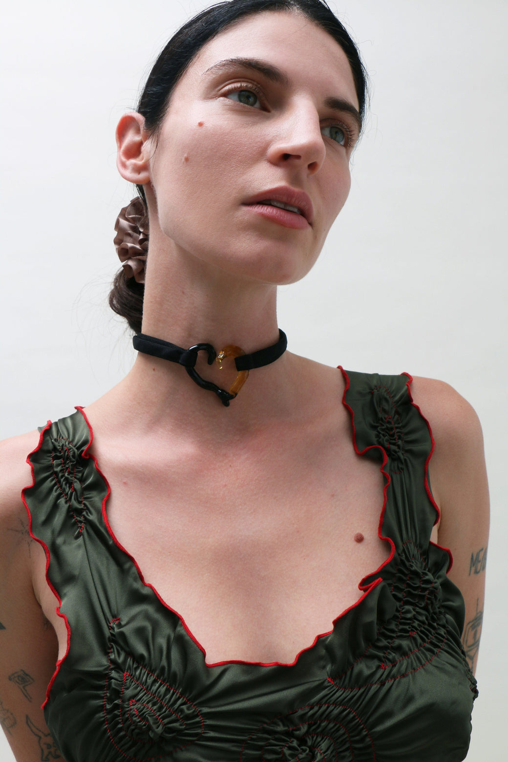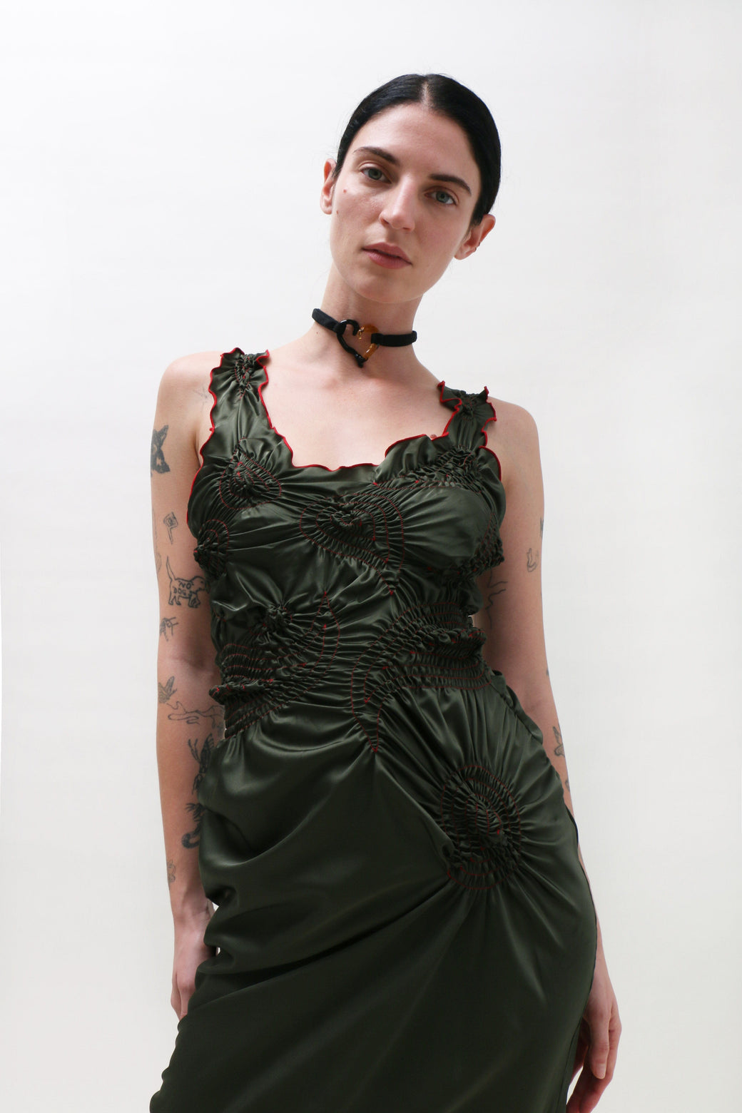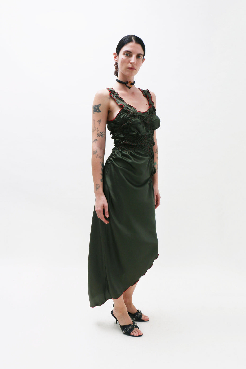 Drawing inspiration from palatial events in Uzbekistan, J.Kim designed the fitted stretch silk dress with an asymmetric hem with the delicate Markiza theme in mind. This season, hand-sewn paisley patterns gather and organically flow along the top of the dress. In a striking forest green color, with playful lettuce edges in contrasting red topstitching throughout.