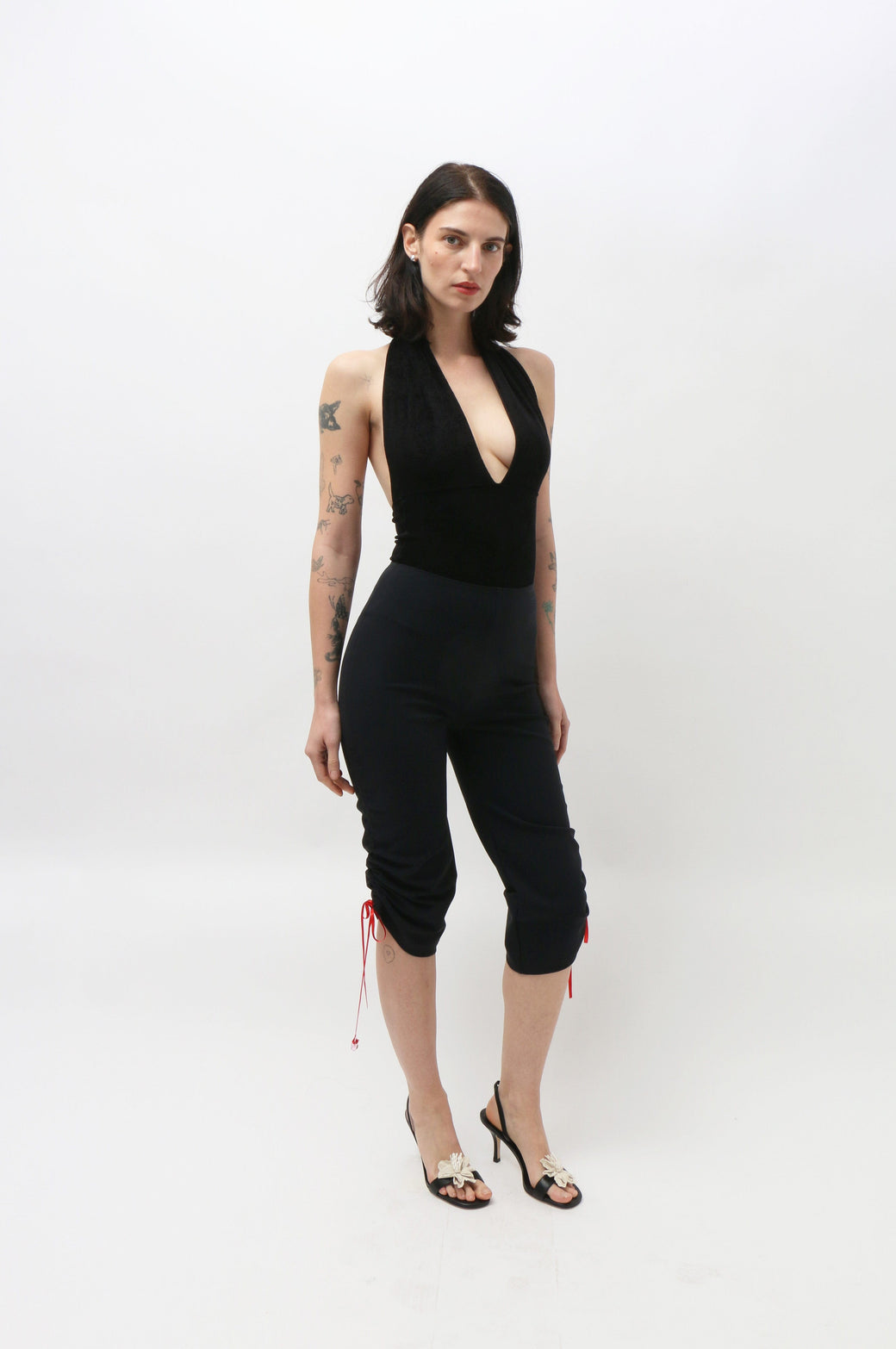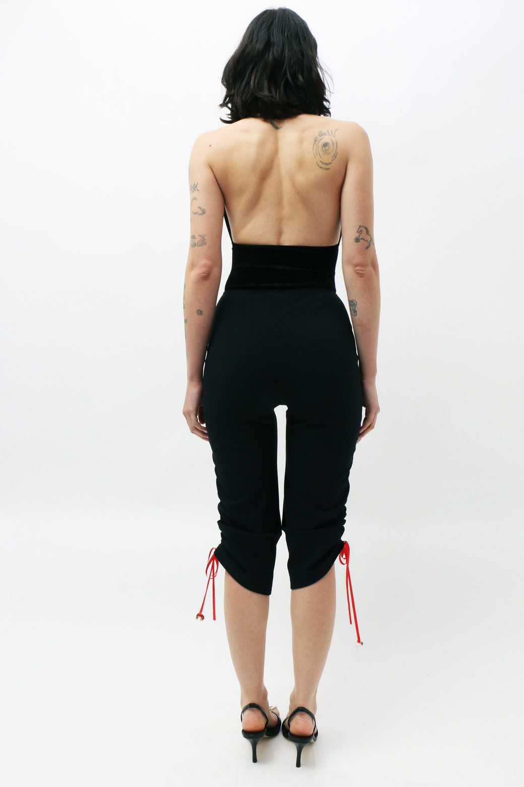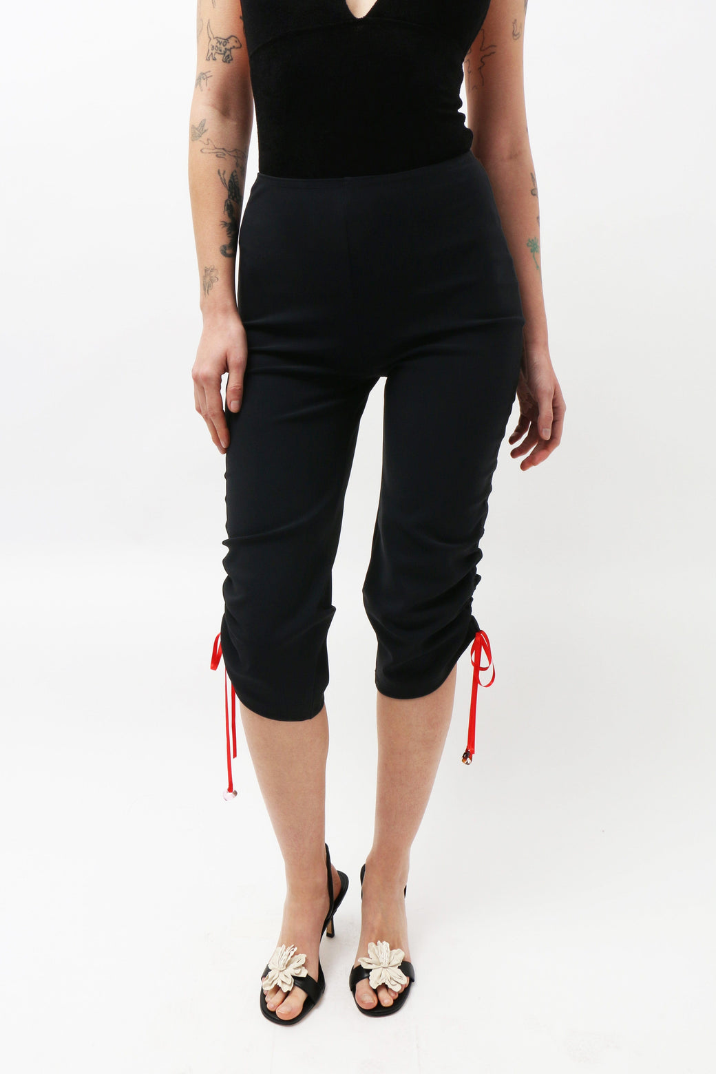 Black spandex capri pants with gathered ribbon along the bottom hem and adjustable drawstring ribbons on the sides for customizable length. Featuring unique borosilicate glass buttons along the ribbons. Made from stretch jersey deadstock fabric sourced from Lucille Thièvre's French fashion house.