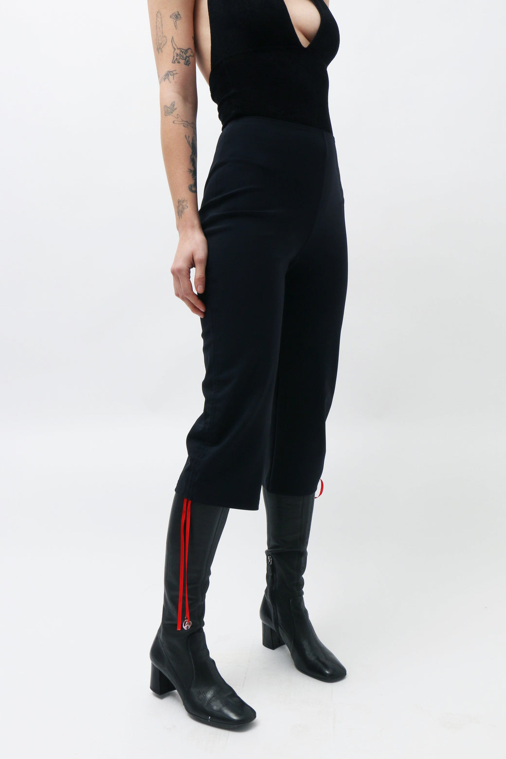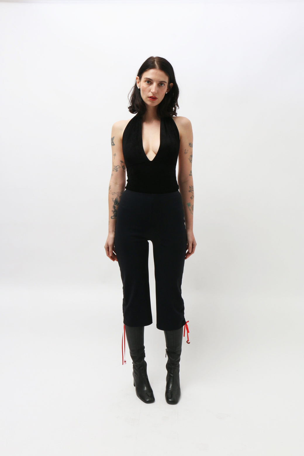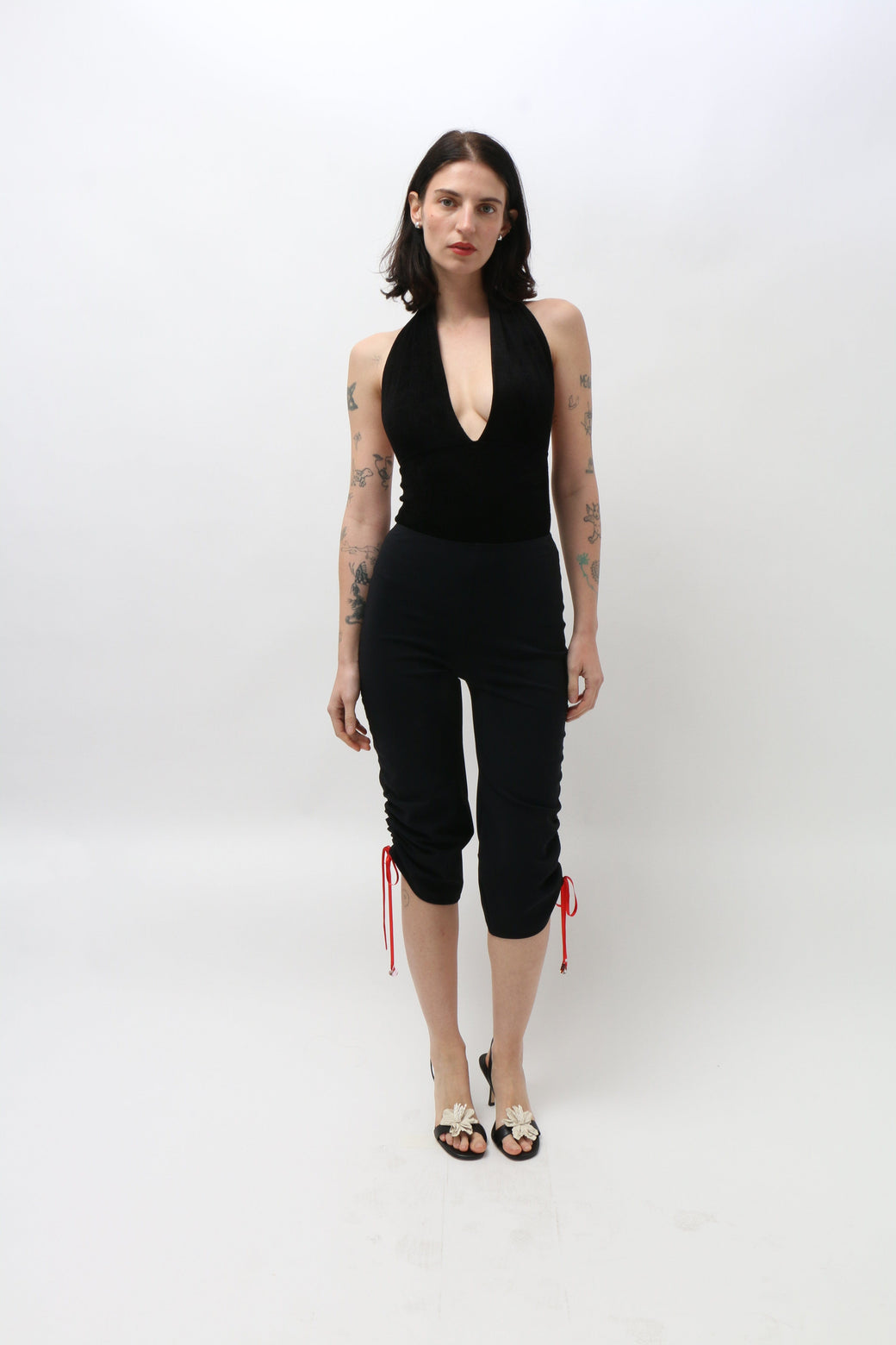Black spandex capri pants with gathered ribbon along the bottom hem and adjustable drawstring ribbons on the sides for customizable length. Featuring unique borosilicate glass buttons along the ribbons. Made from stretch jersey deadstock fabric sourced from Lucille Thièvre's French fashion house.