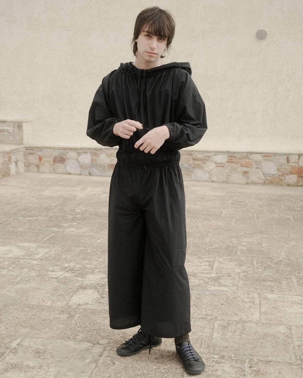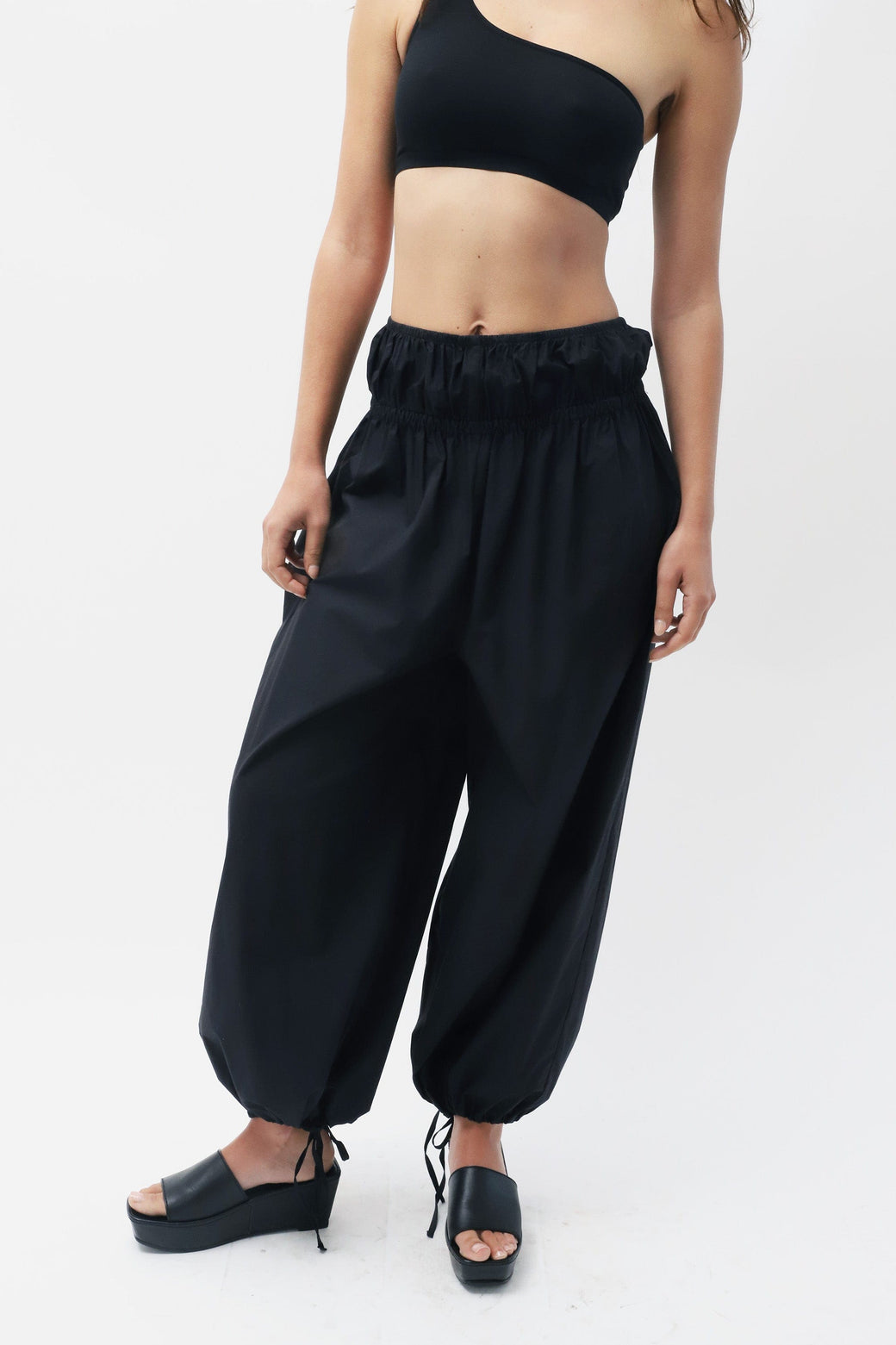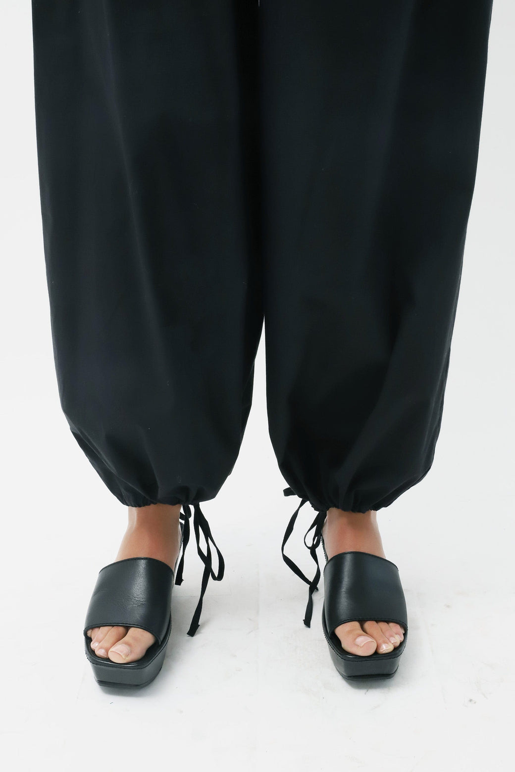 High-waisted black cotton poplin pants designed with a relaxed wide-leg fit. Featuring a drawstring closure and a double elasticated waistband.