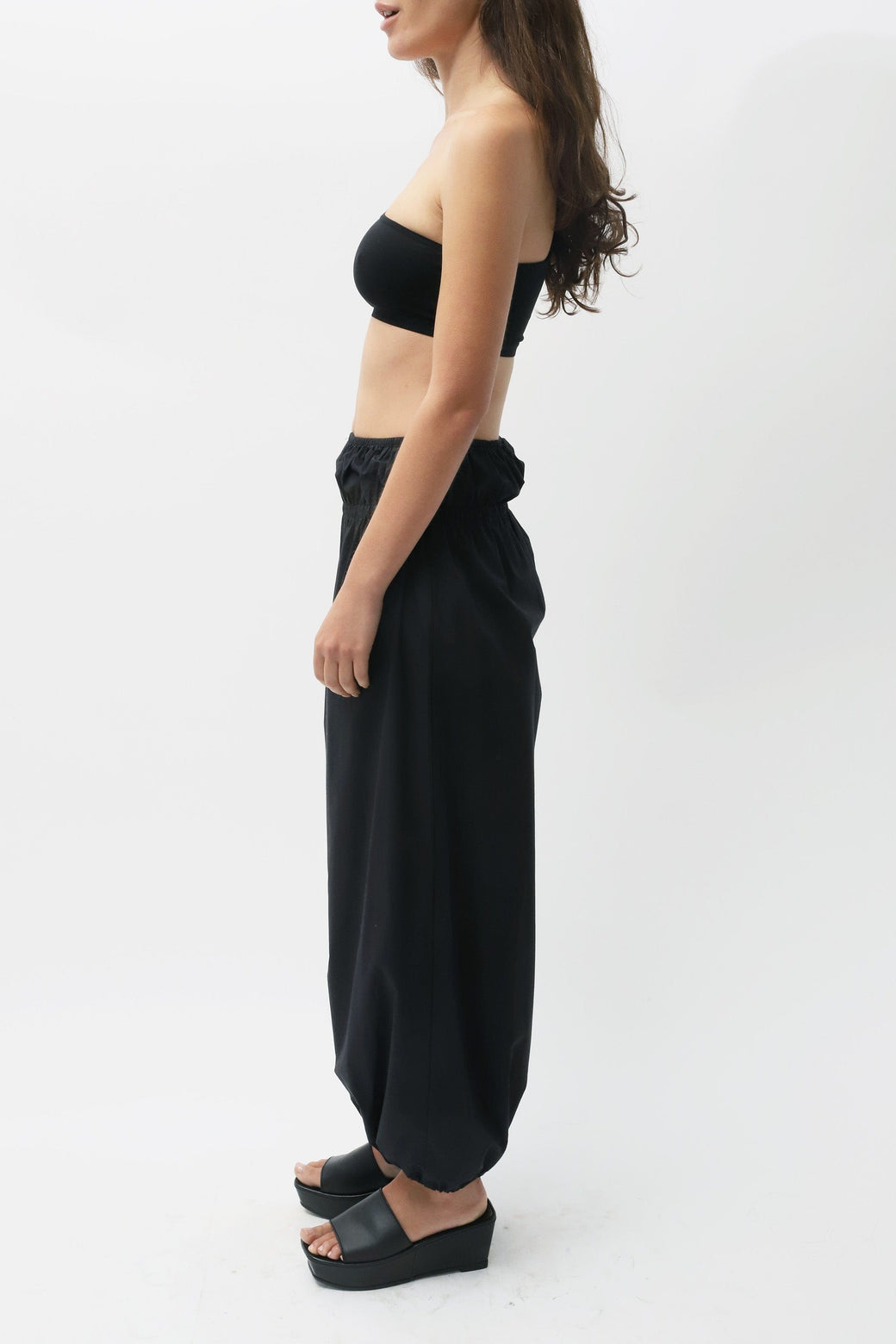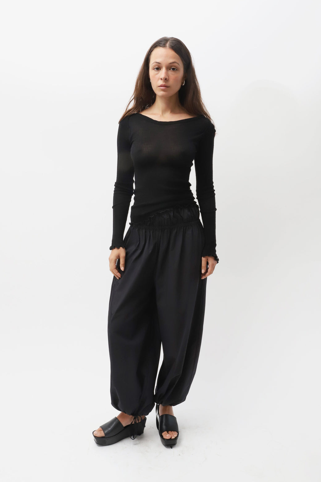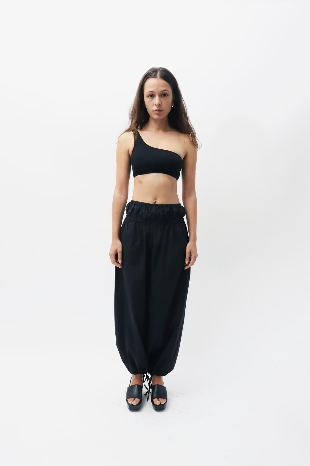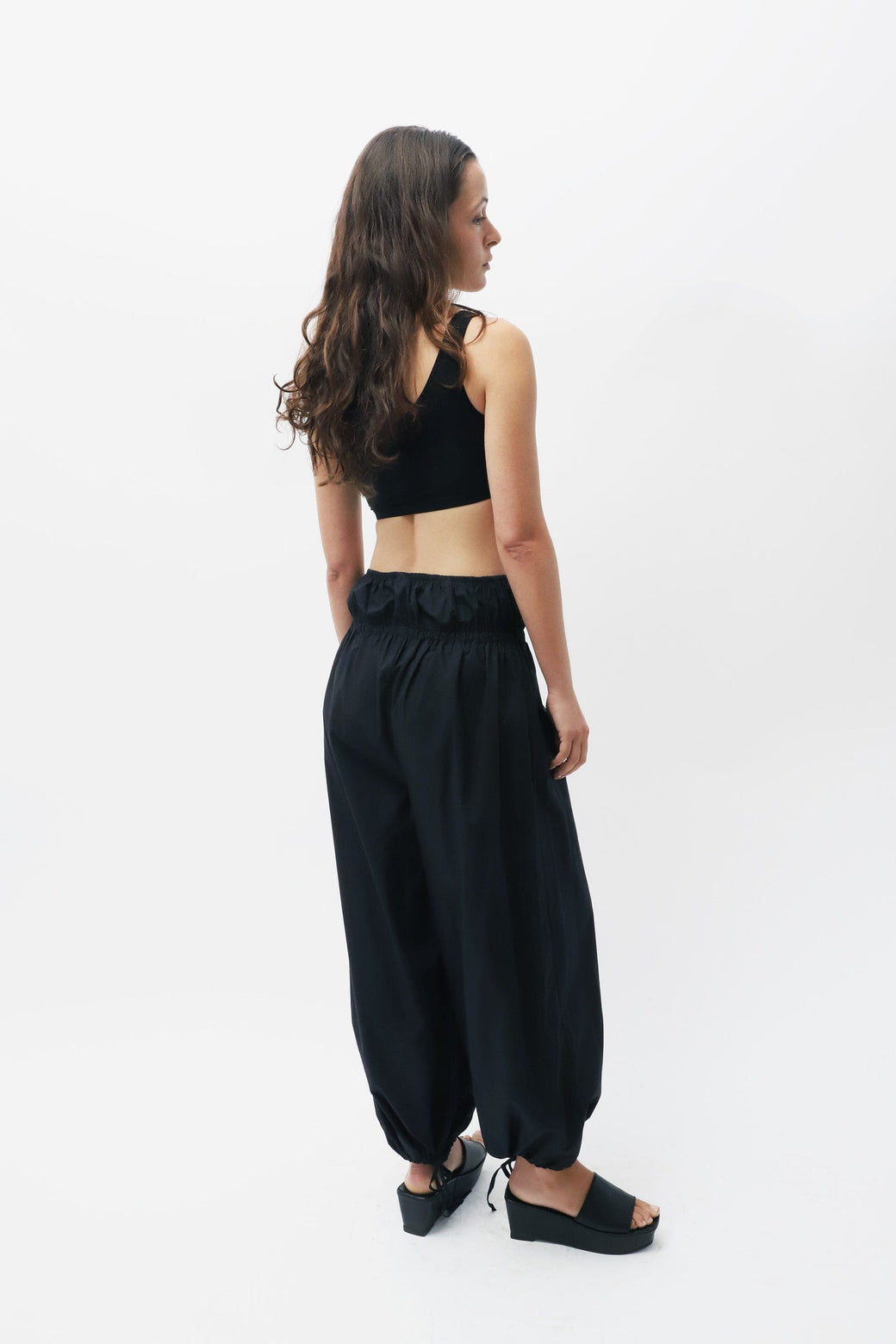 High-waisted black cotton poplin pants designed with a relaxed wide-leg fit. Featuring a drawstring closure and a double elasticated waistband.