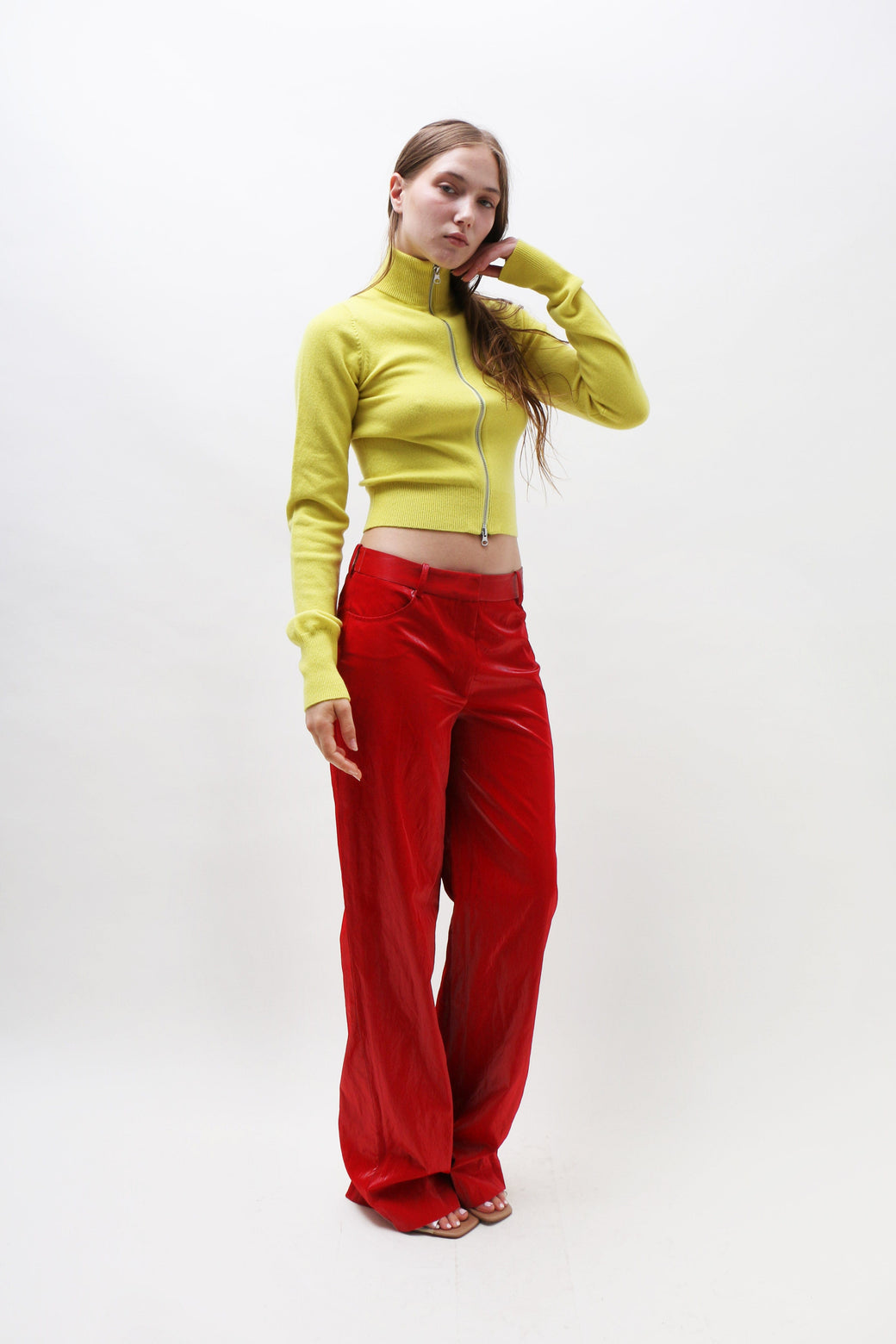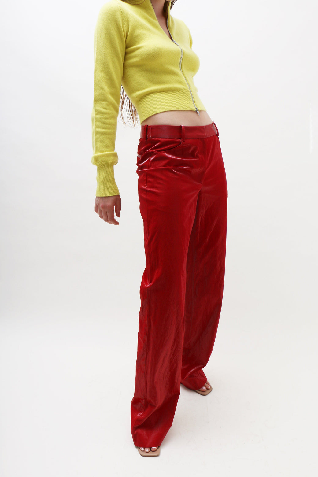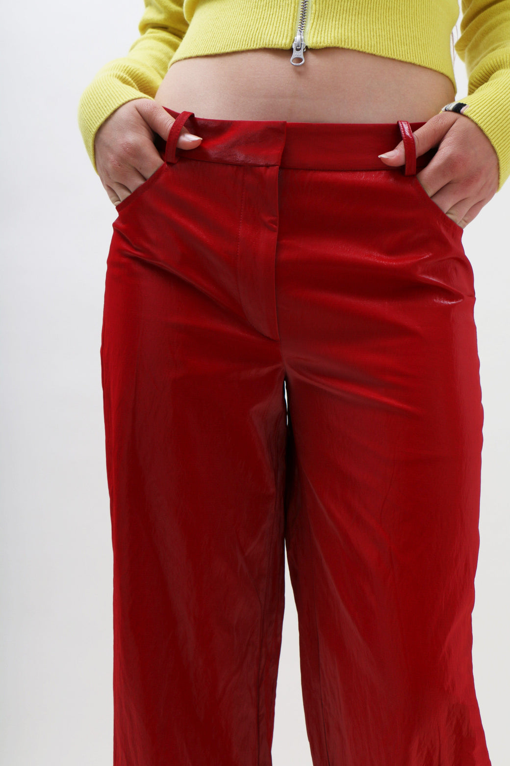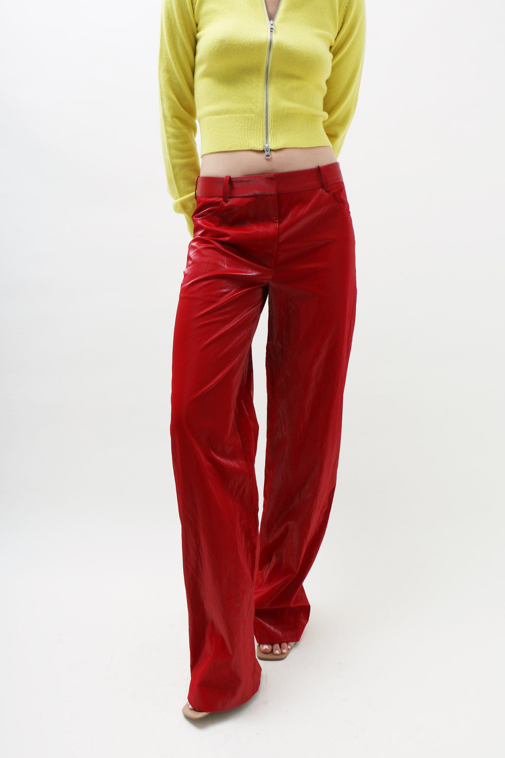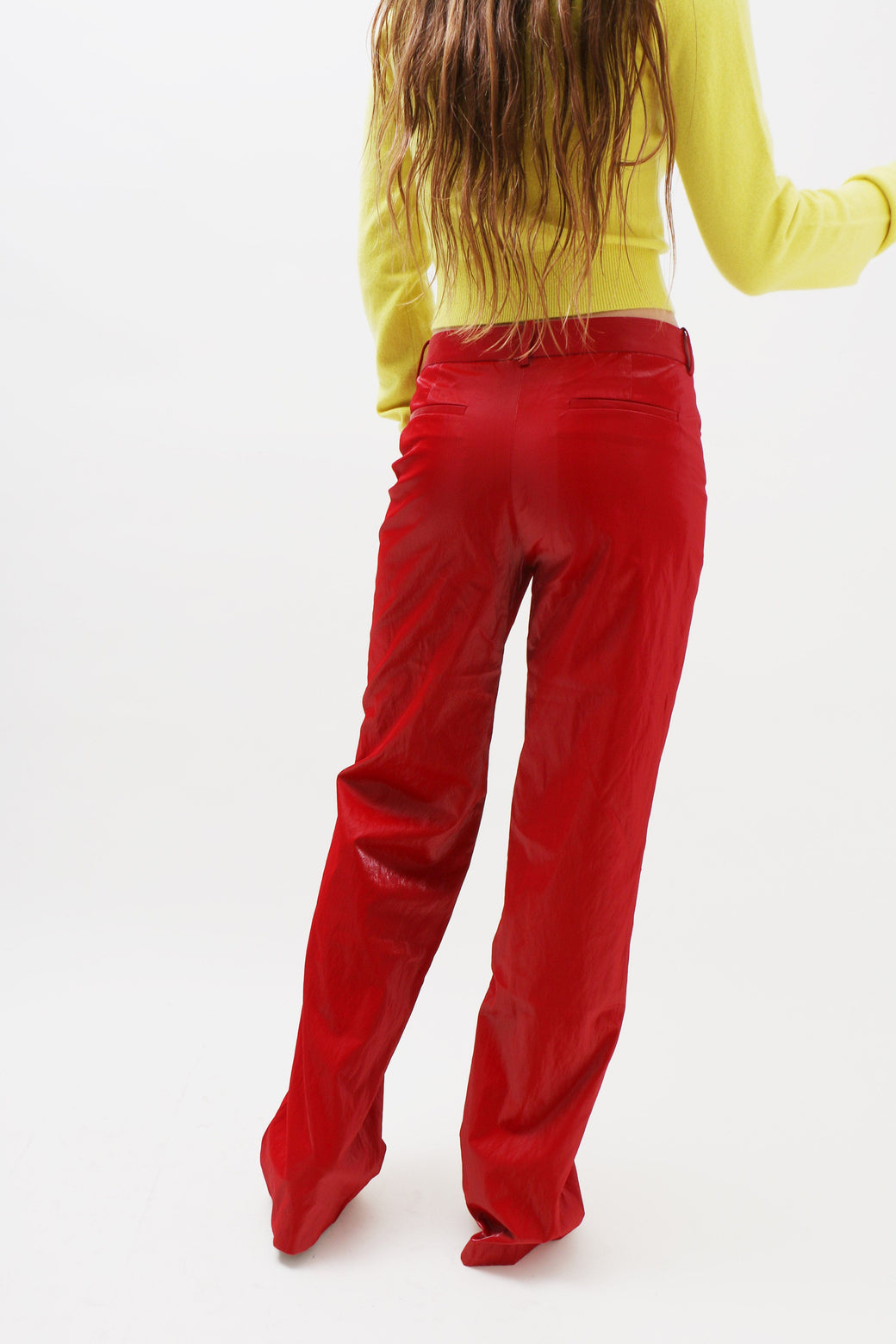 High-gloss crimson red trousers crafted from rainwear fabric, offering a relaxed fit with a straight leg and low-rise waist. Designed with bound seams, slant side pockets at the waist, and welt pockets at the back. Finished with a zip fly and hook-and-bar closure.