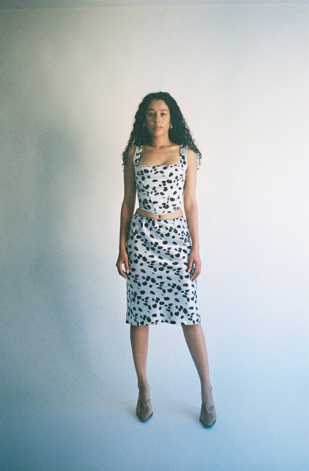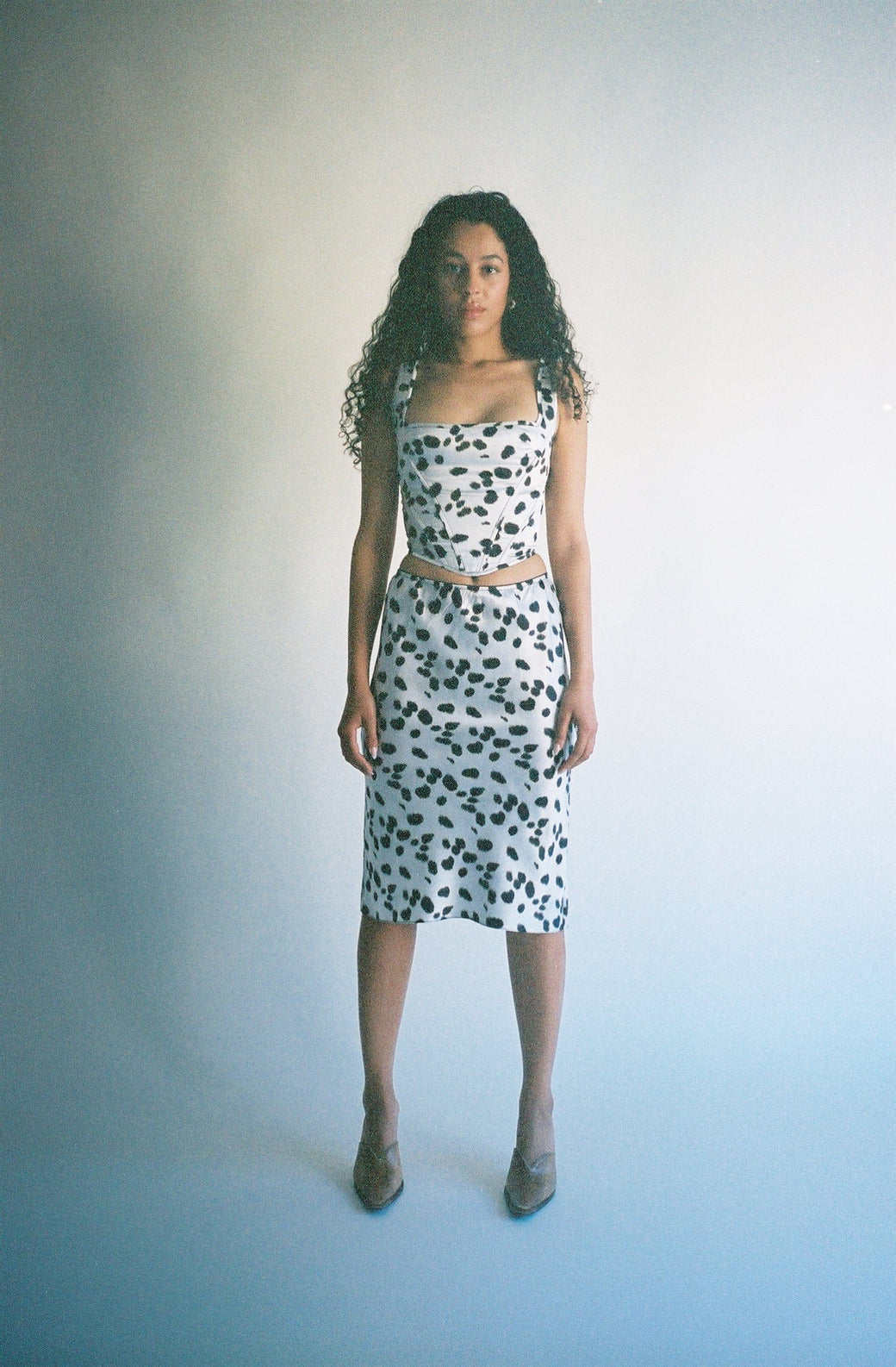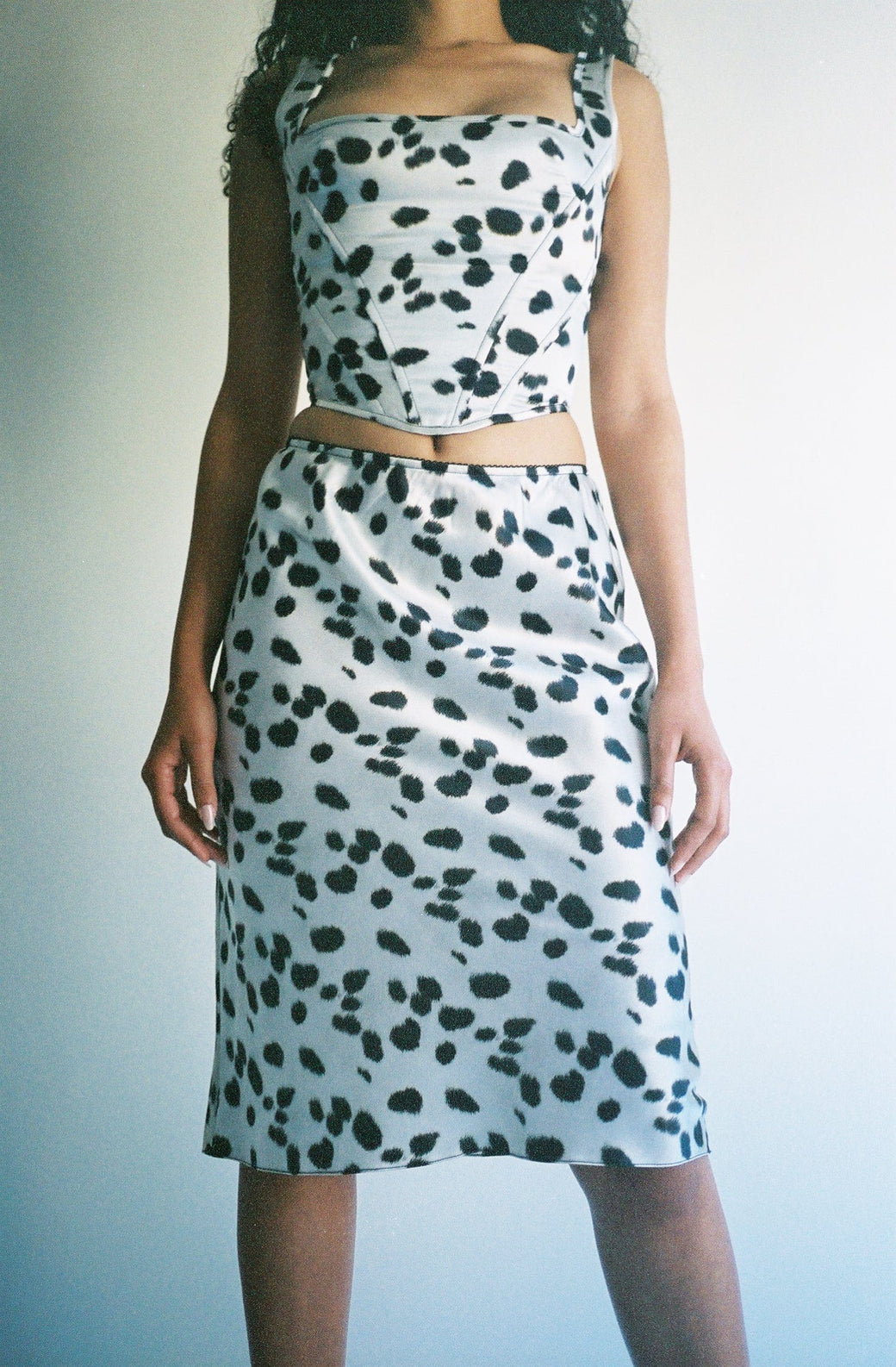 Mid length slip skirt in a satin dalmation print. Delicate lace trimming along elastic waistline. Could be worn high or low rise. Wear it as a set with the matching Dalmation Corset Top, or on it's own. Made in USA.
