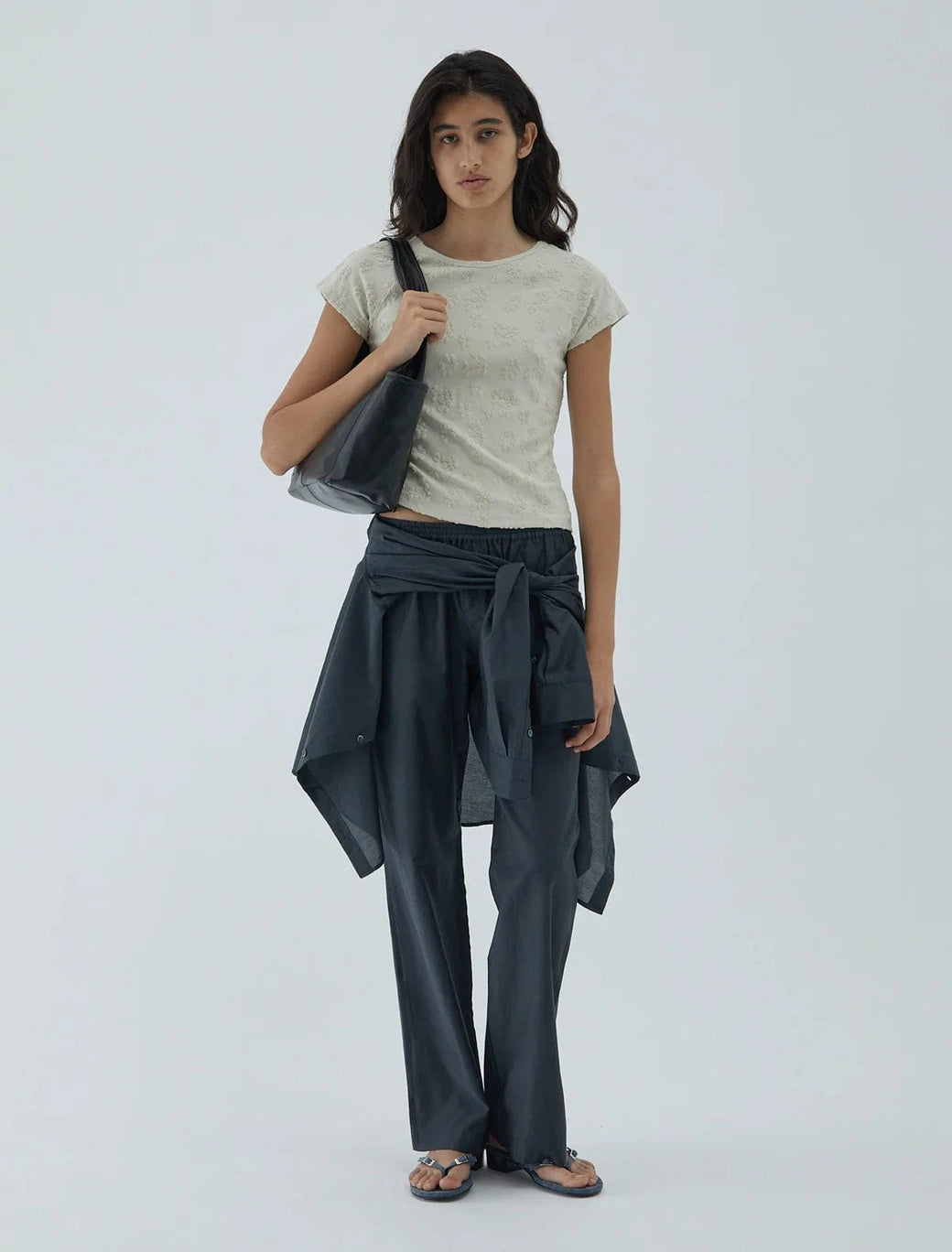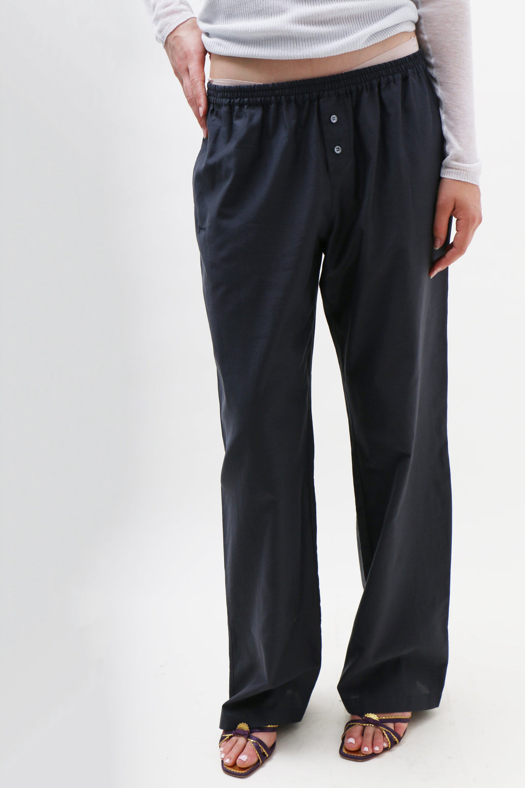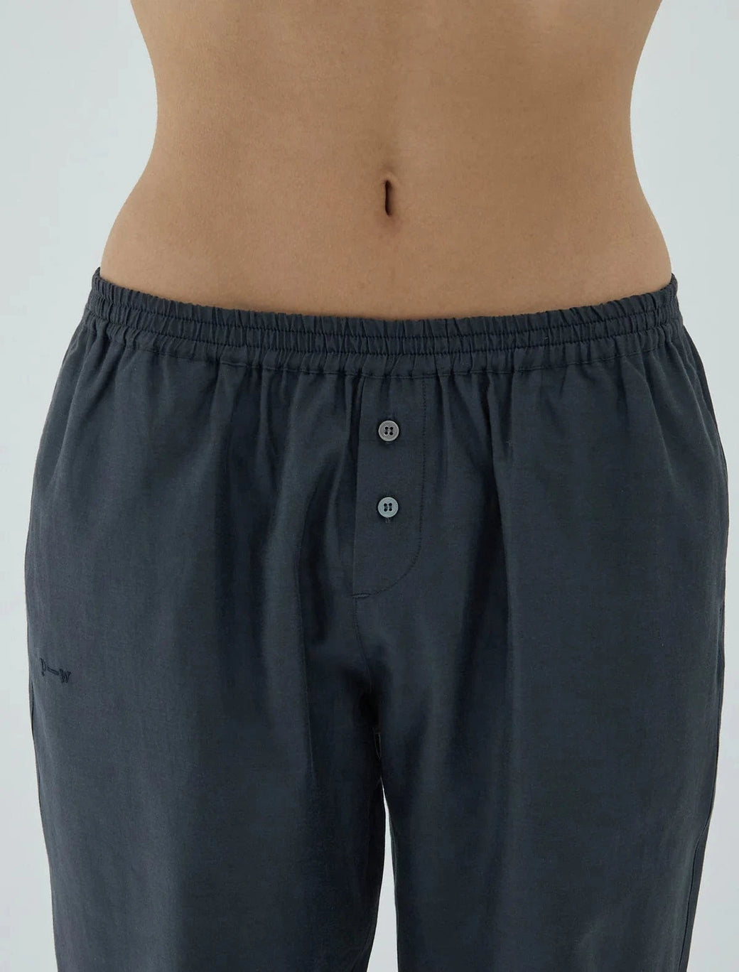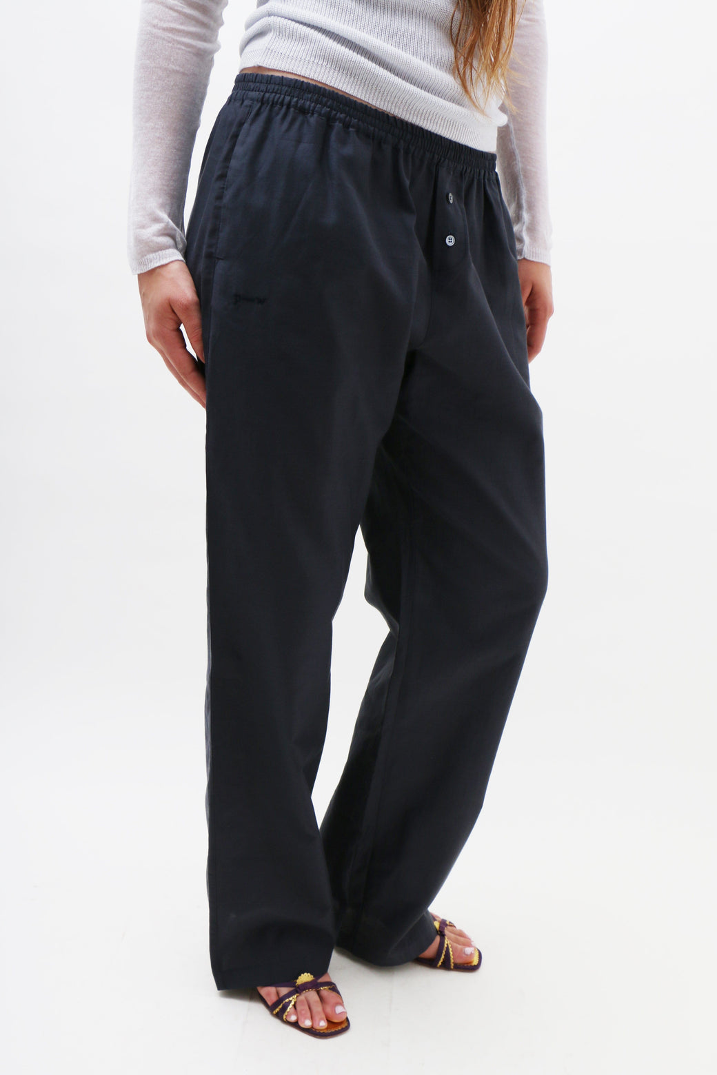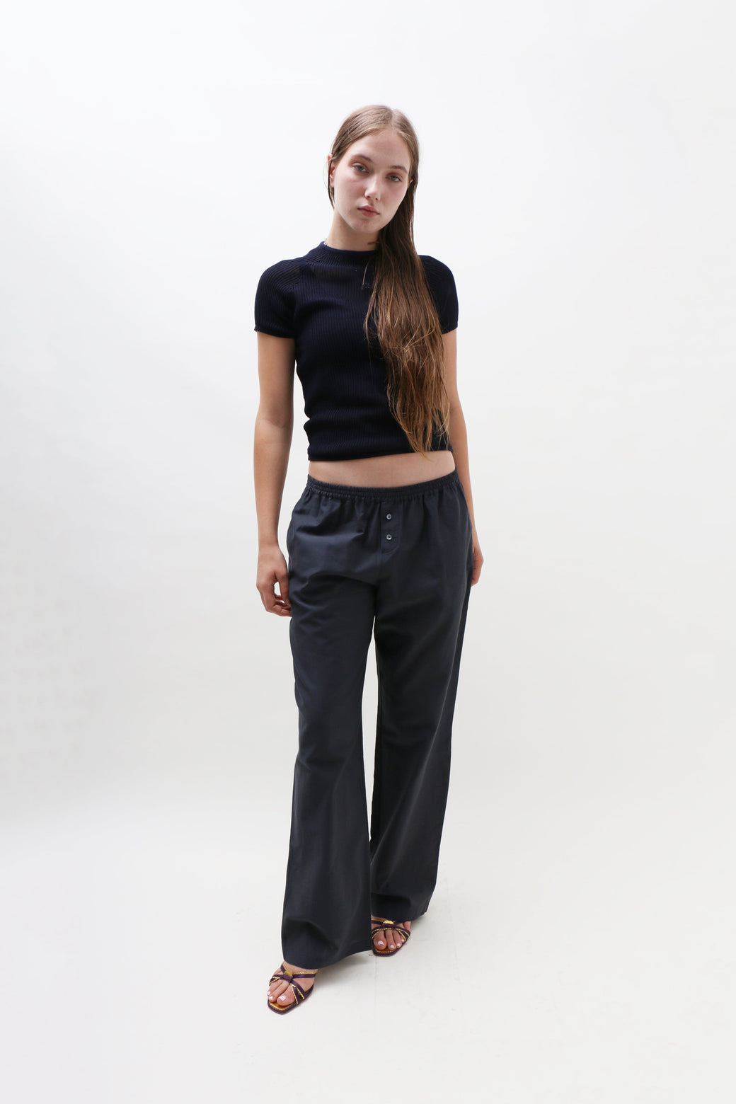 Delicate wide-leg trousers with an easy, fluid shape. Elastic waistband for comfort, finished with faux button detailing. Subtle PW embroidery at the waist. The fabric is lightweight and softly structured.