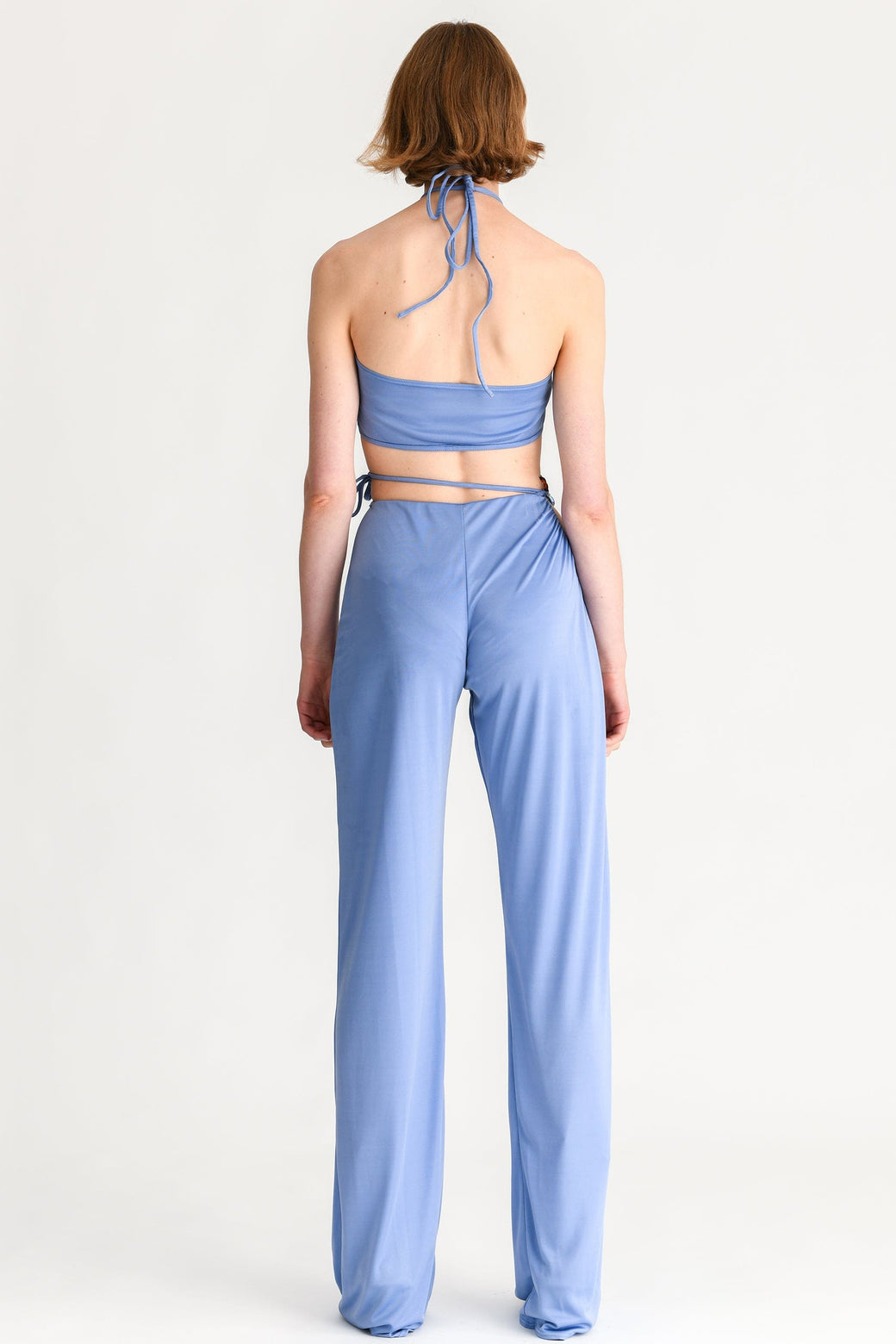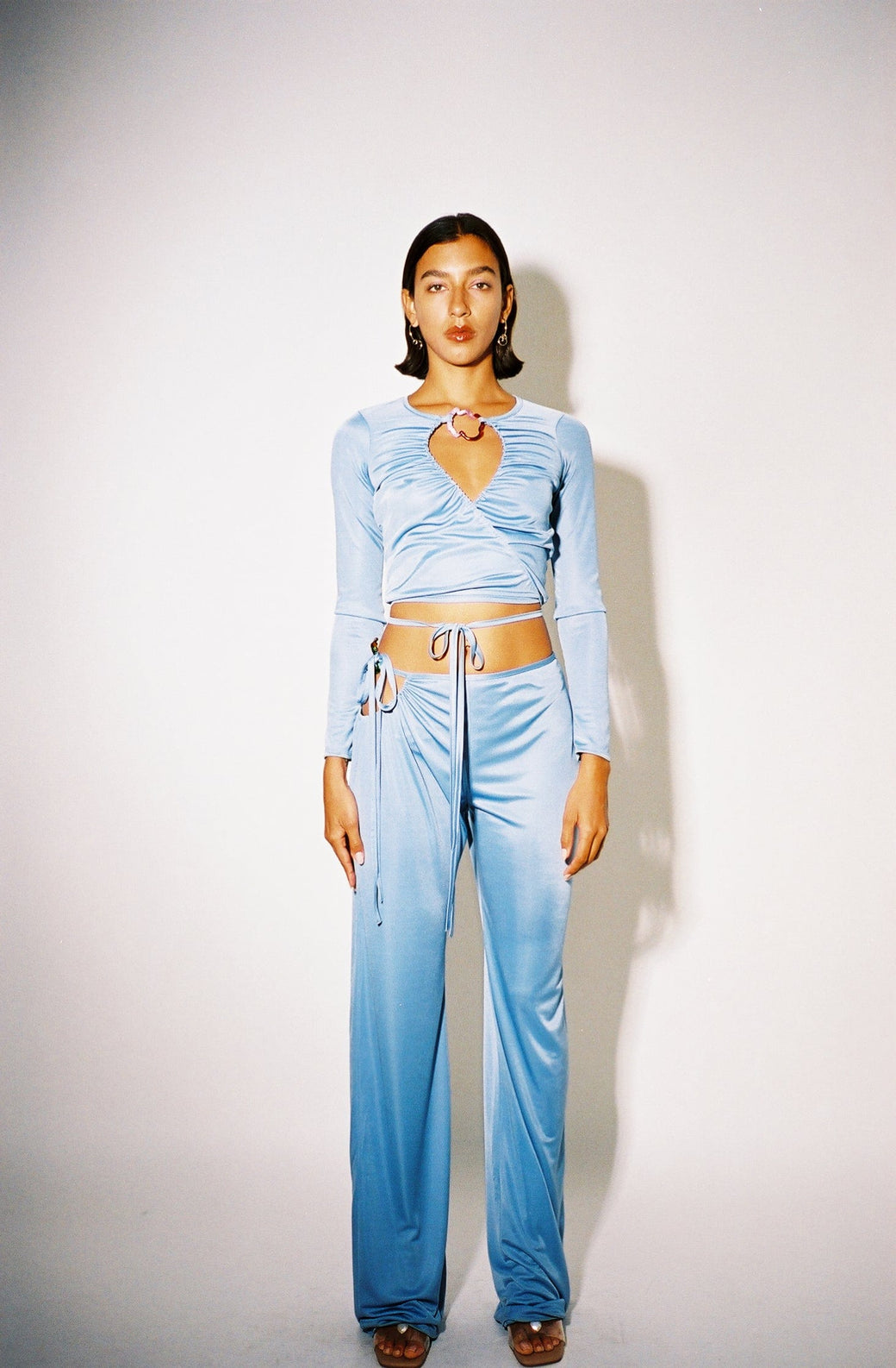 Glass buckle wide leg pants with side cut-out. Iris blue slinky jersey with extra-long wrap around tie around the waist. Made using deadstock fabric from a French fashion house. Featuring a suspended borosilicate glass buckle. Each glass buckle is unique due to its artisanal making. Worn with the matching Buckle Pants and Charcoal Low Rise Trouser.