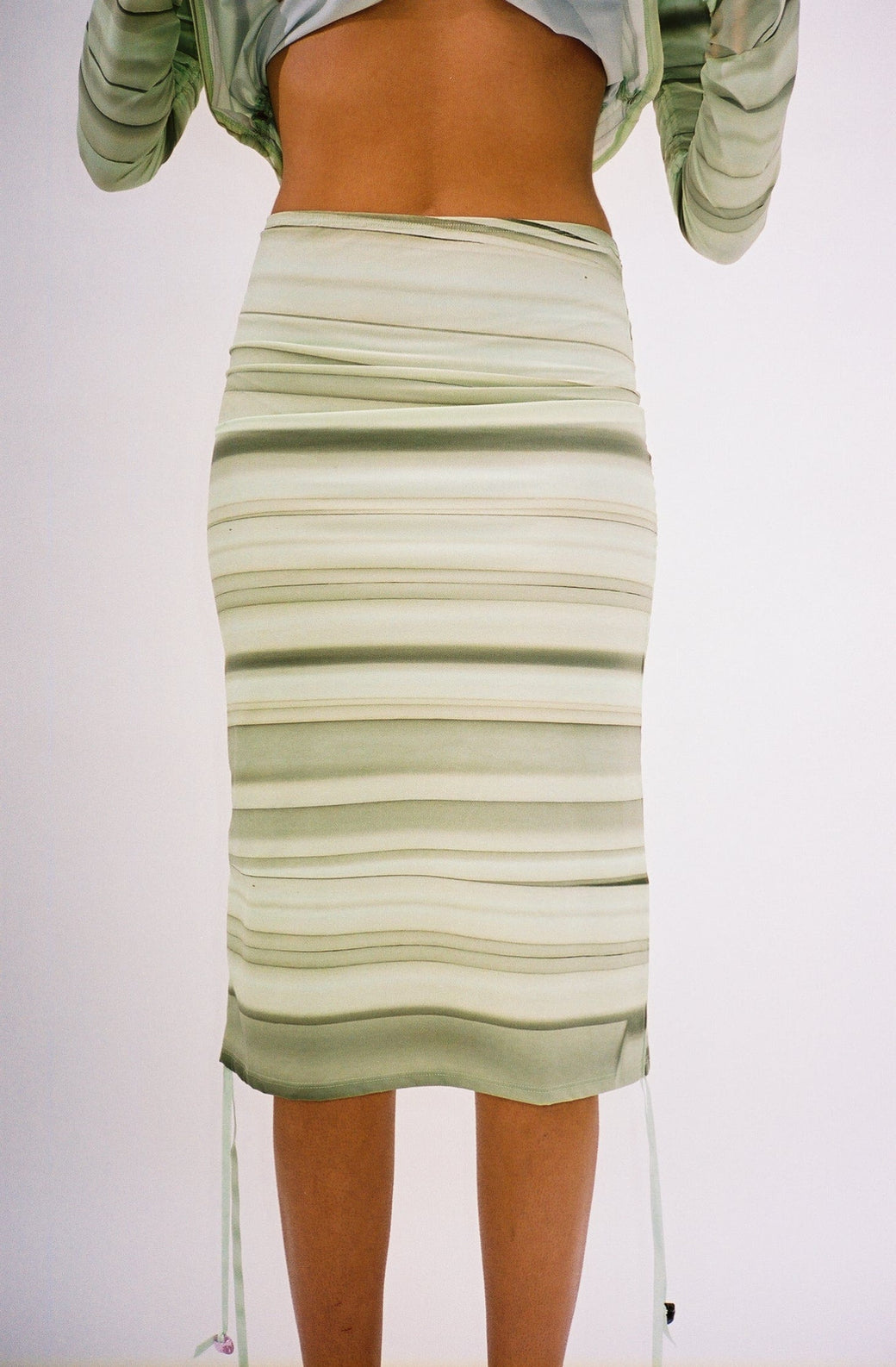 The Betty Skirt features ruching down on both side seams, threaded with ribbon straps to adjust the skirt from a casual midi skirt to a ruffled micro mini to anything in between. Cut from a muted print of light green, moss and off white alternating stripes. Comfortable stretch throughout. Each glass button attached to the ribbons is unique due to its artisanal making, each style will have a unique assortment of colored glass ties.