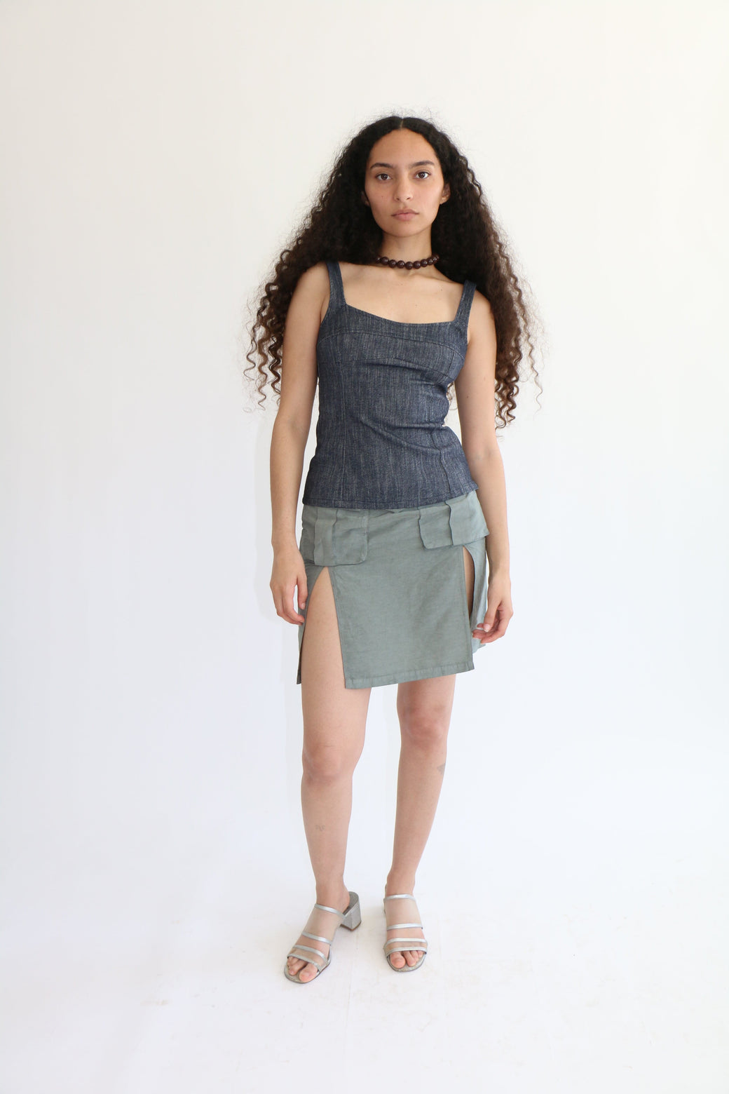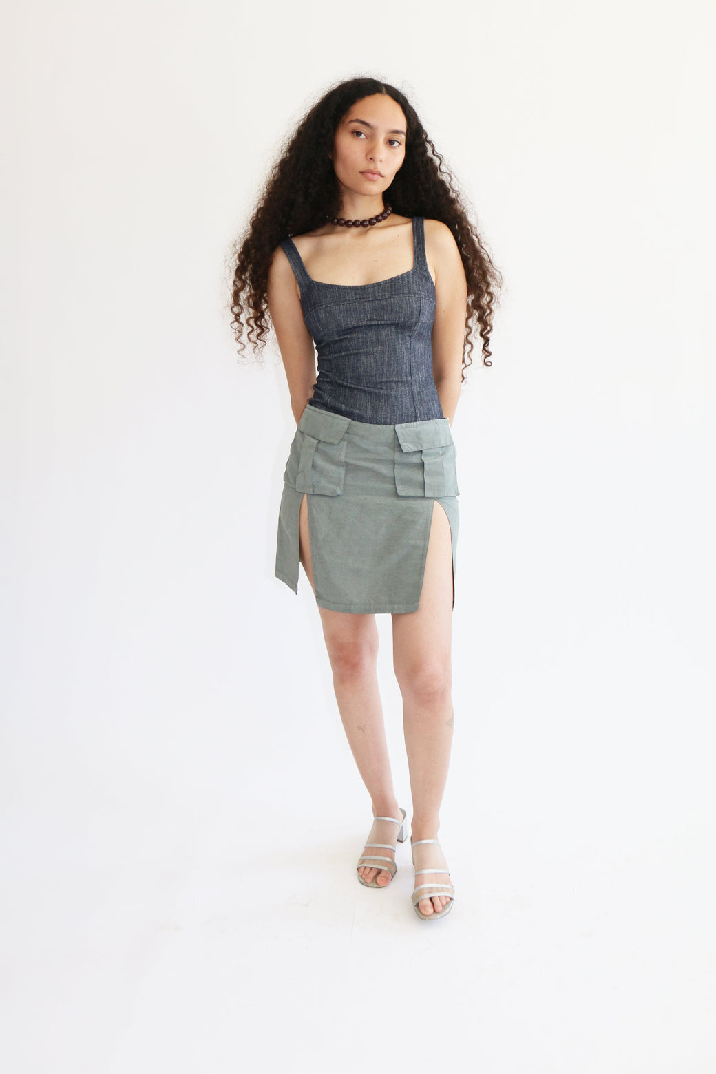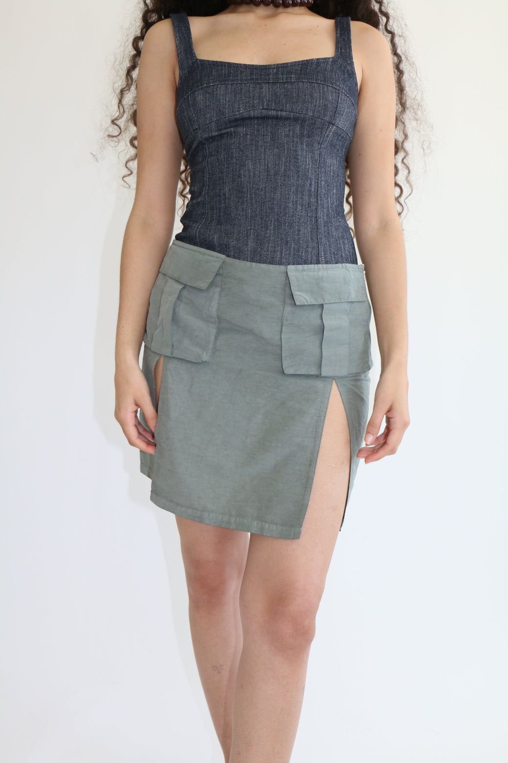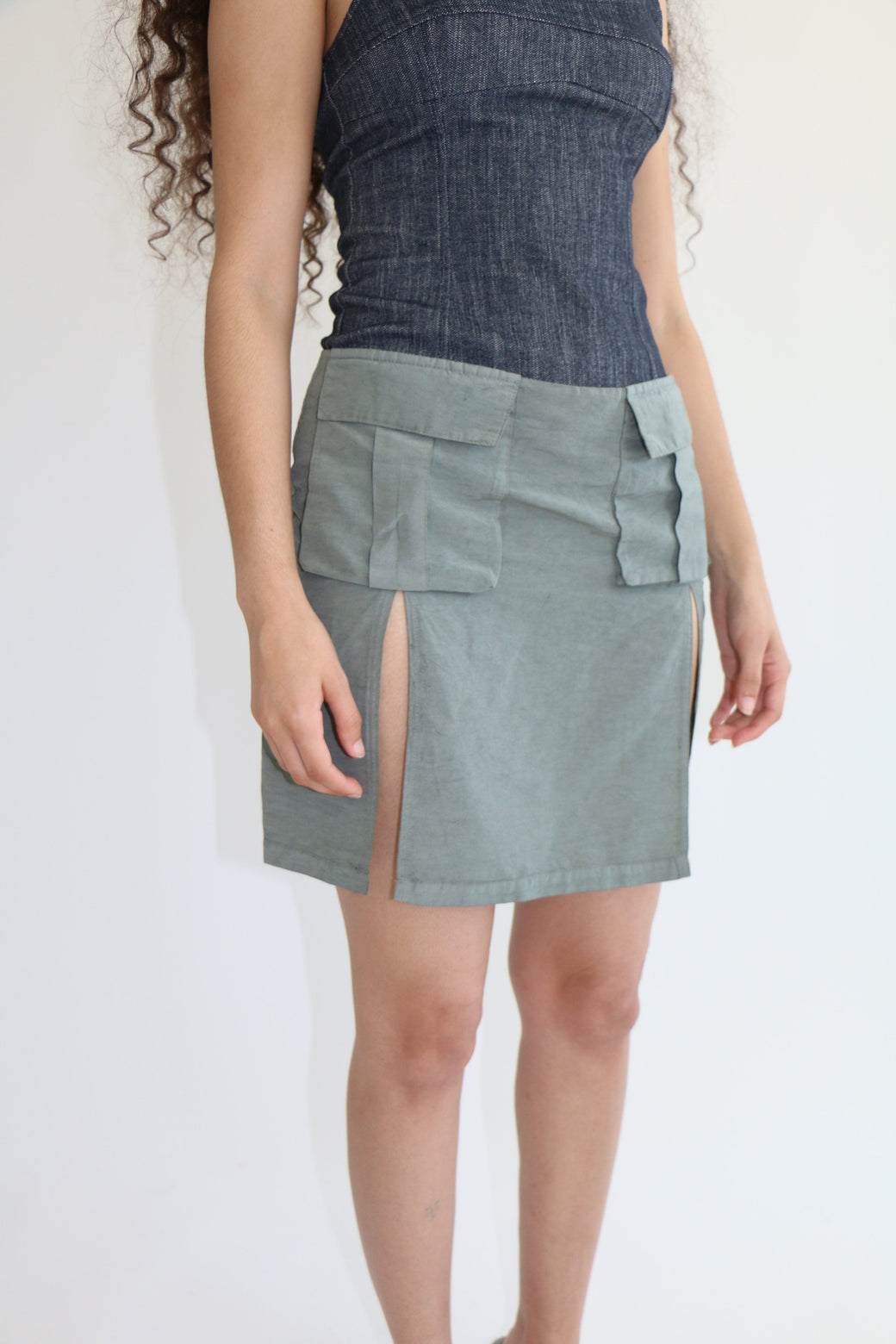 Low-waist skirt with two front square pockets and a back center pocket, complemented by high front slits positioned just below the front pockets. Crafted from structured fabric that blends a subtle nylon effect with lightweight cotton-based material. This garment-dyed piece may display slight color irregularities, adding to its unique charm.
