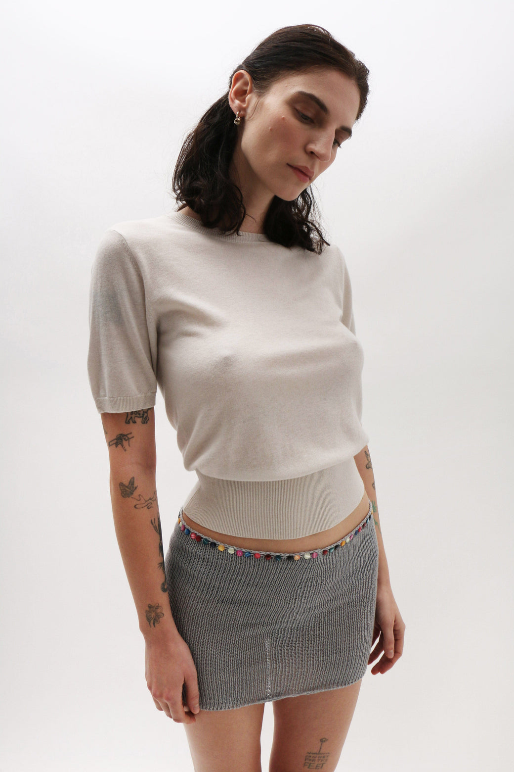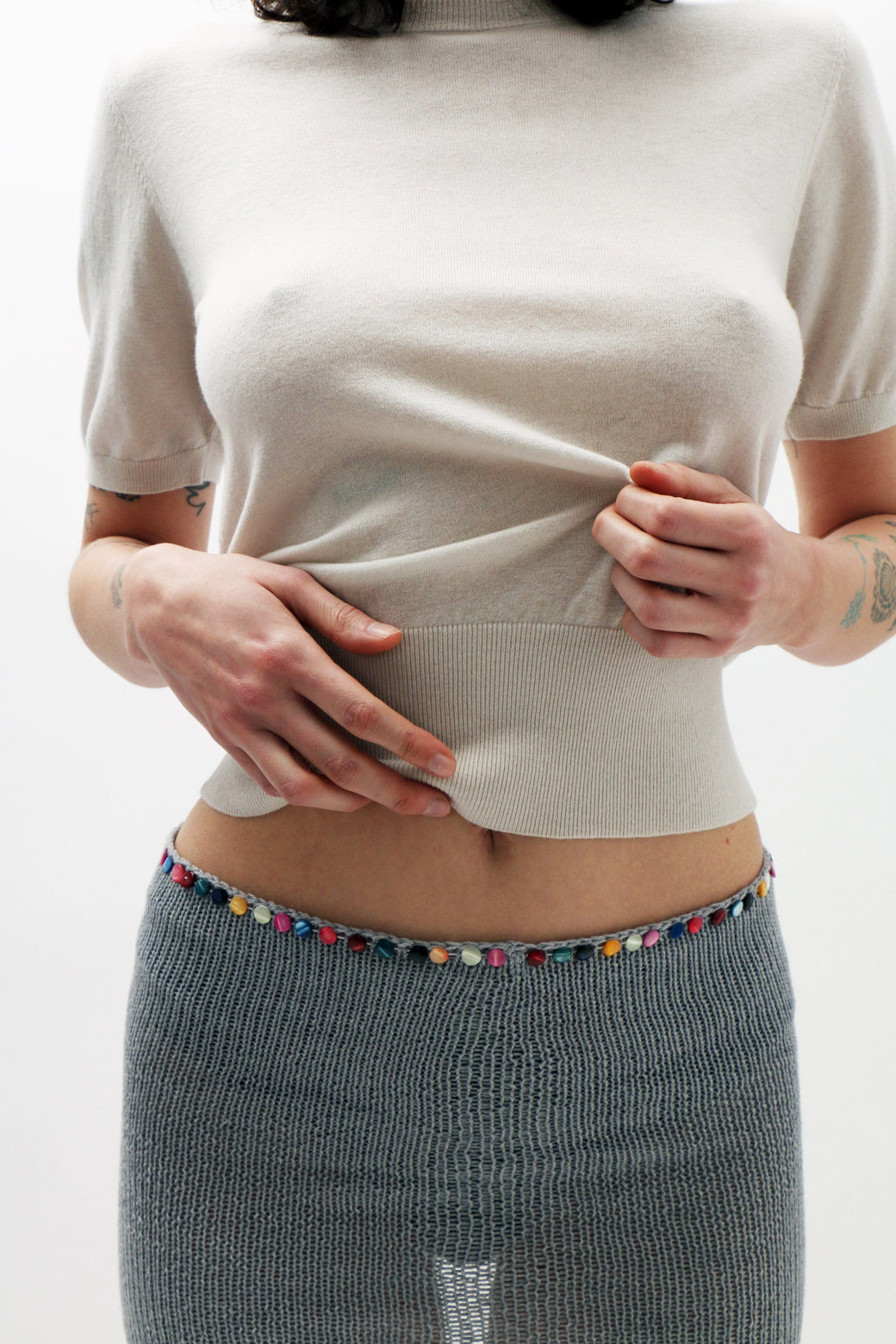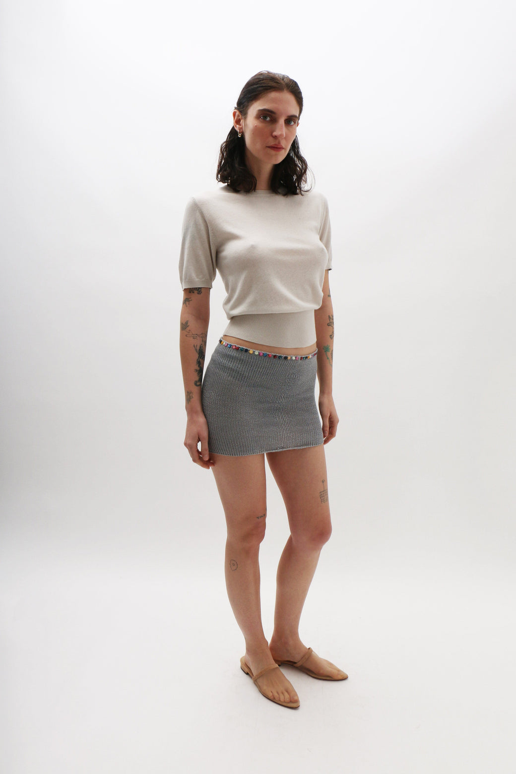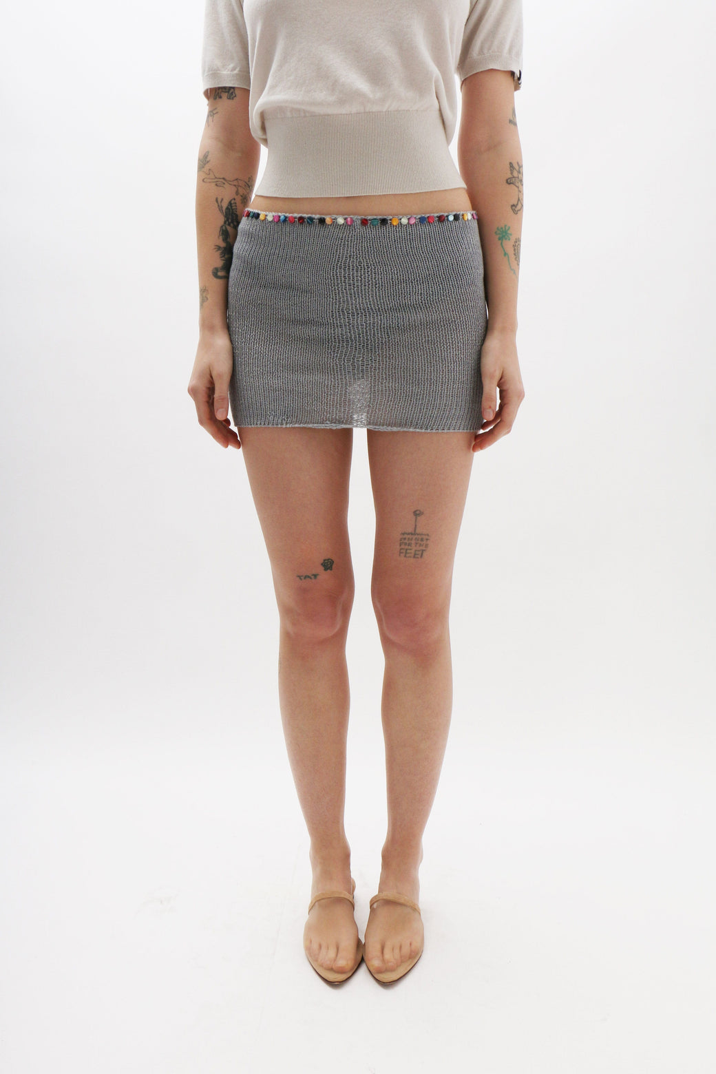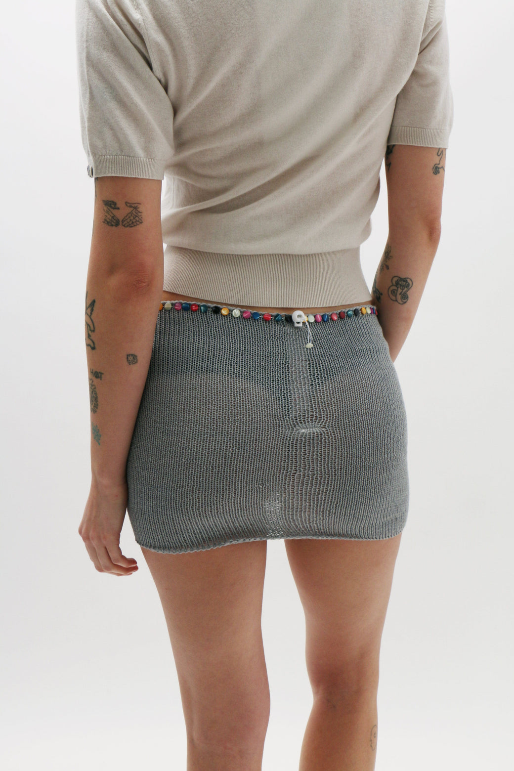 Hand crocheted grey mini skirt. Semi-sheer and finished with colorful deadstock mini buttons lining the waist. This piece can also be worn comfortably as a tube top.