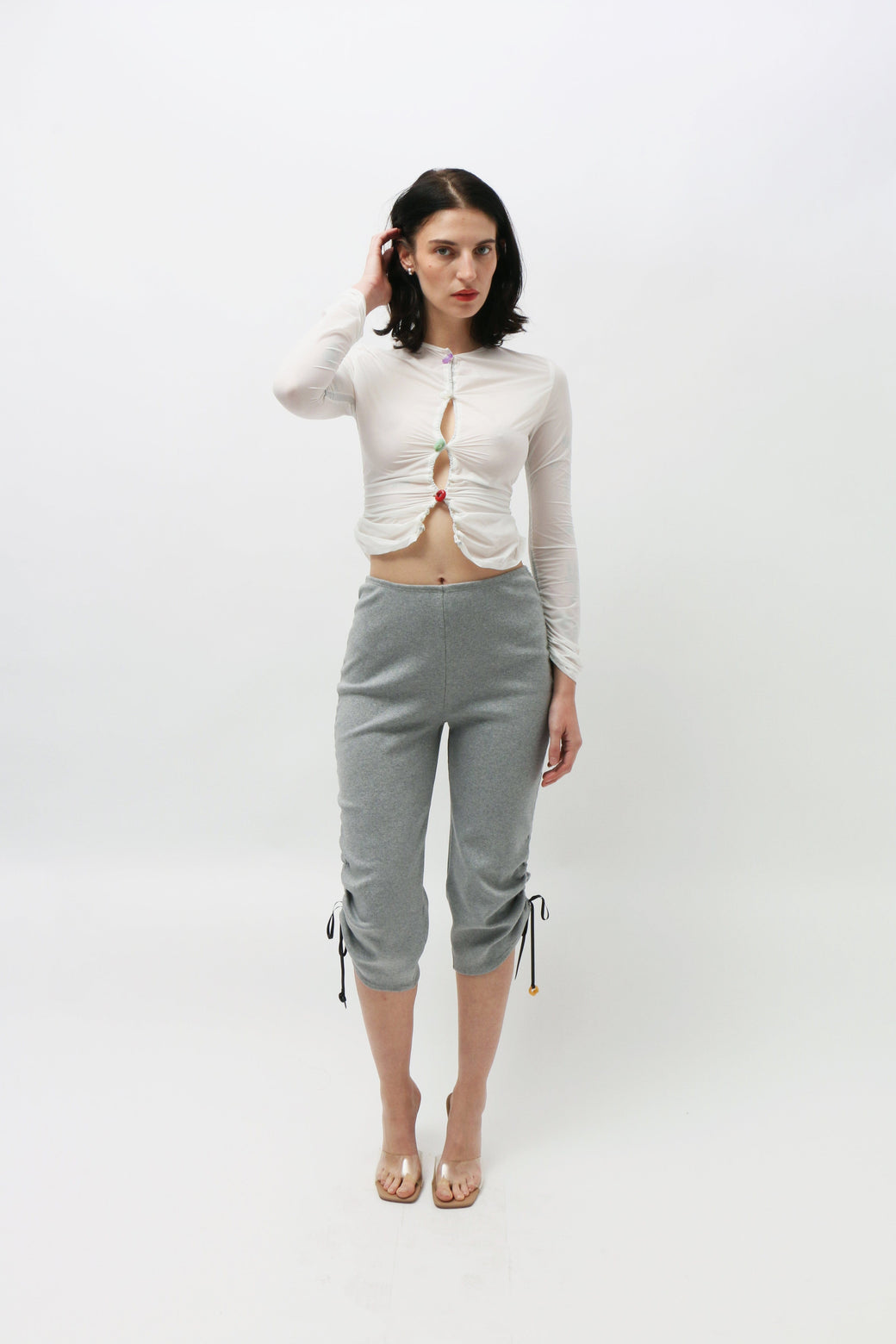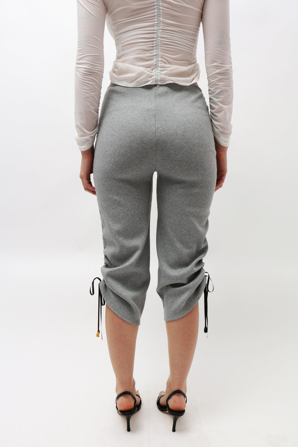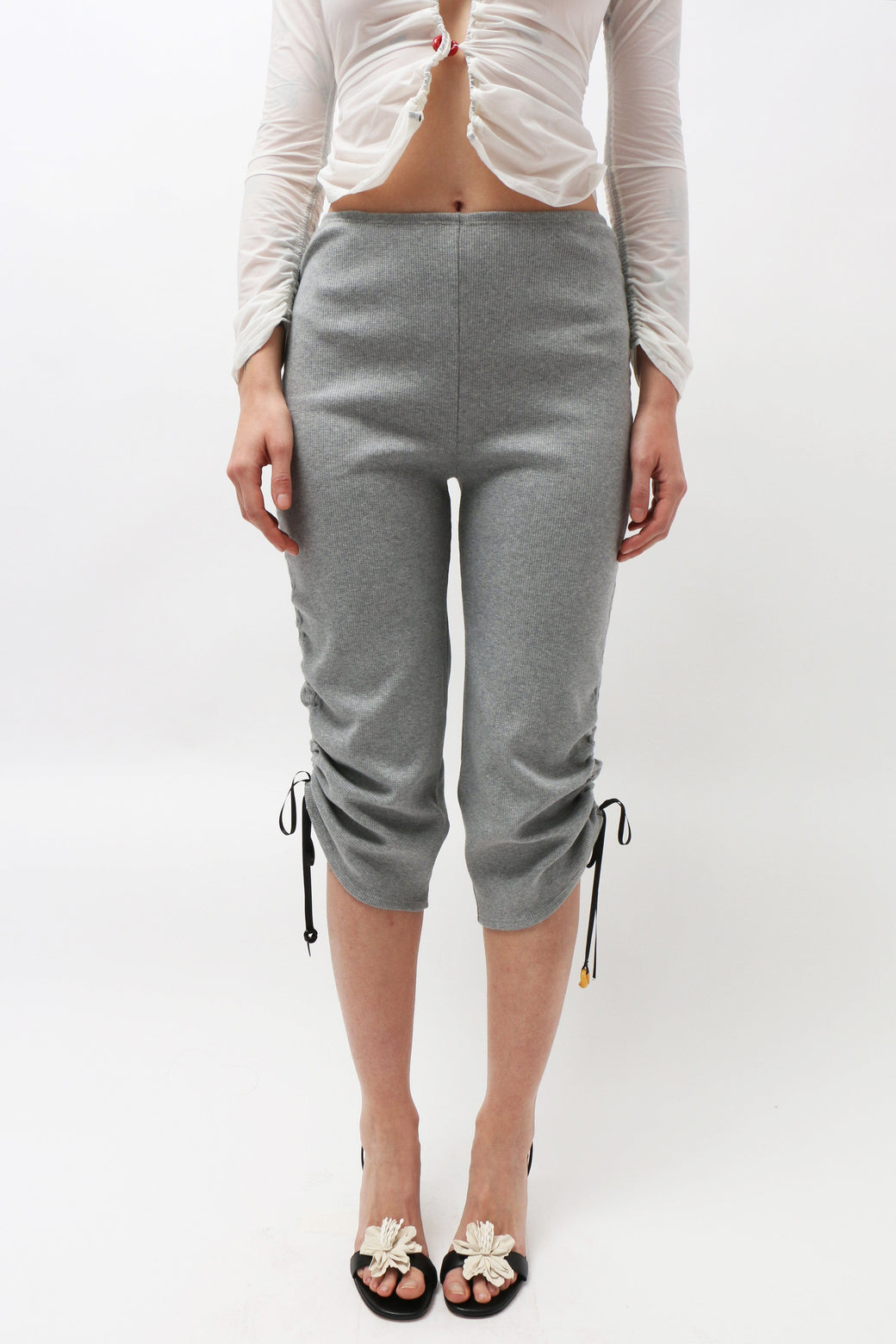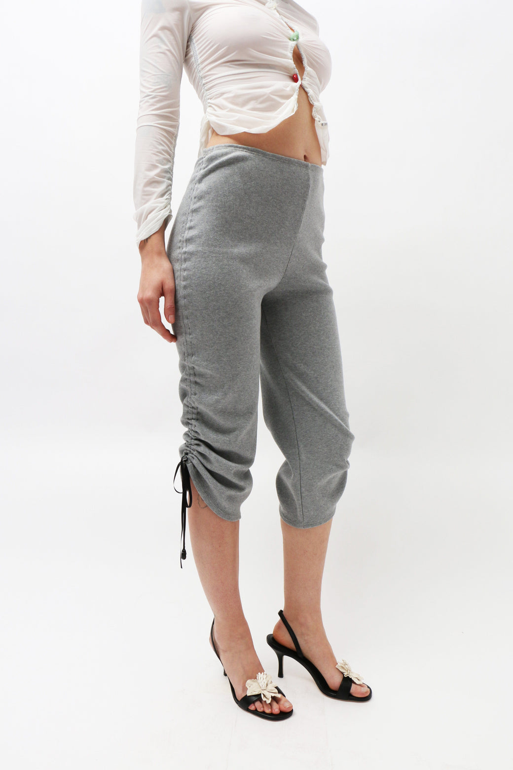 Grey cotton ribbed capri pants with gathered ribbon along the bottom hem and adjustable drawstrings along the sides for a customizable length. Featuring unique borosilicate glass buttons. Made from stretch jersey deadstock fabric sourced from Lucille Thièvre's French fashion house.
