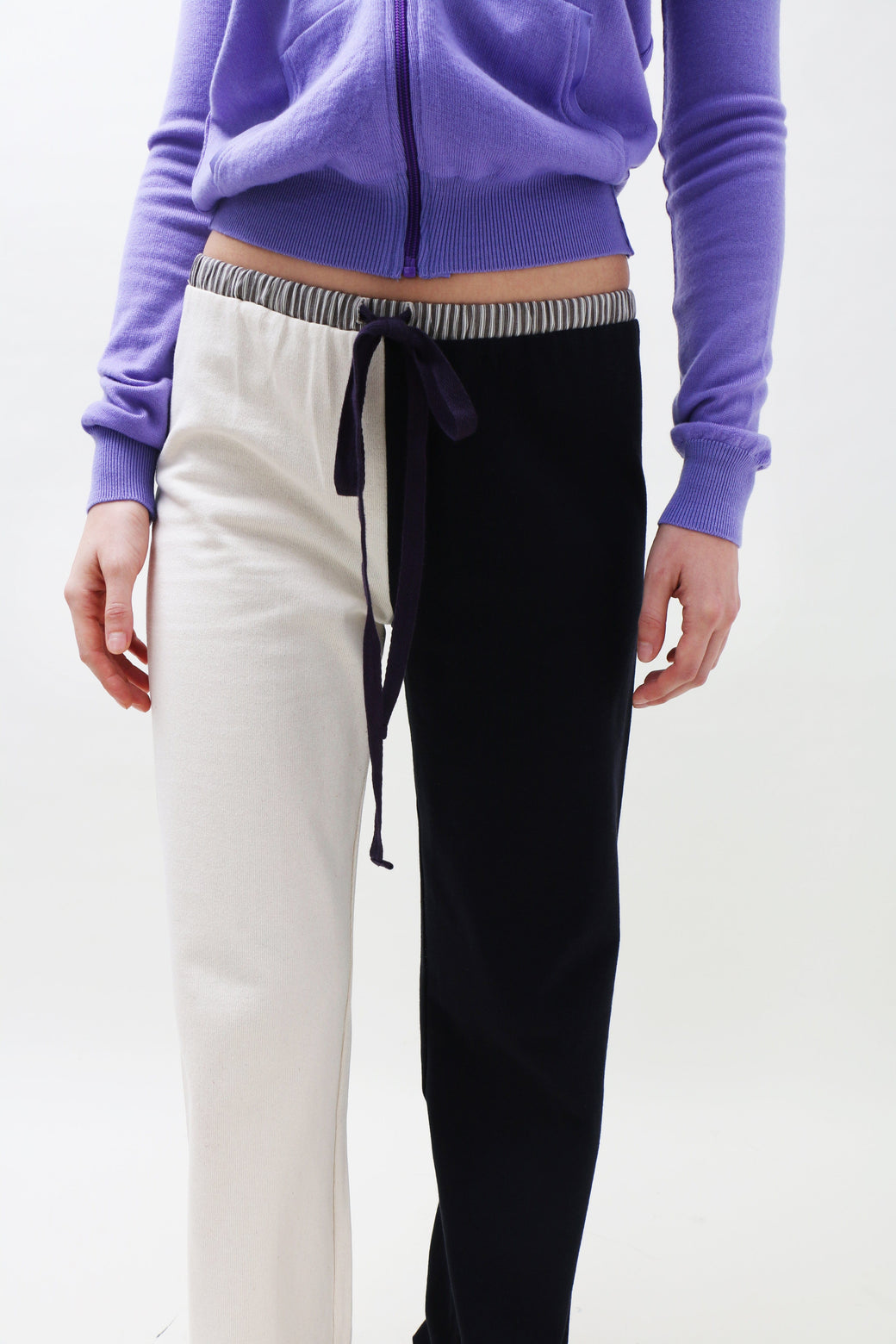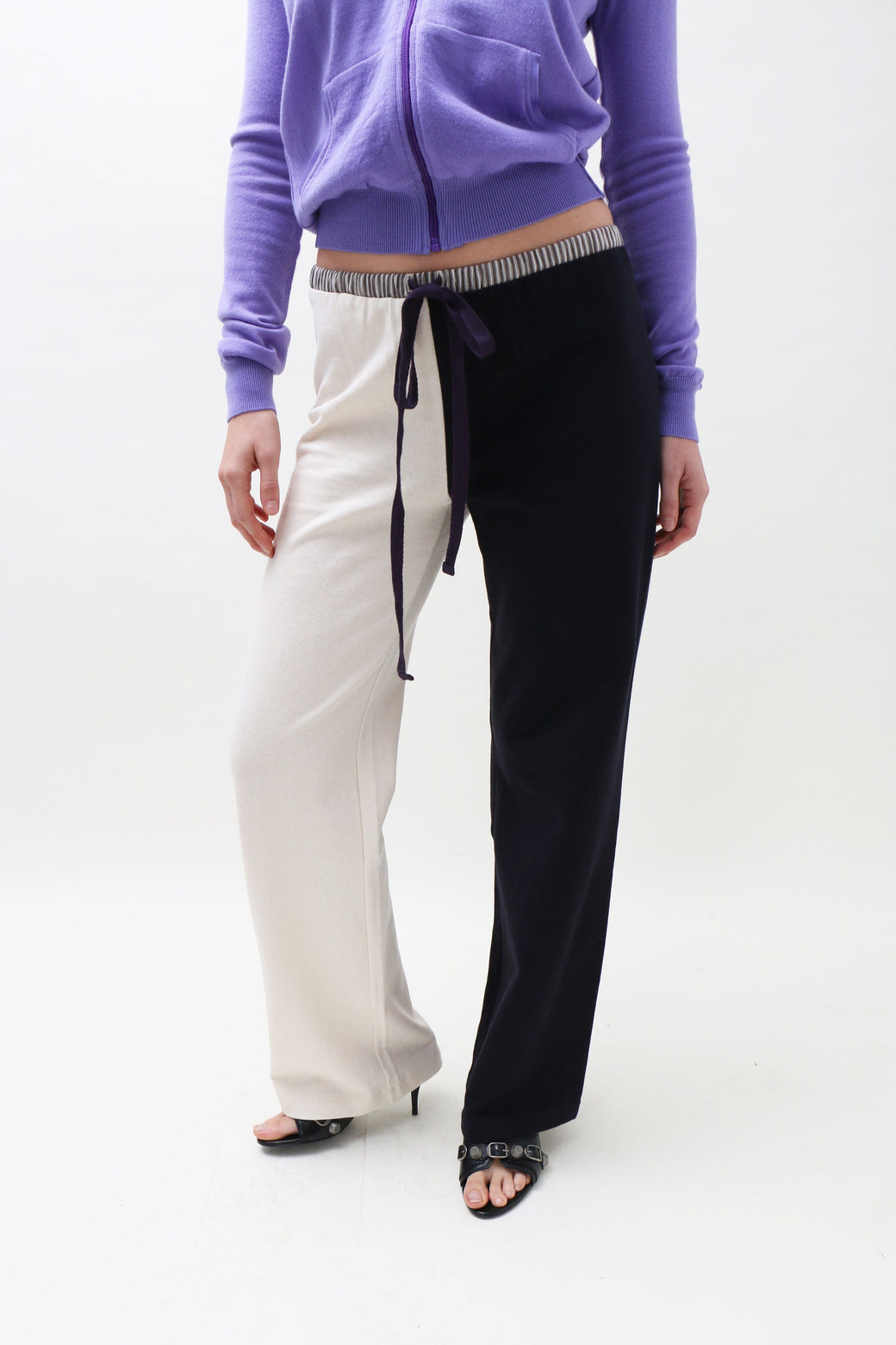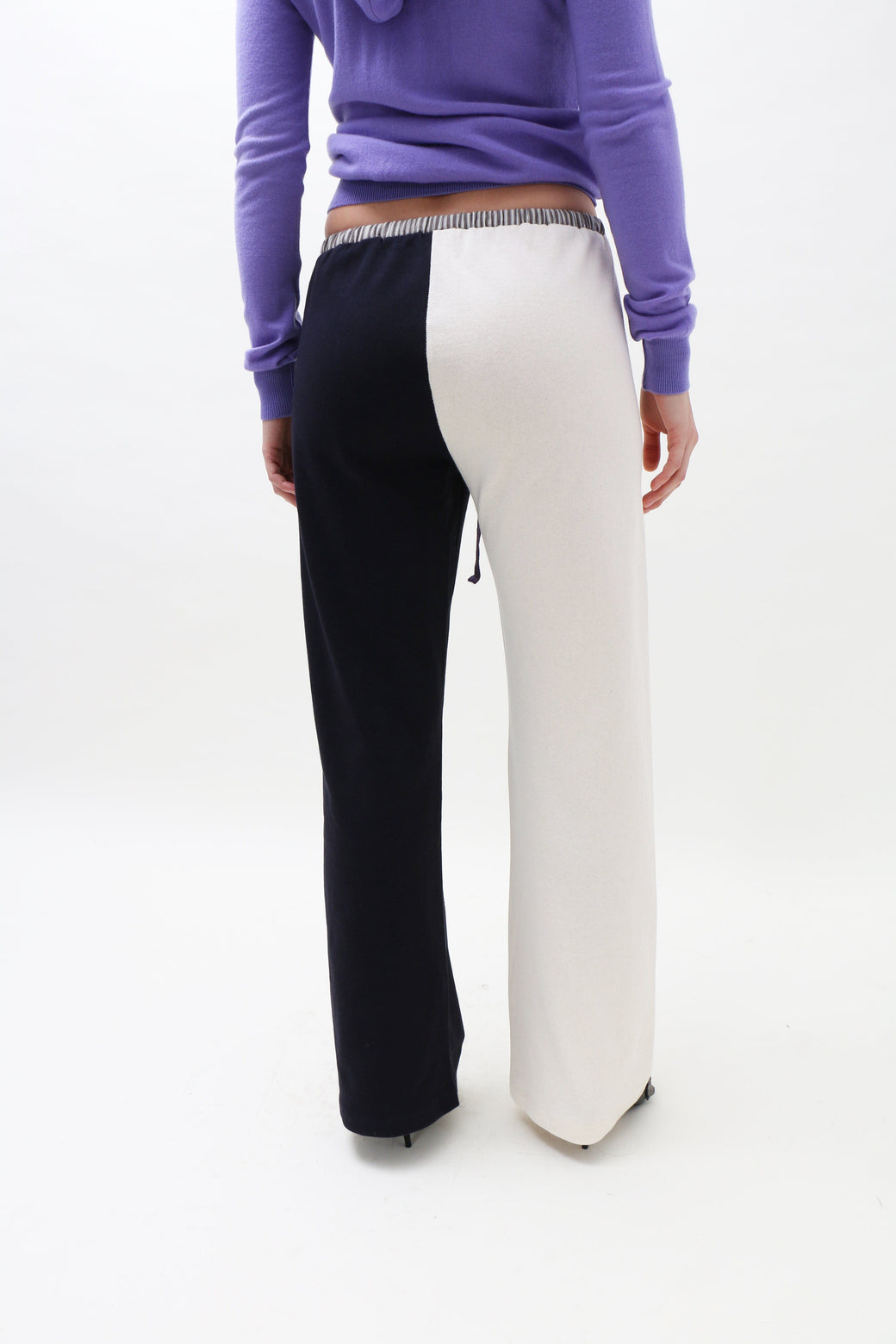 Cotton rib knit drawstring pants with split-tone legs in soft ivory and deep navy, finished with a striped waistband.