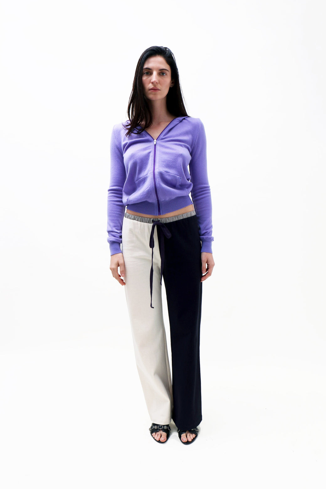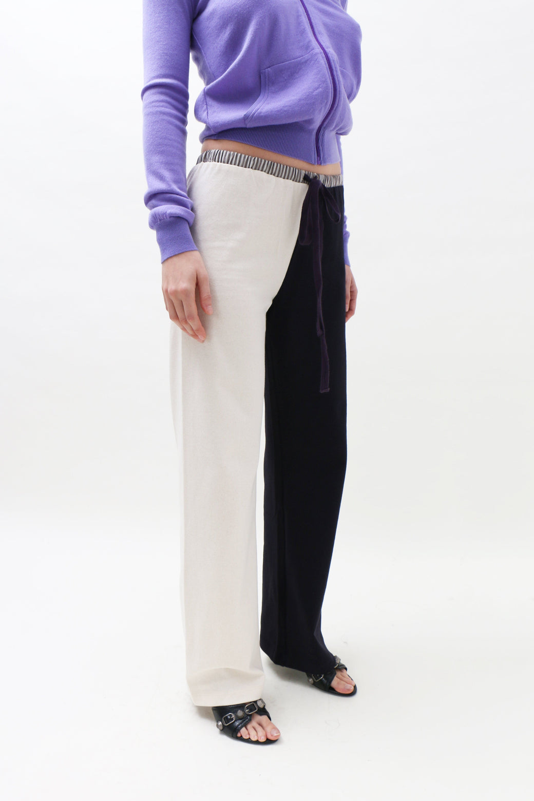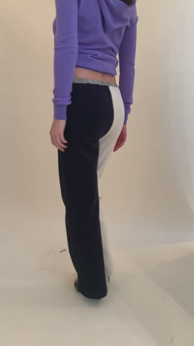 Cotton rib knit drawstring pants with split-tone legs in soft ivory and deep navy, finished with a striped waistband.