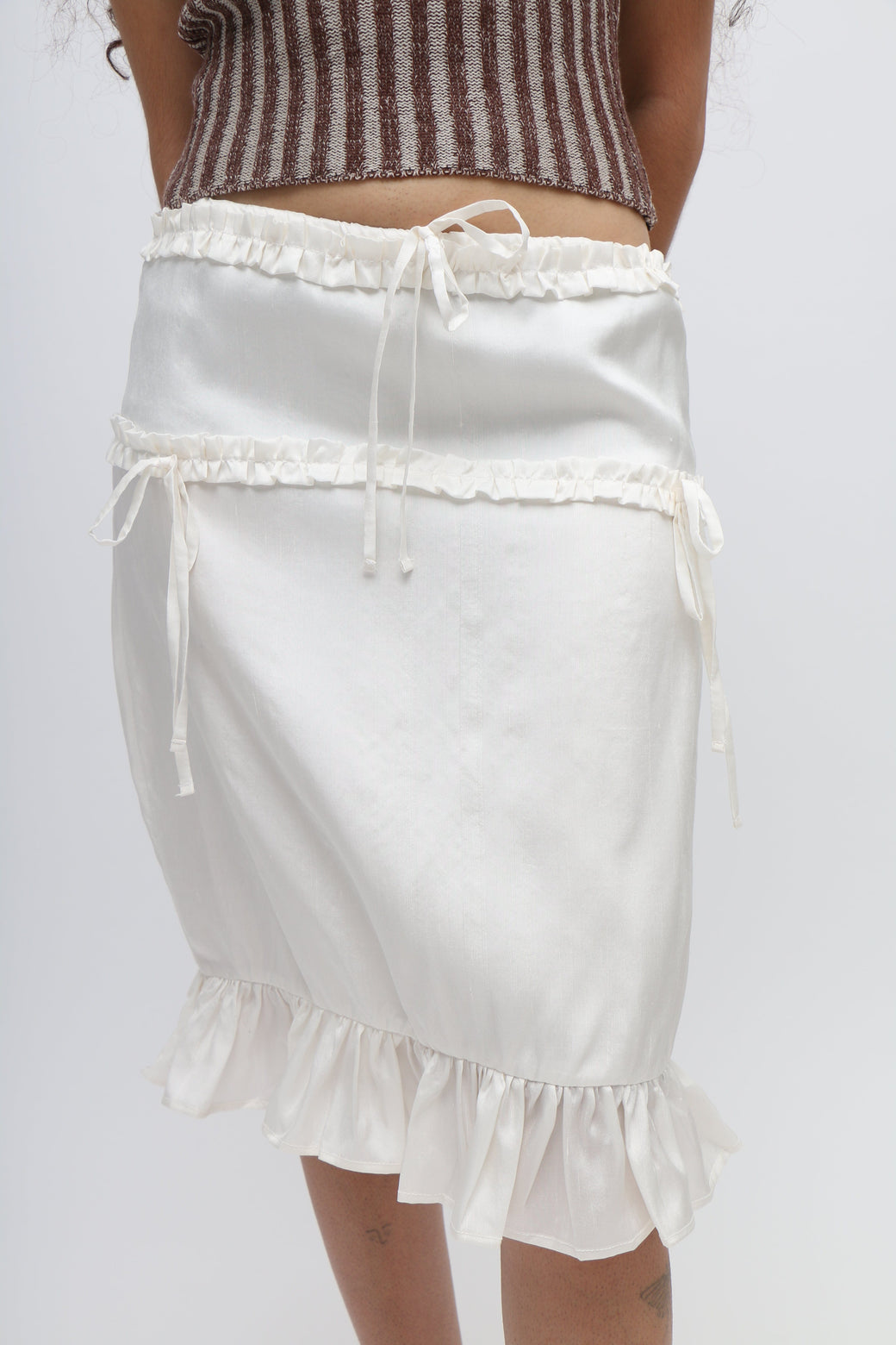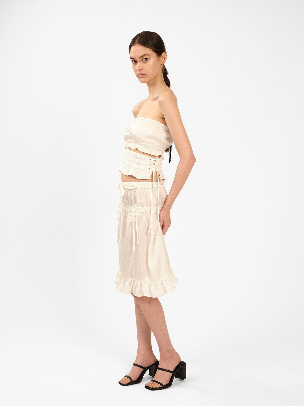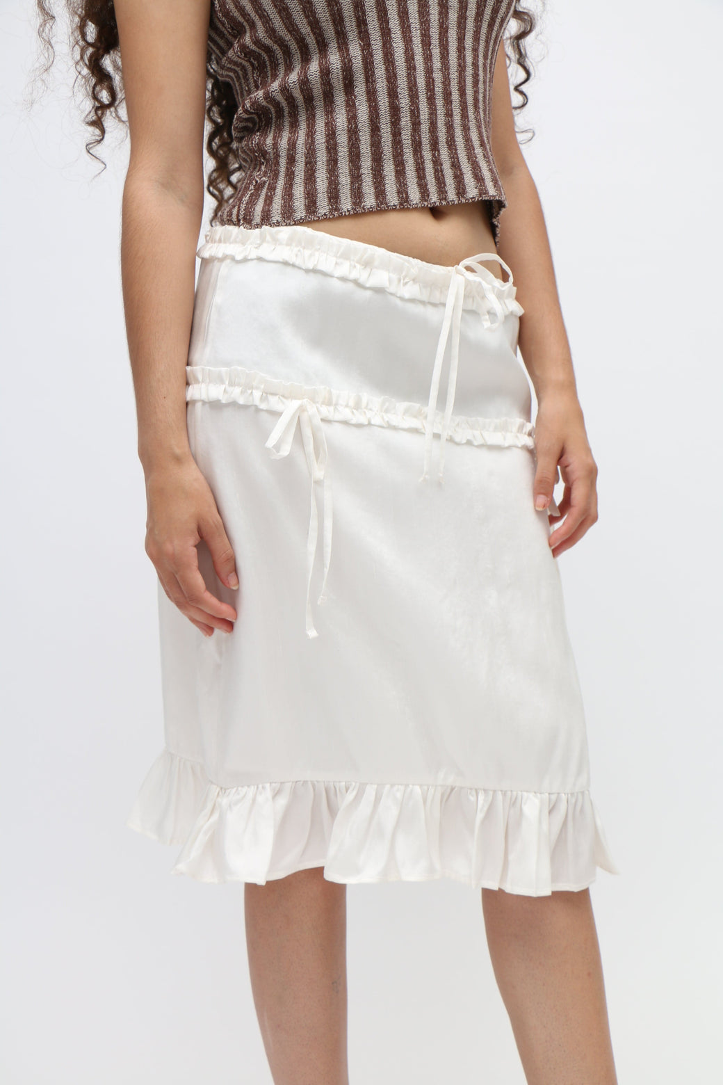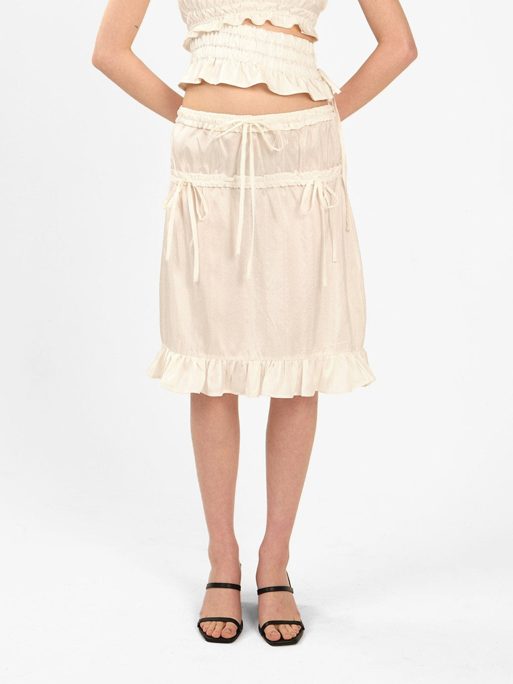 The ivory ruffle silk skirt is crafted from semi-sheer silk dupion. It features ruffles along the top and bottom, with ruched piping and drawstrings. The skirt has a low waist and a midi length.