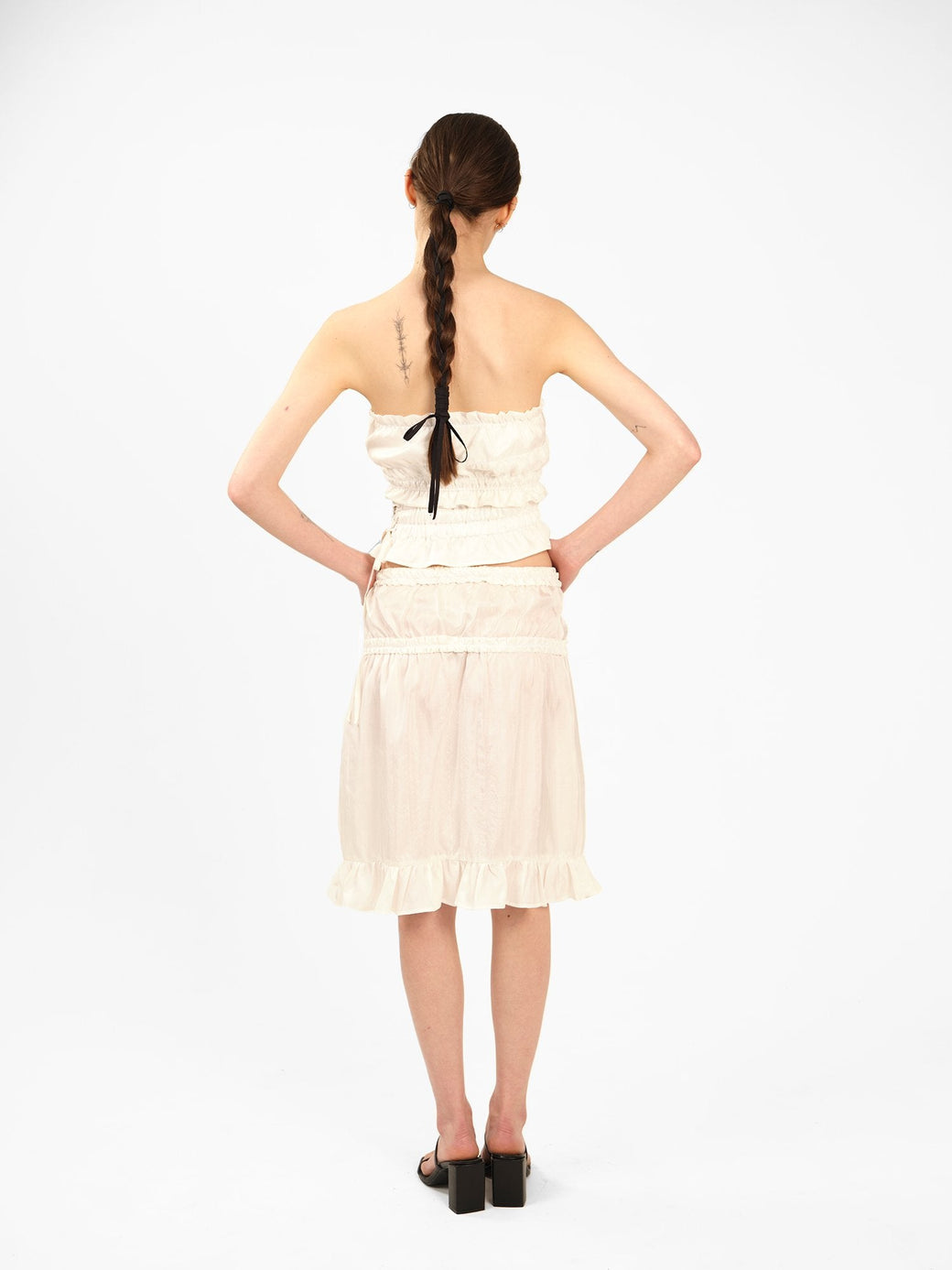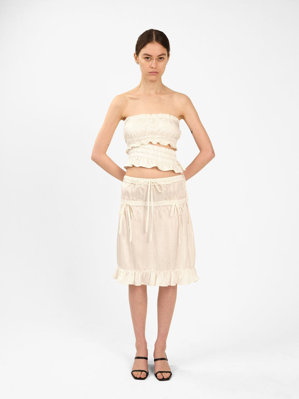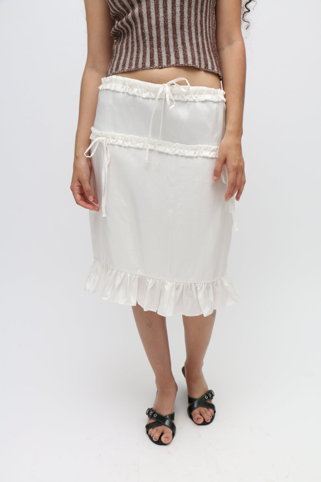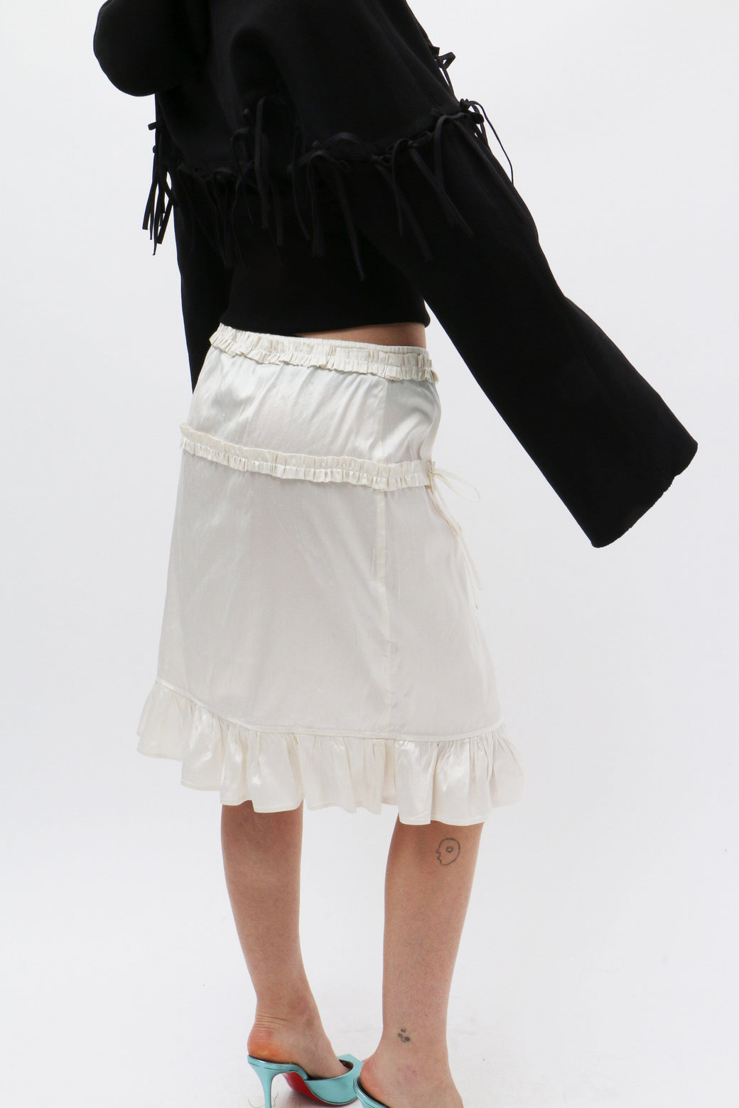 The ivory ruffle silk skirt is crafted from semi-sheer silk dupion. It features ruffles along the top and bottom, with ruched piping and drawstrings. The skirt has a low waist and a midi length.