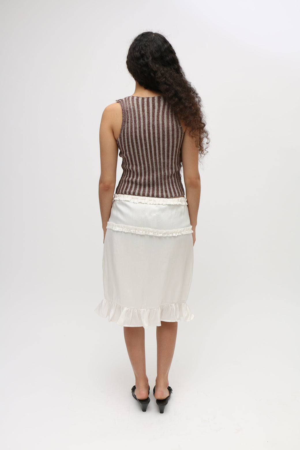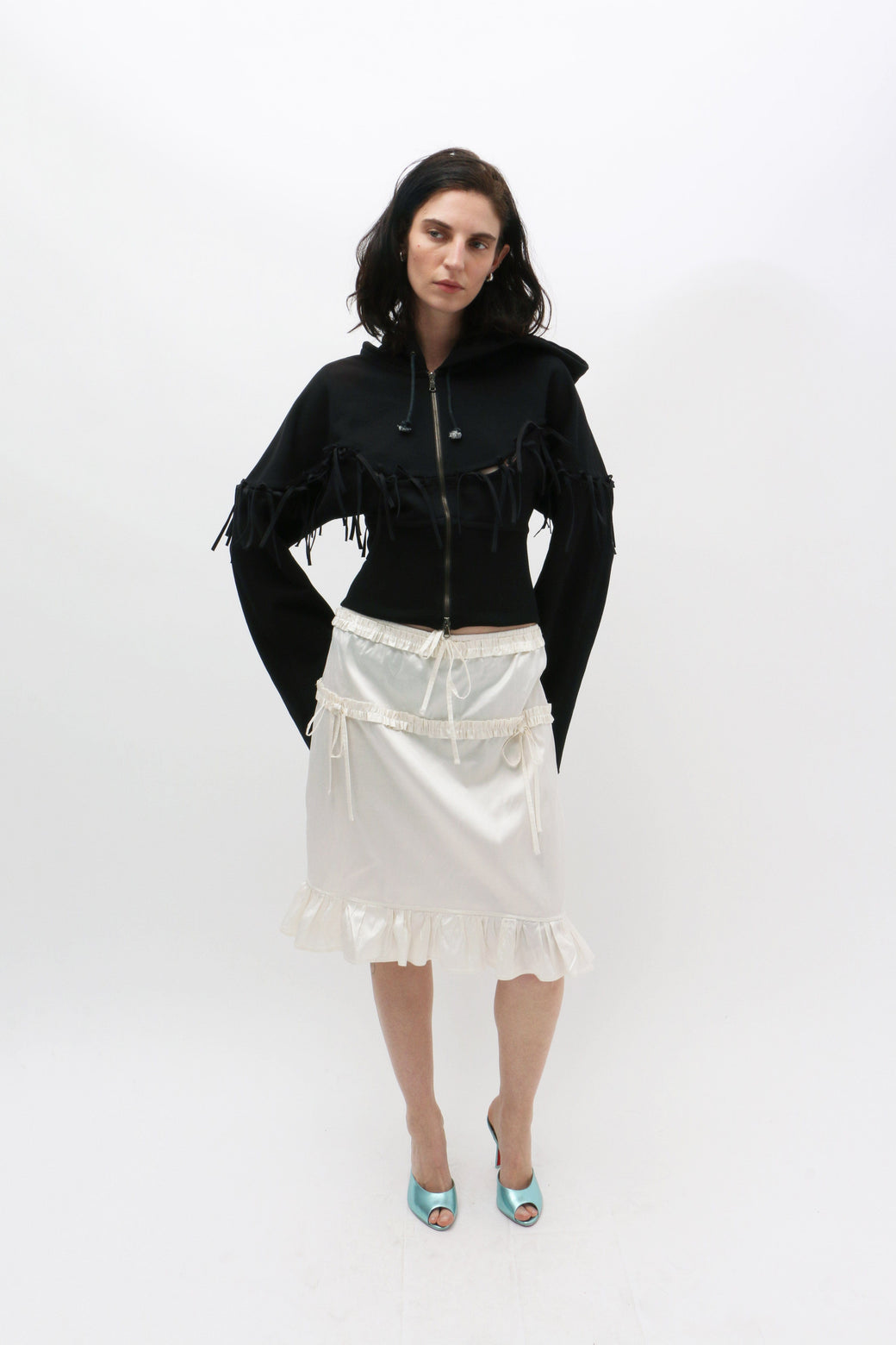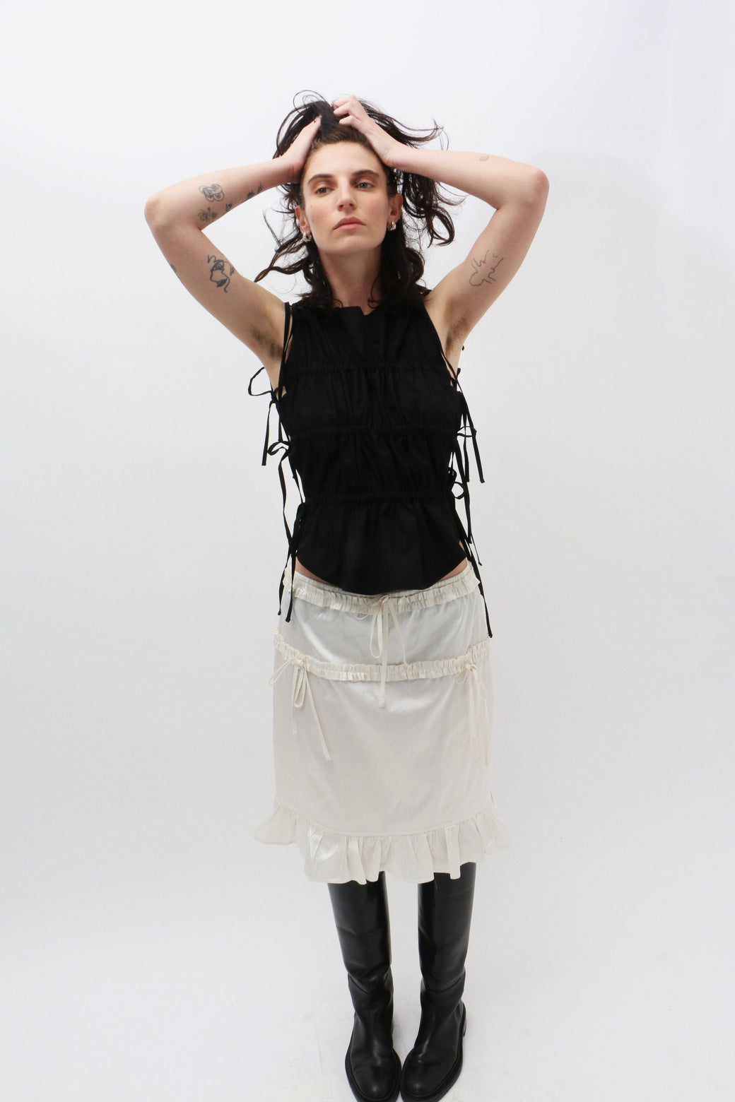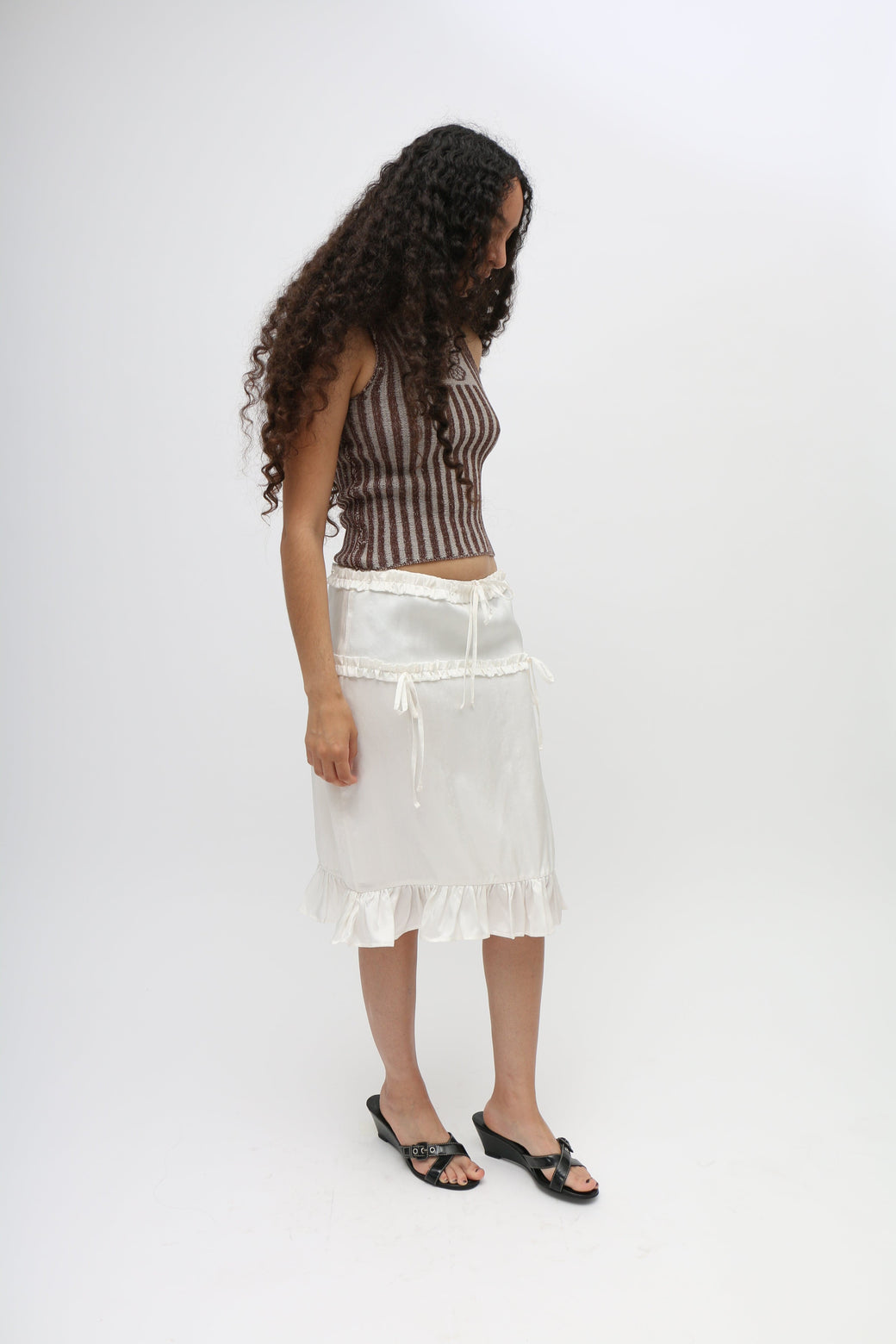 The ivory ruffle silk skirt is crafted from semi-sheer silk dupion. It features ruffles along the top and bottom, with ruched piping and drawstrings. The skirt has a low waist and a midi length.
