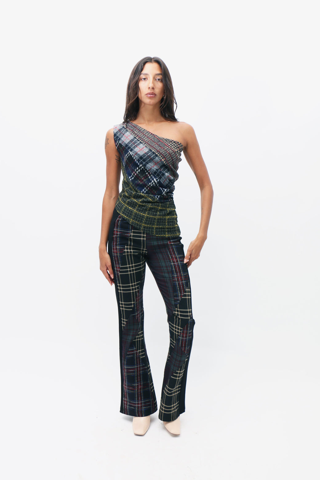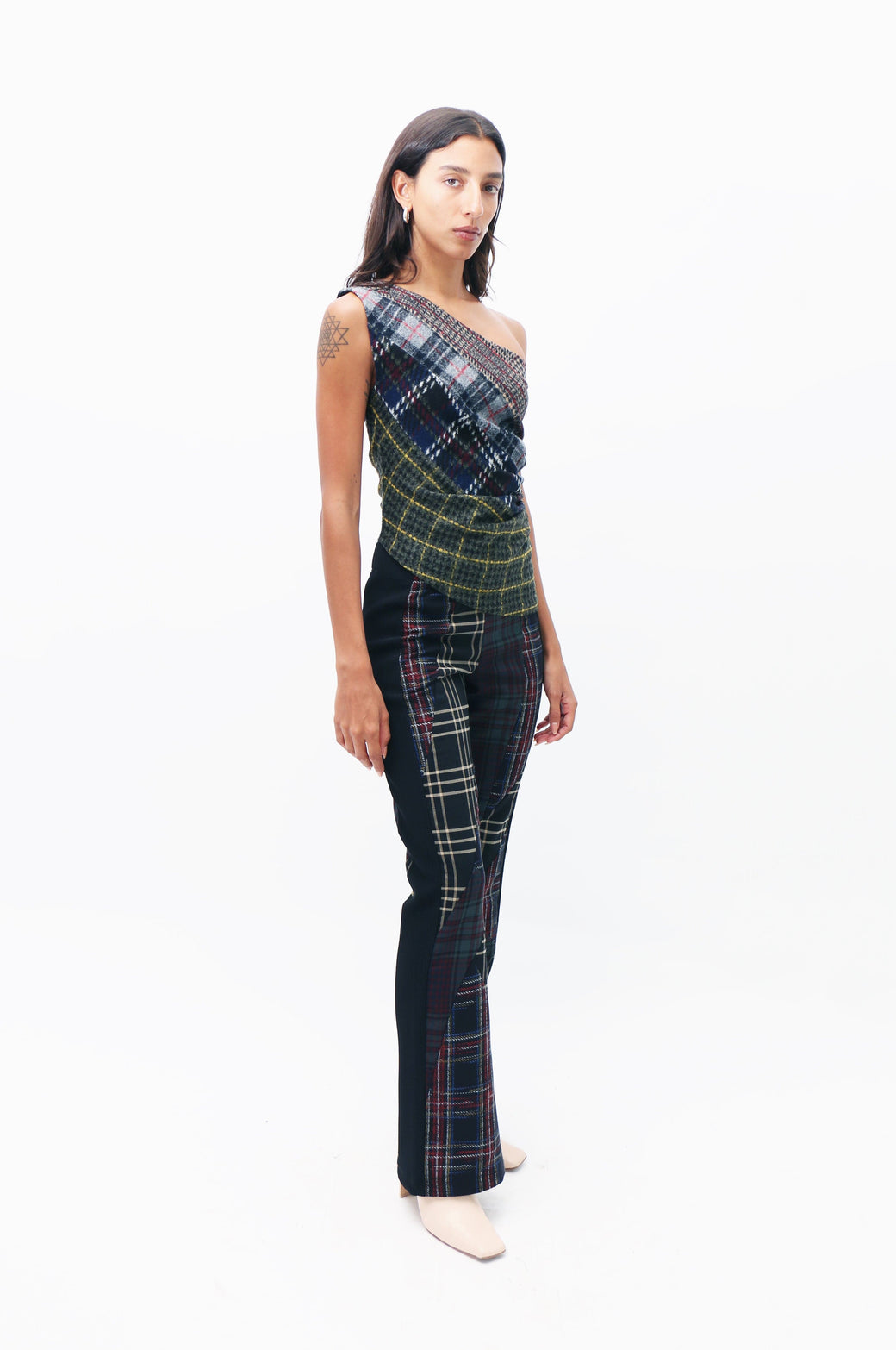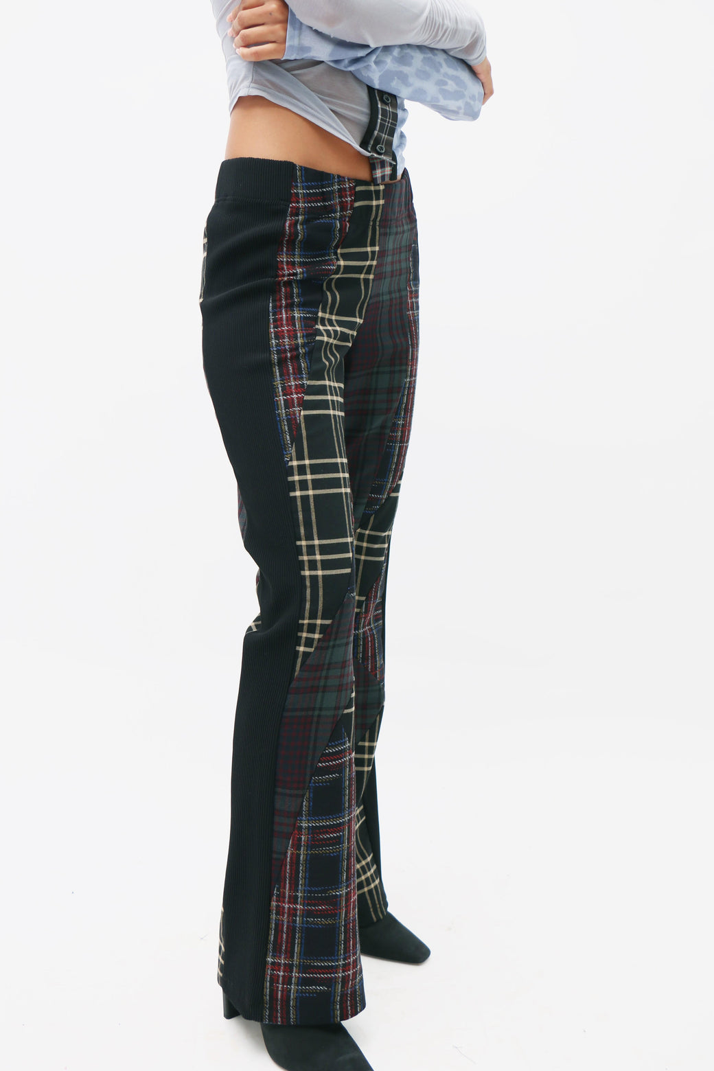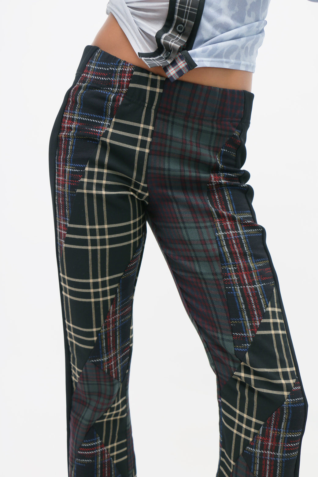 Crafted from deadstock materials and vintage kilts, each pair of trousers is unique due to the variation in tartan pattern placement, while the colorway remains the same.