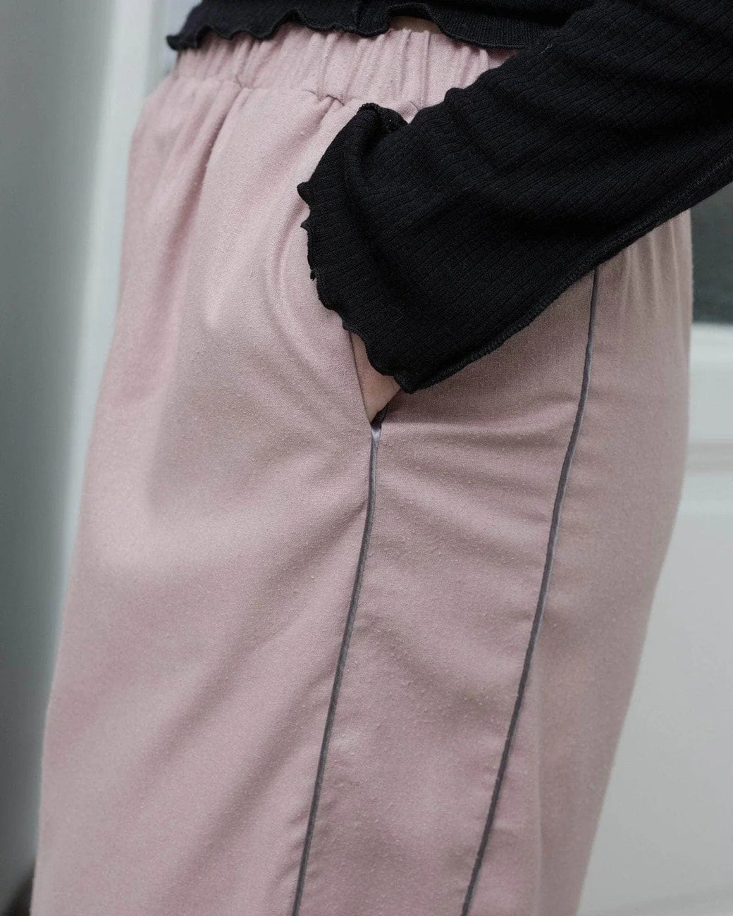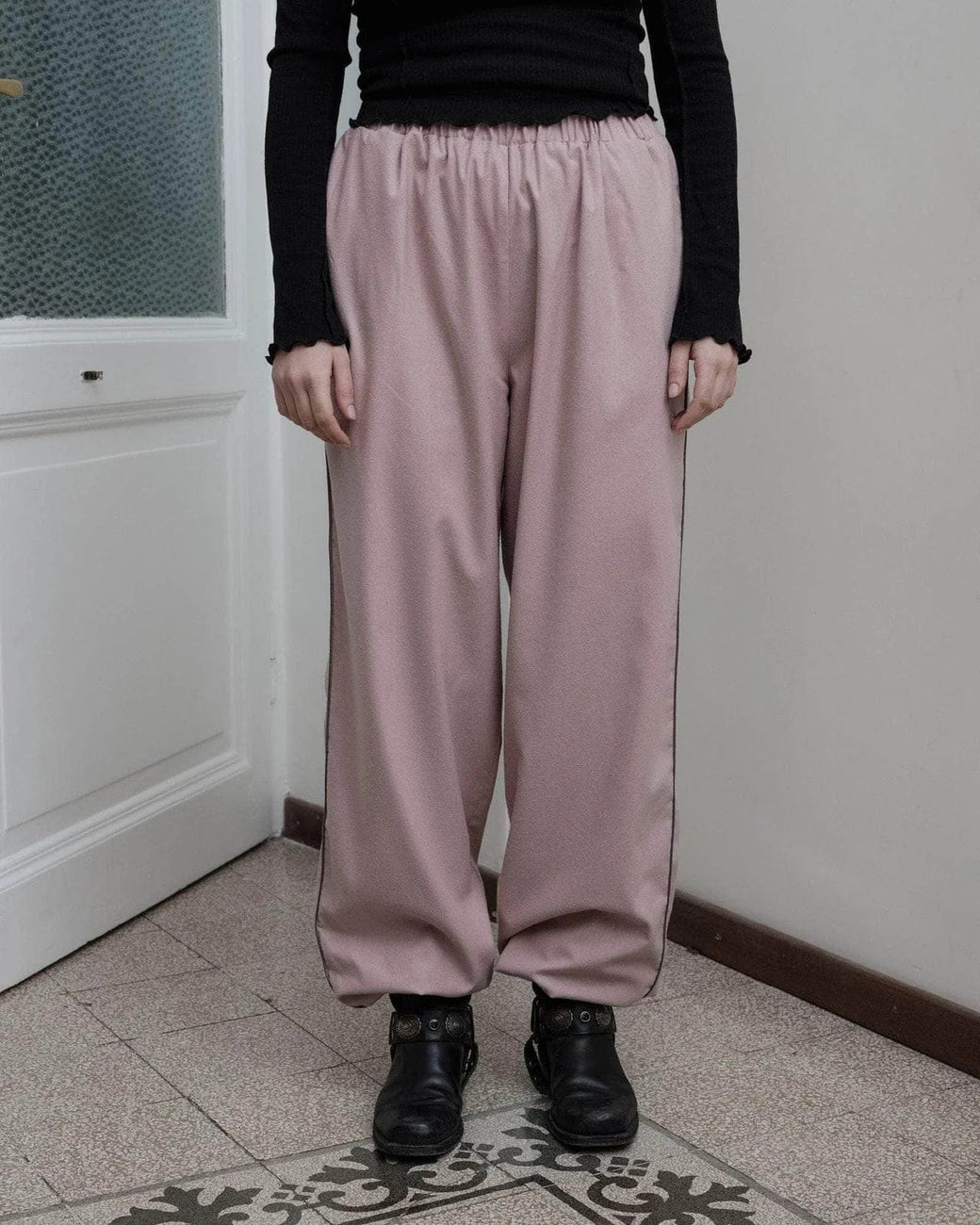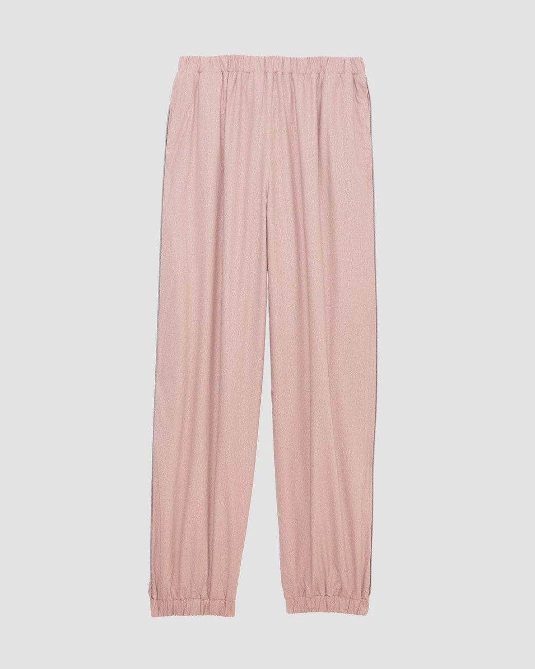 Wild silk pant in a dusty nude pink, with elastic waistband and cuffs at hem, sporty contrast piping along leg and inlay side pockets.