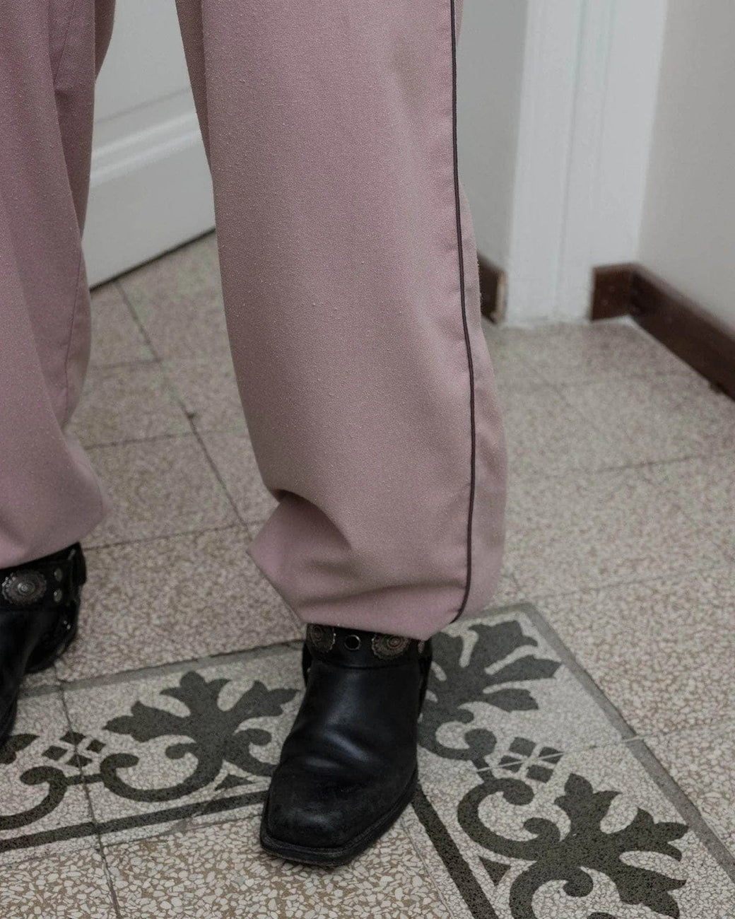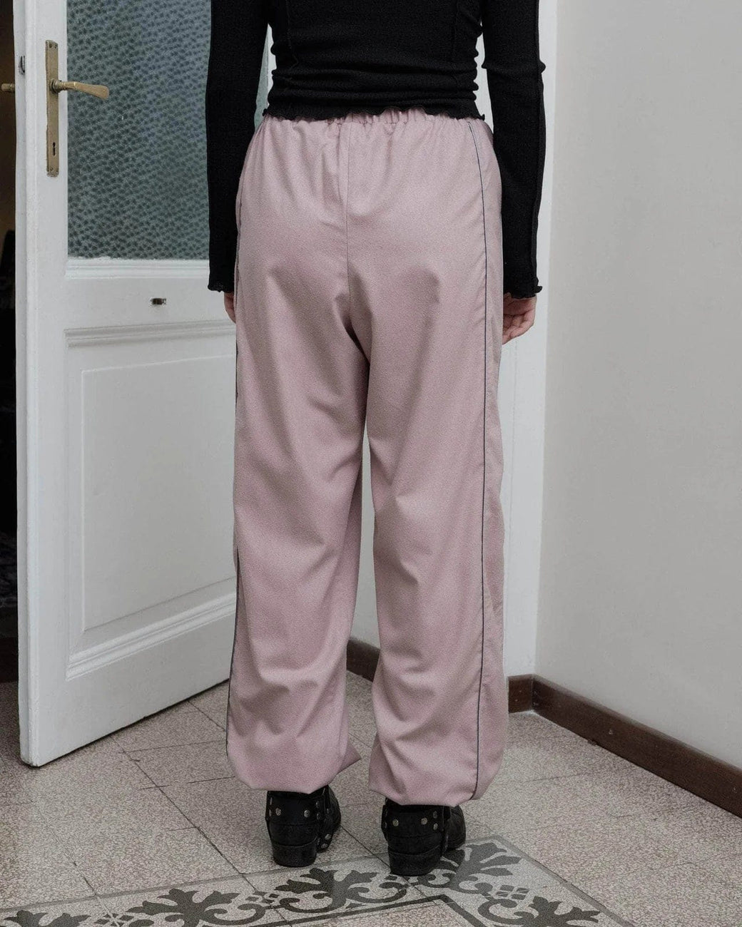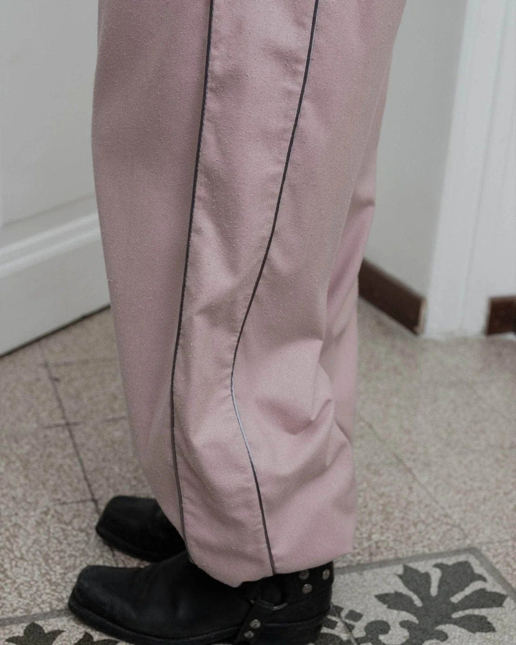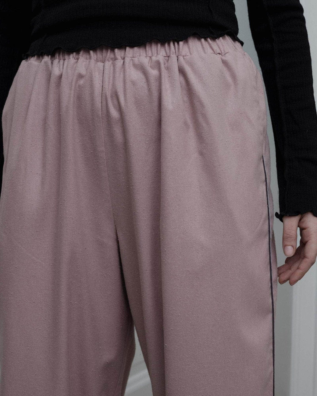 Wild silk pant in a dusty nude pink, with elastic waistband and cuffs at hem, sporty contrast piping along leg and inlay side pockets.