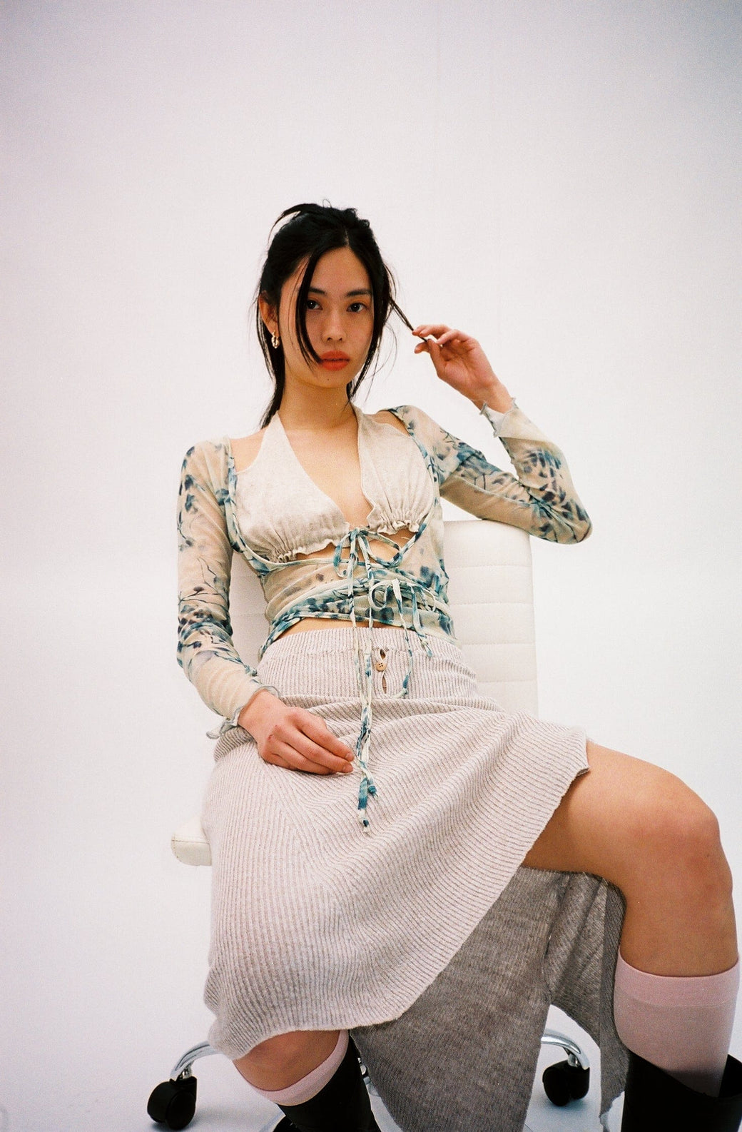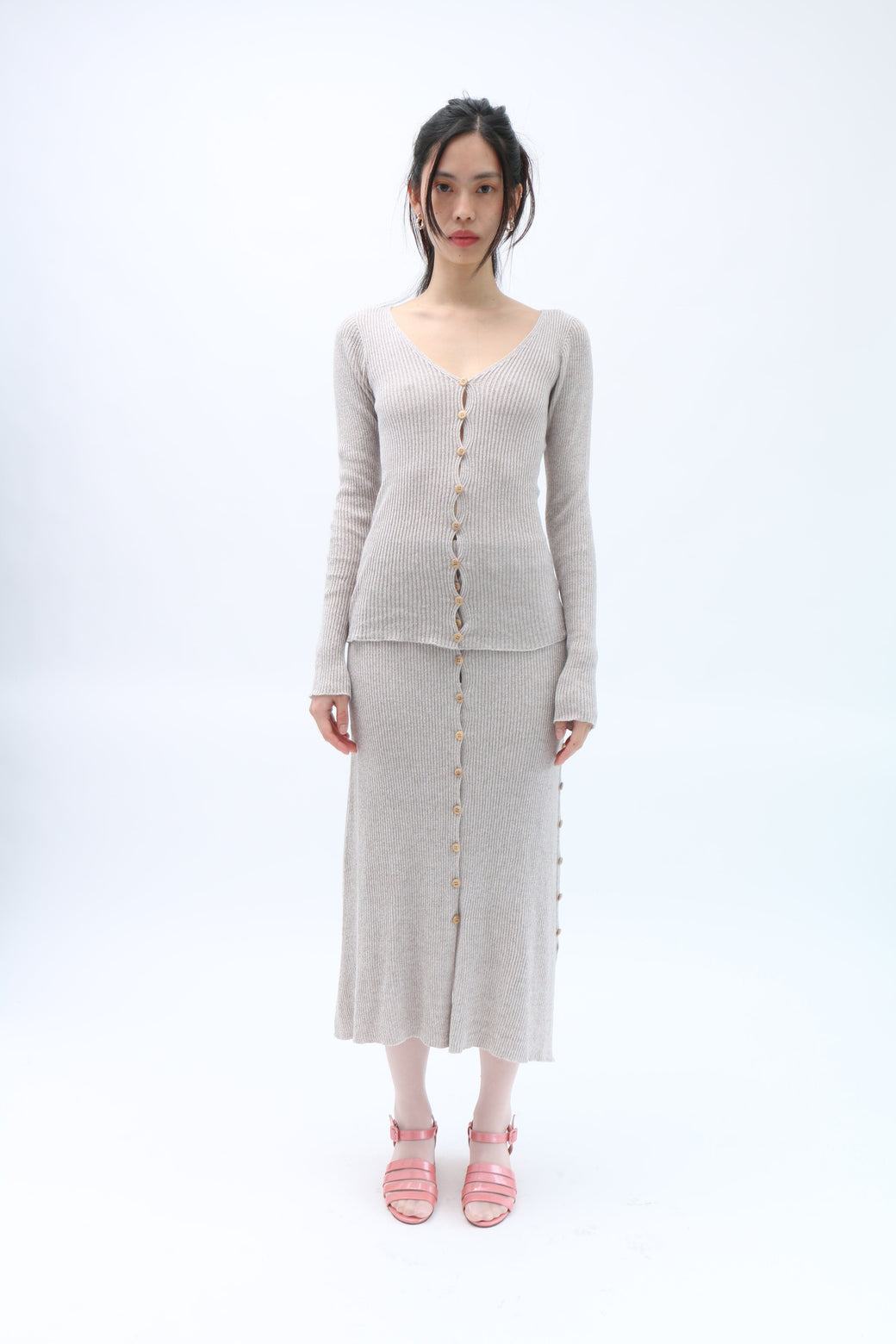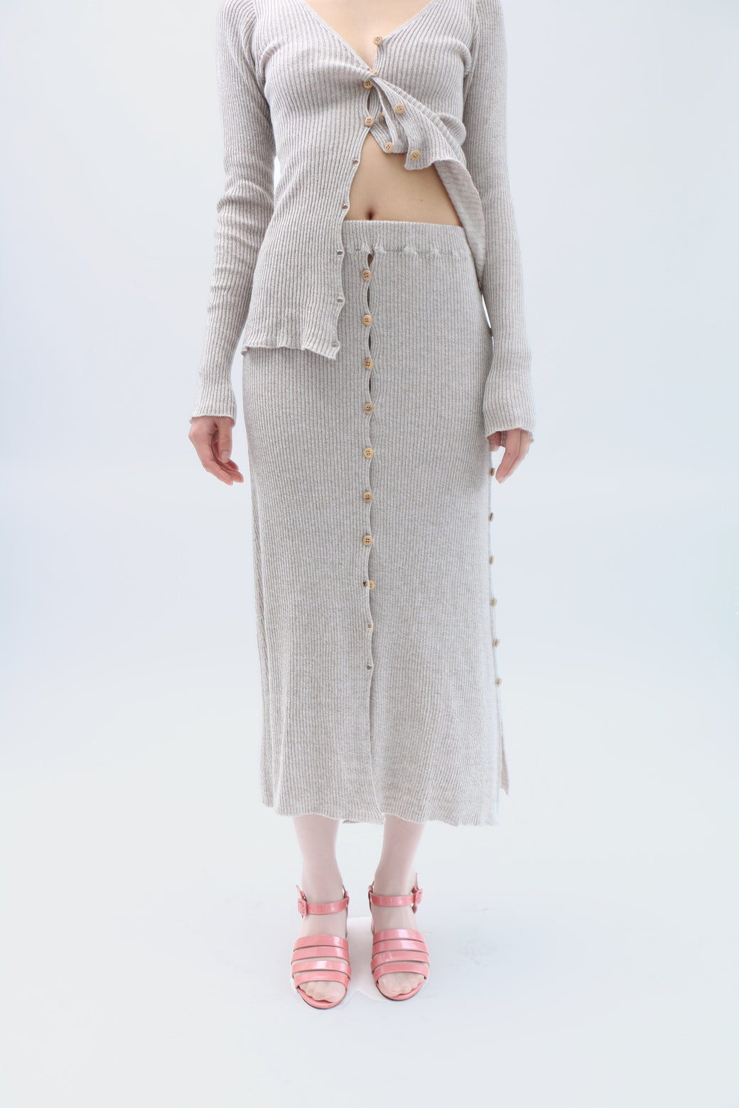 Linen rib skirt, slightly flared at hem. Elasticized waist. Buttons positioned throughout the piece, can be manipulated to be worn as you wish. Worn with the matching Loulou Cardigan. Made in France